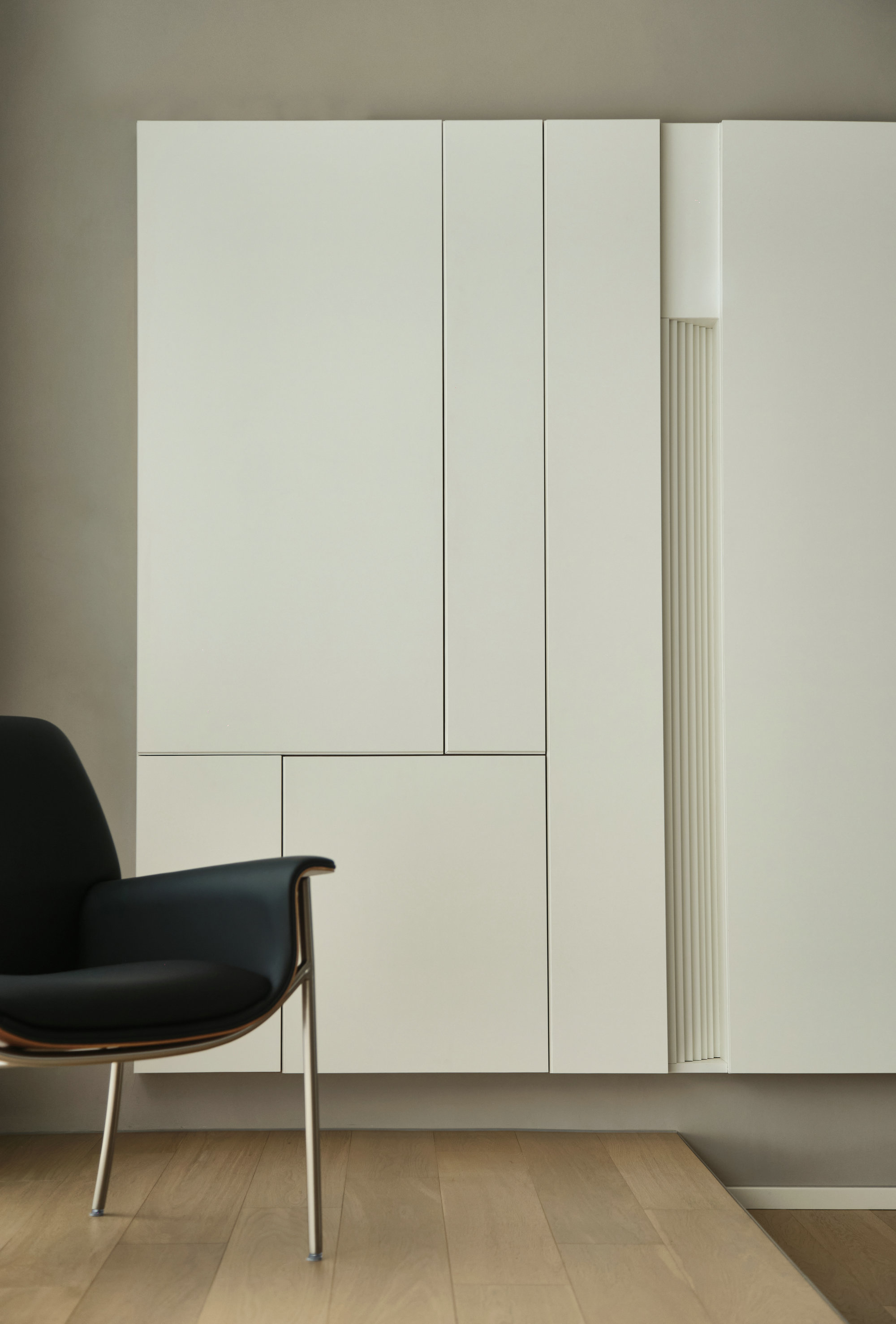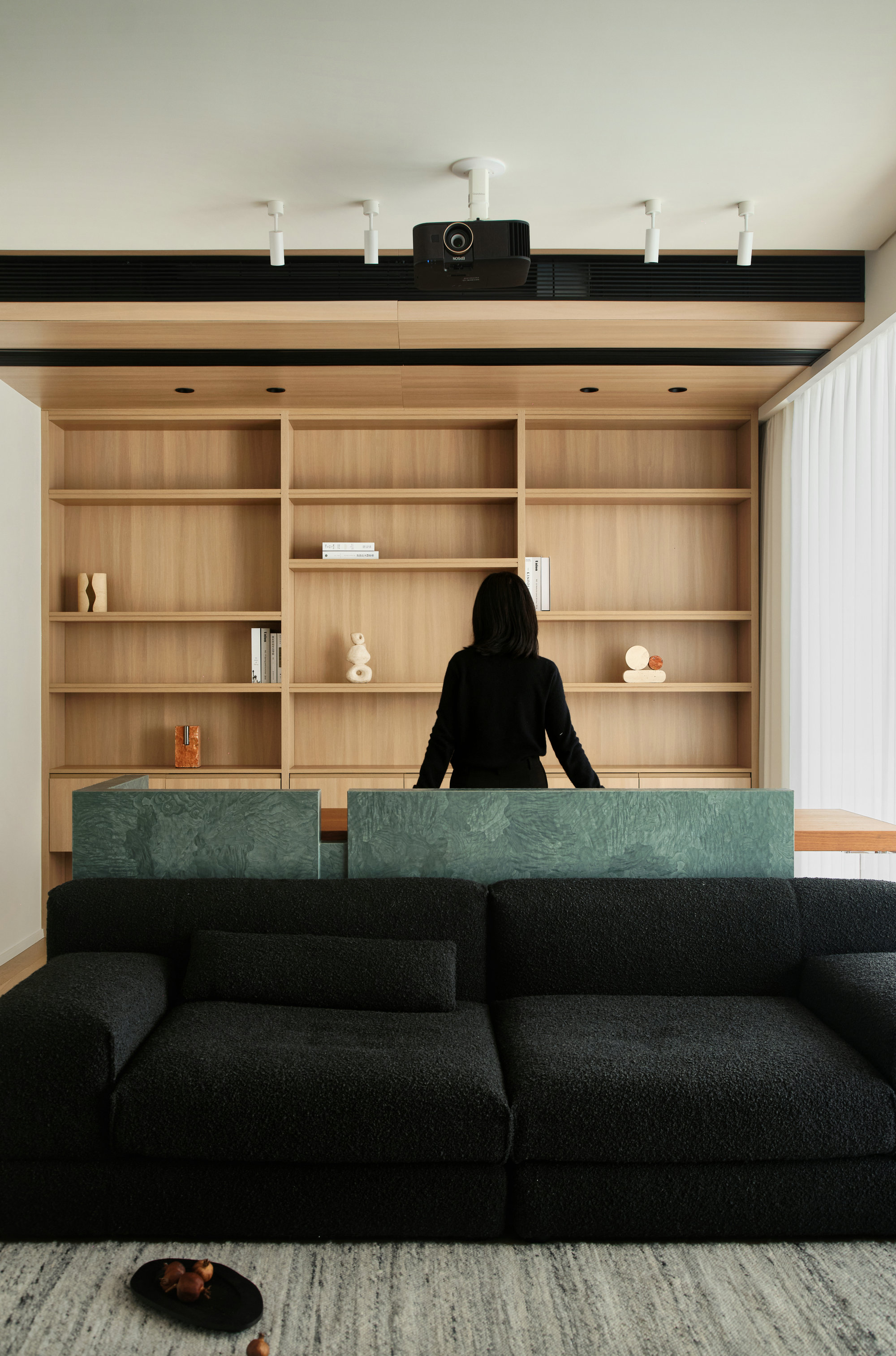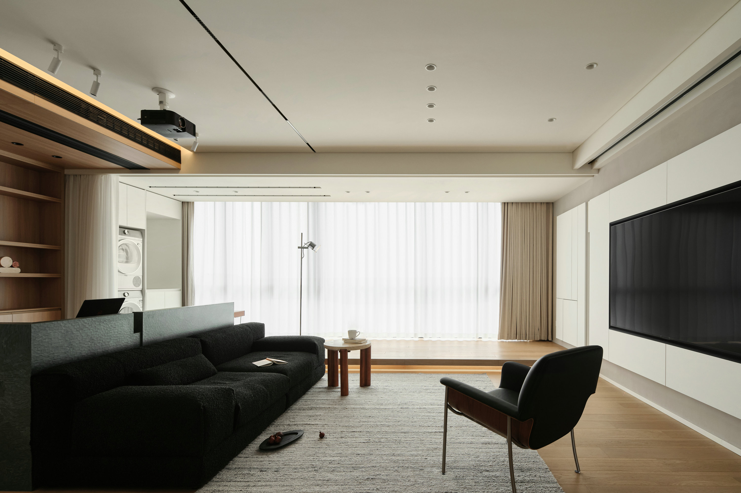 “收纳延伸式电视墙”,打破了传统意义上“电视背景墙”只是一个独立面的概念,而是将其视为一个连续的、整体的画面。