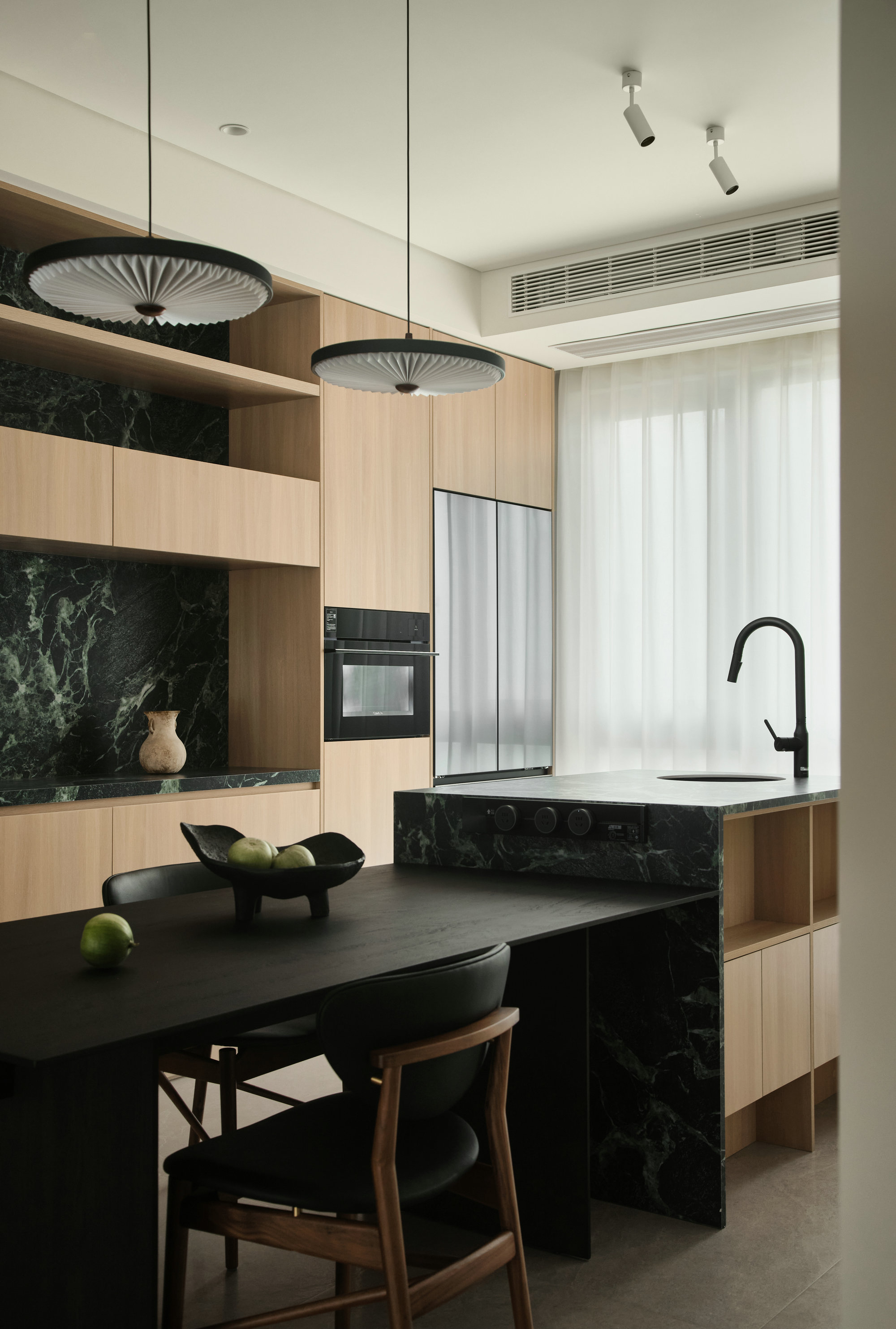 岛台+餐桌的好处在于同一空间,家人感受到彼此的陪伴,随时可以进行眼神或语言的交流,减少了孤独感。工作累了,转身就能切换到休闲模式,极大地提升了生活的连贯性和舒适度。