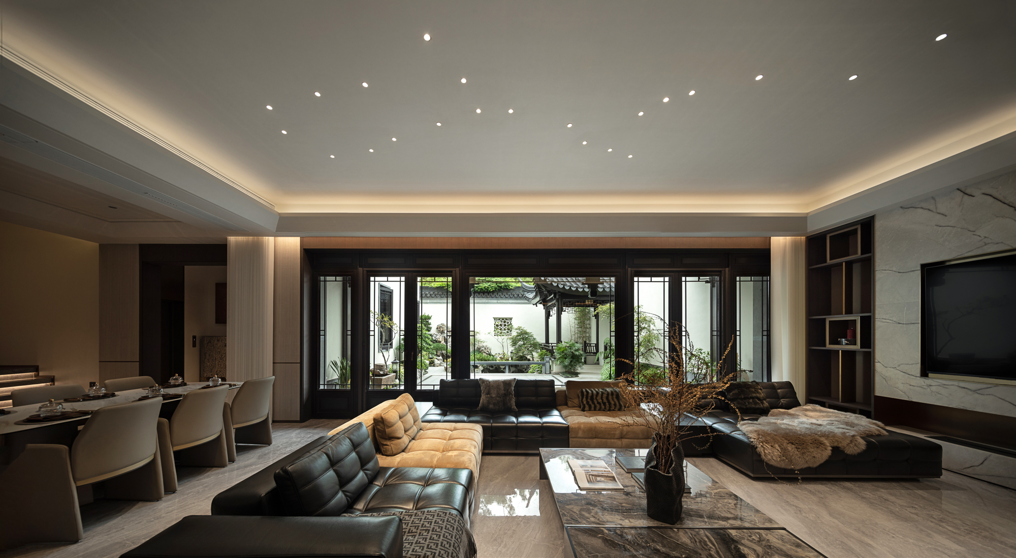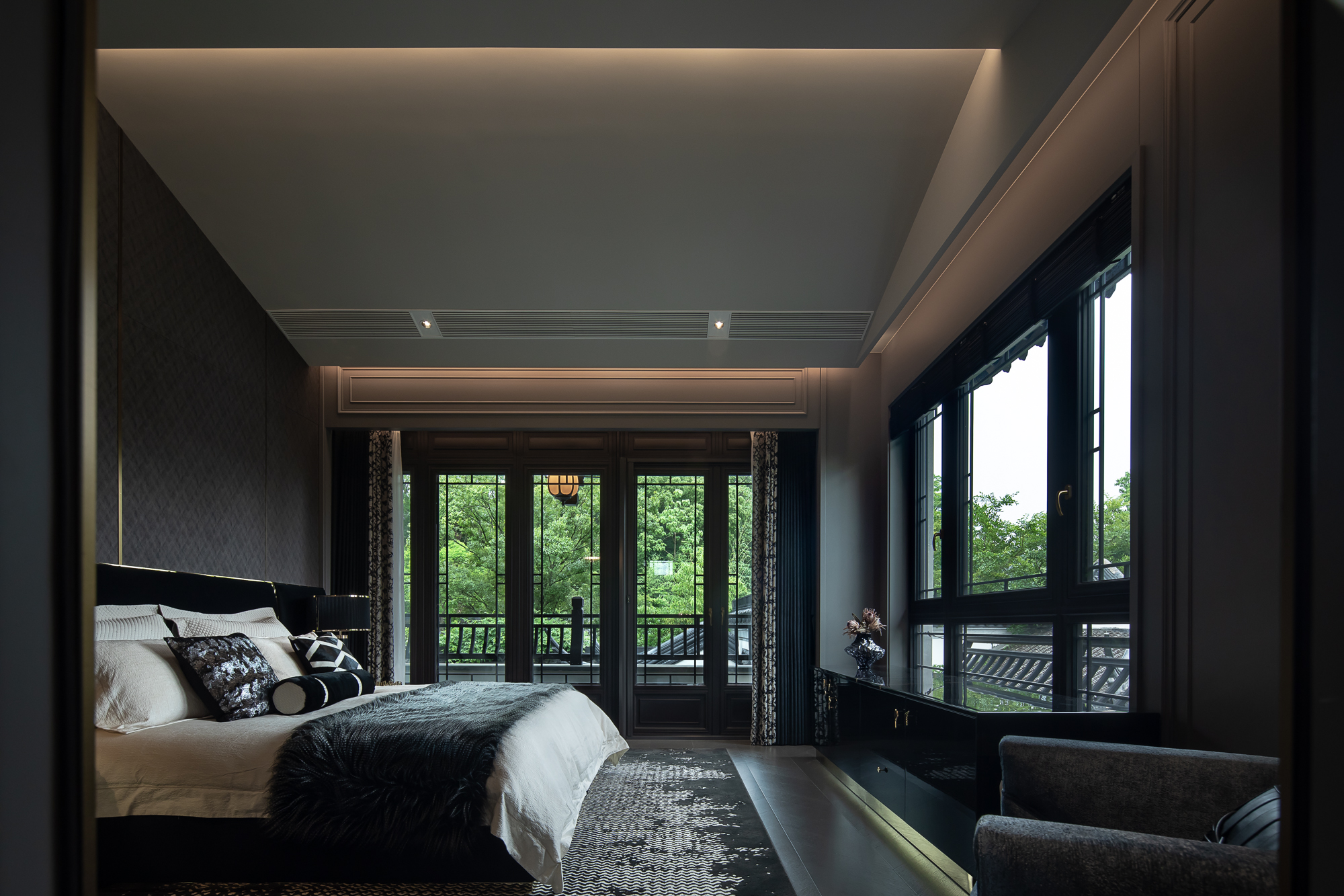 设计选材:在色彩与材质的搭配上,巧融中式精髓与现代审美,深色基调与金色辉泽交织,打造出既奢华又不失温馨的空间氛围。这些富含传统美感的色调,不仅强化了新东方与新亚洲风格的内核,也与室外中式园林的景致相映衬,实现了内外空间的和谐统一。