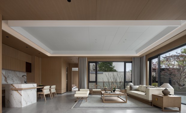 从住宅北侧的一口迈入,一楼设计的巧妙之处便悄然显现,顶面如意纹简化了繁琐的中式元素,又点缀了空间中应该呈现的东方意境。 -