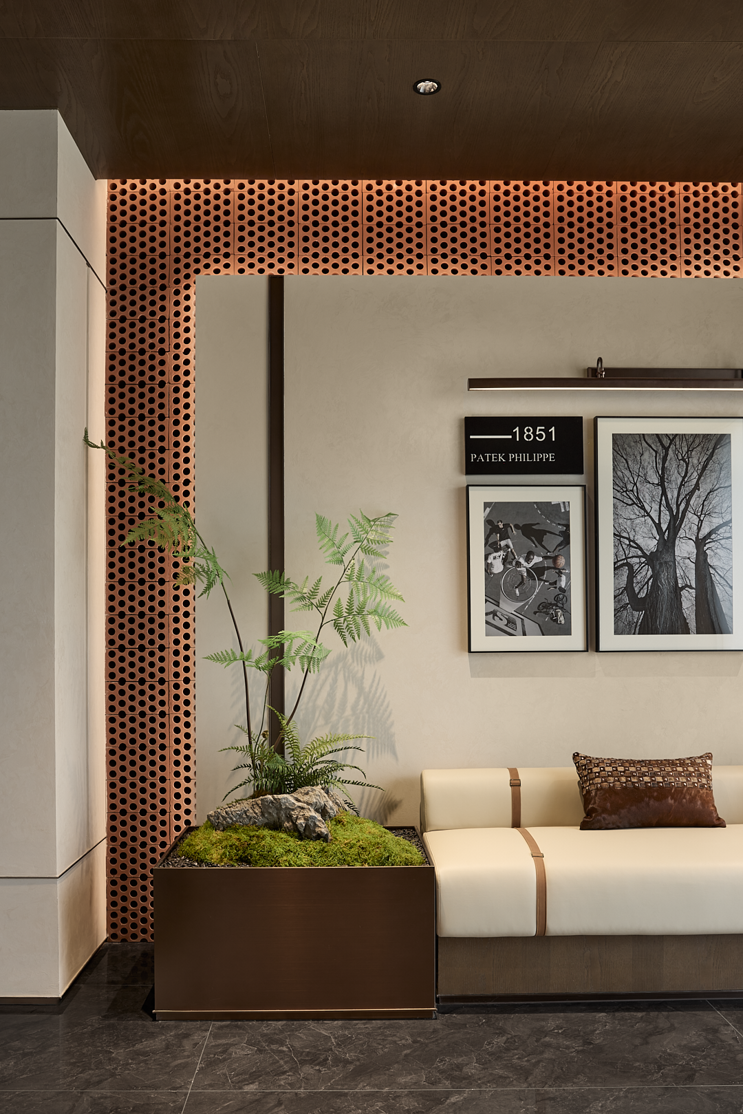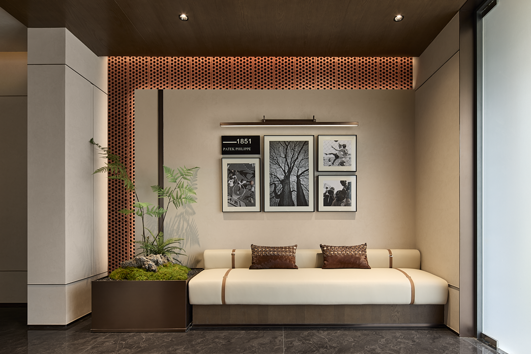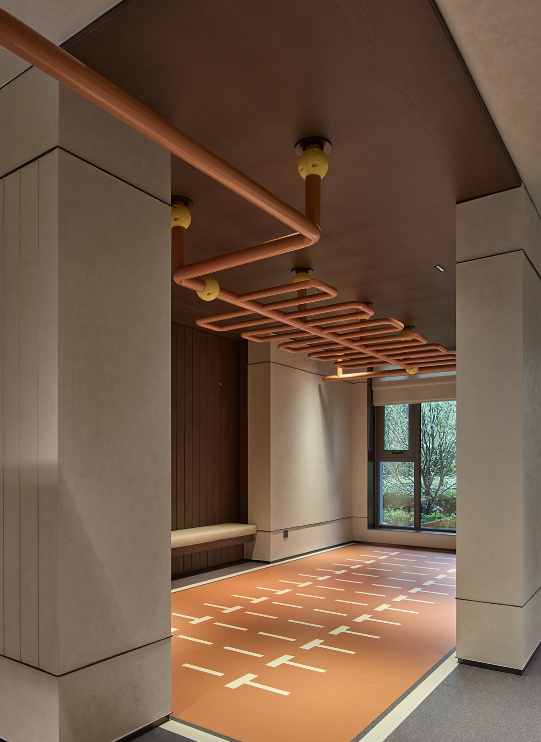 设计选材:空间主要材料包含石材、透光云石、木饰面、水波纹玻璃、金属、陶砖等;选材兼顾全龄适配与风格表达:以石材、陶砖材质提高空间调性,透光云石局部点睛;优选环保达标材料,石材陶砖做防滑处理、磨圆角,保障全龄安全;耐用材质减少损耗,环保用料践行可持续;水波纹玻璃增通透感,木饰面与陶砖显自然肌理,金属点缀精致,契合全龄共享的温润互动风格。