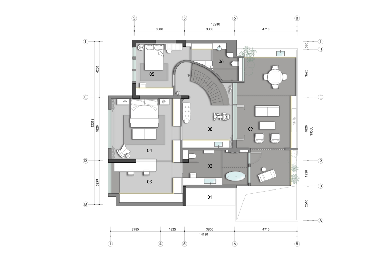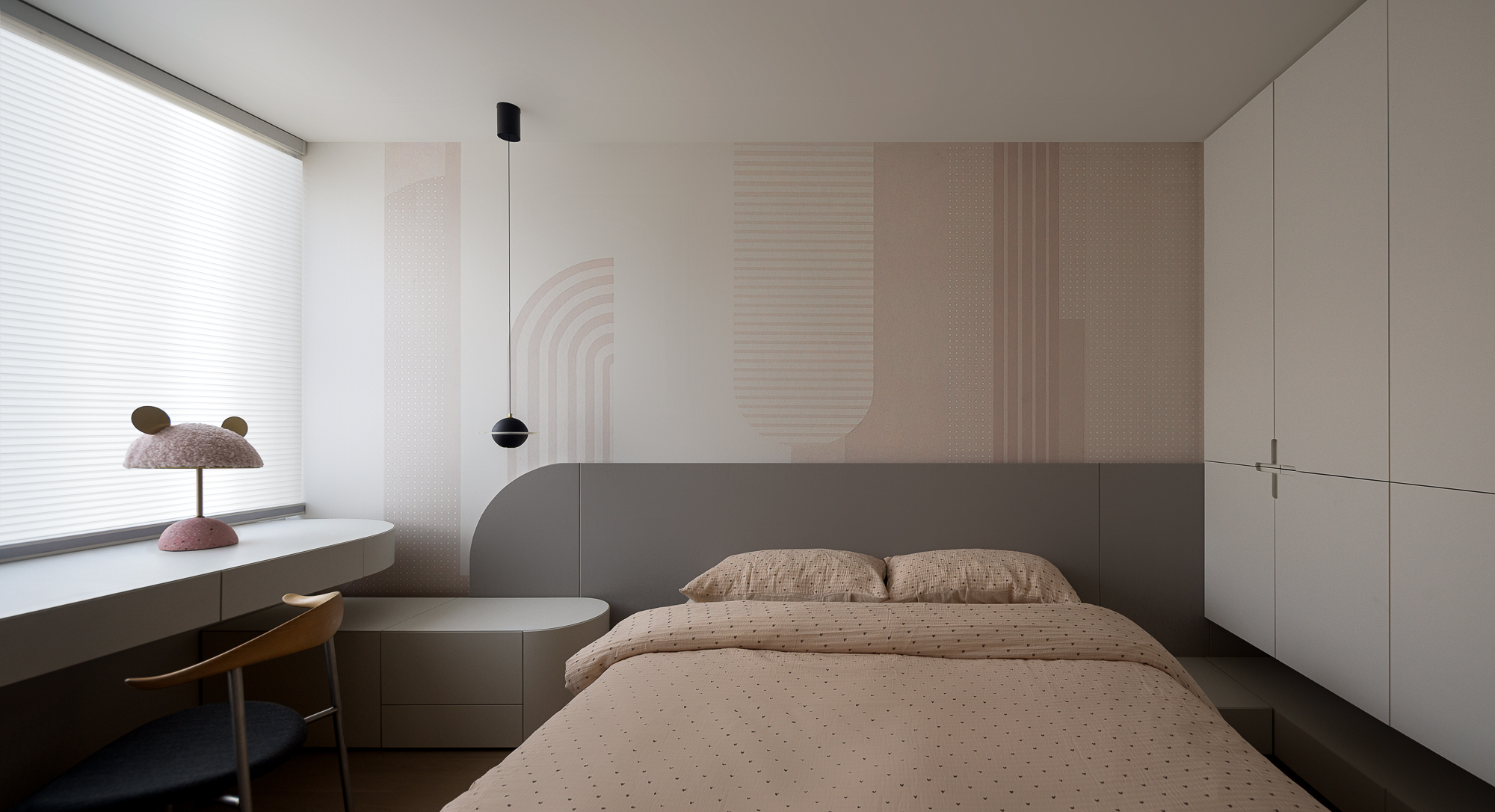 设计选材:浅灰实木的床头弧形墙,像一片低垂的云,和圆润的床头柜,圆润的写字台,错落有致地交叠一起,像是时光的涟漪,在晨光里一圈圈荡开。低饱和度的灰,低饱和度的粉橘,温柔且温暖。材质、造型、颜色有规律的重复,变化,把若大的空间化为一个大而不乱充满秩序的整体。