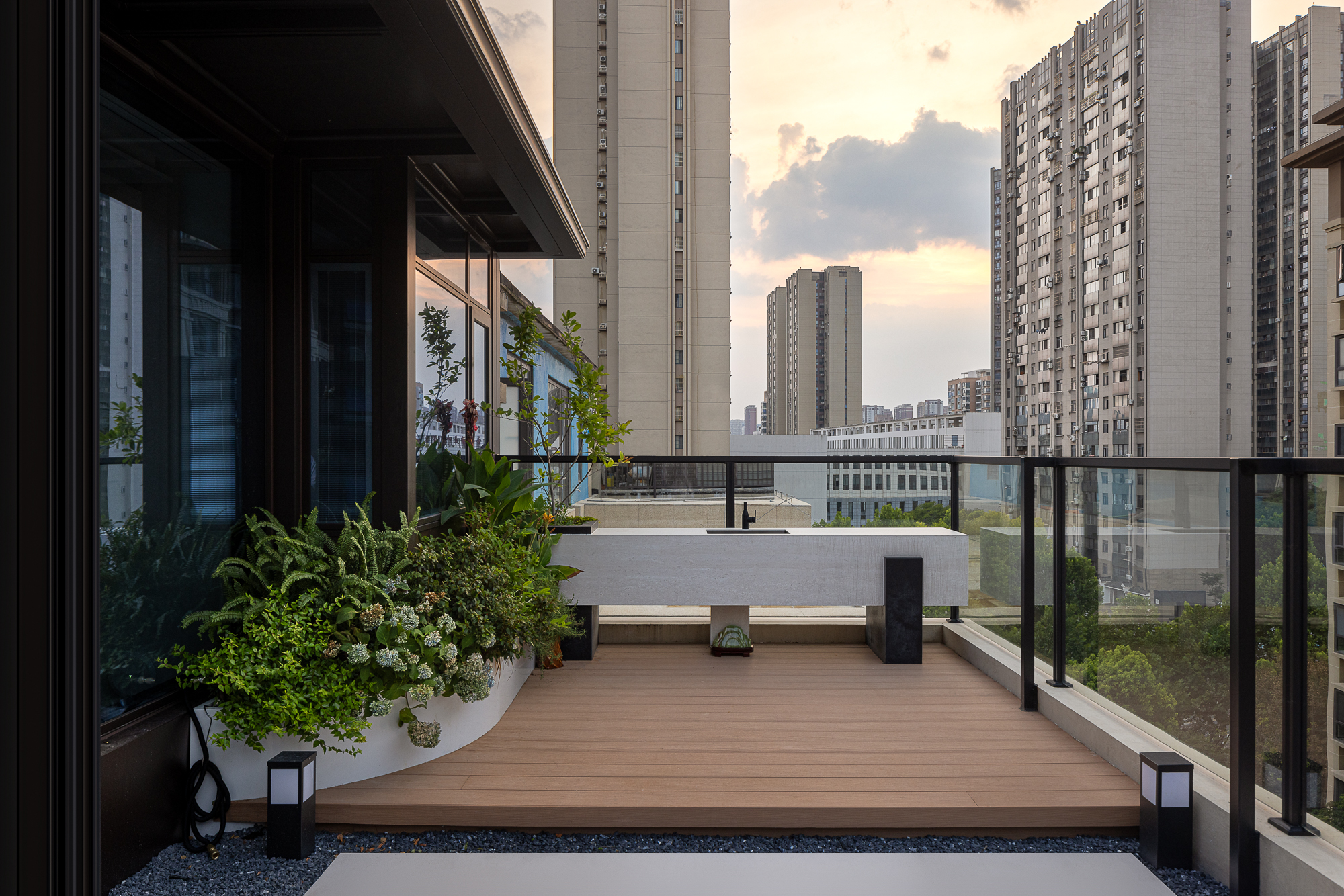 空间意境:钢筋森林里的绿洲,拥有一个顶楼复式的家重大意义之一就是喜欢露台吧。当暮色浸透花瓣,整座城市开始松动,那些被玻璃幕墙推远的云,忽然都栖在玫瑰的露珠里。