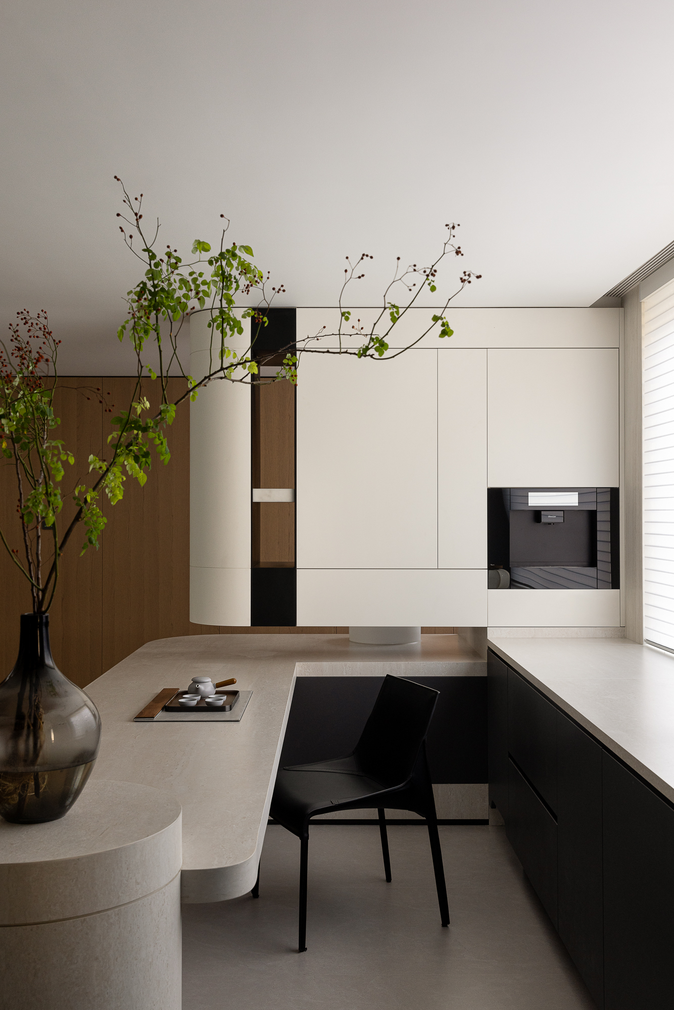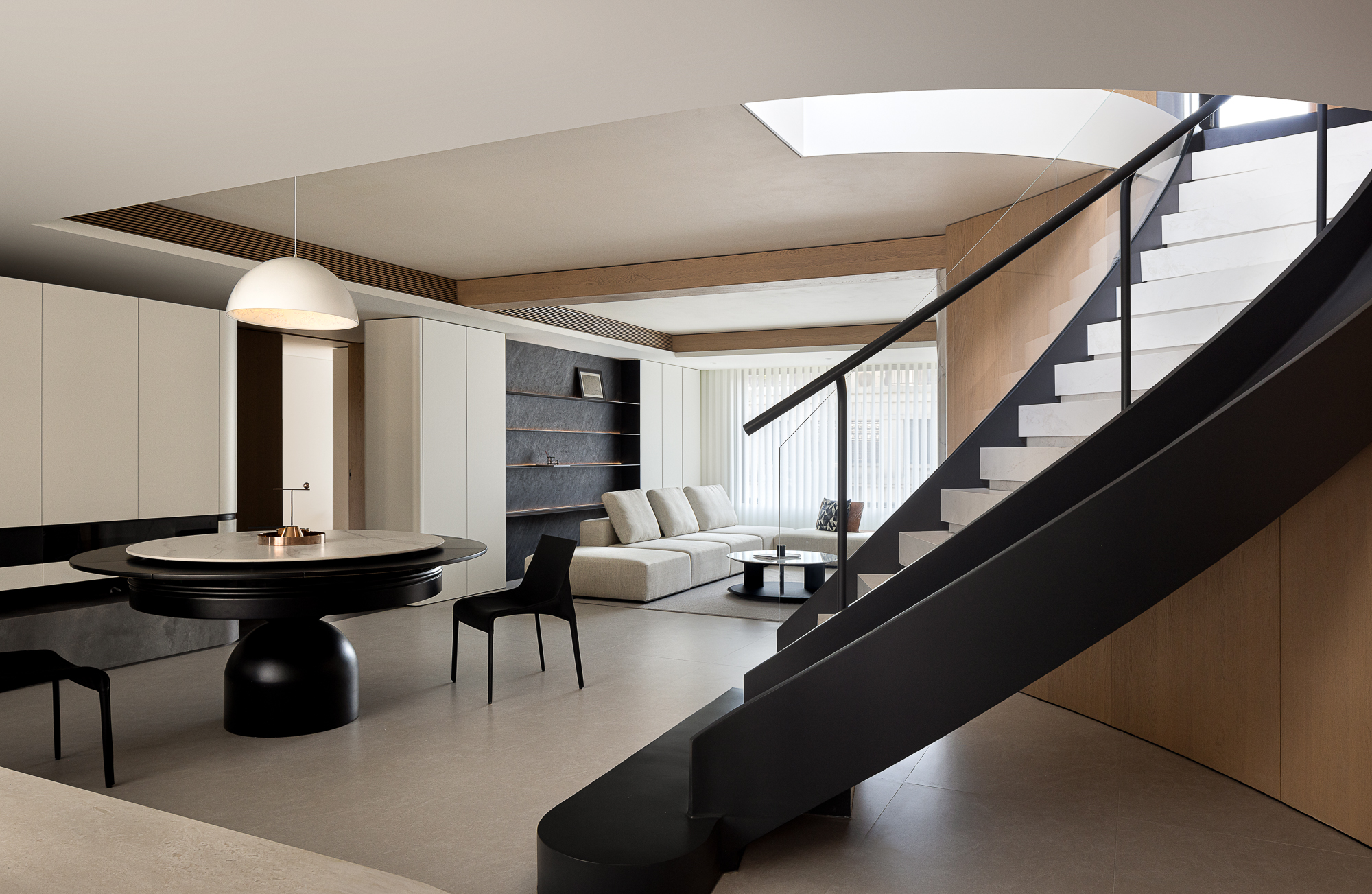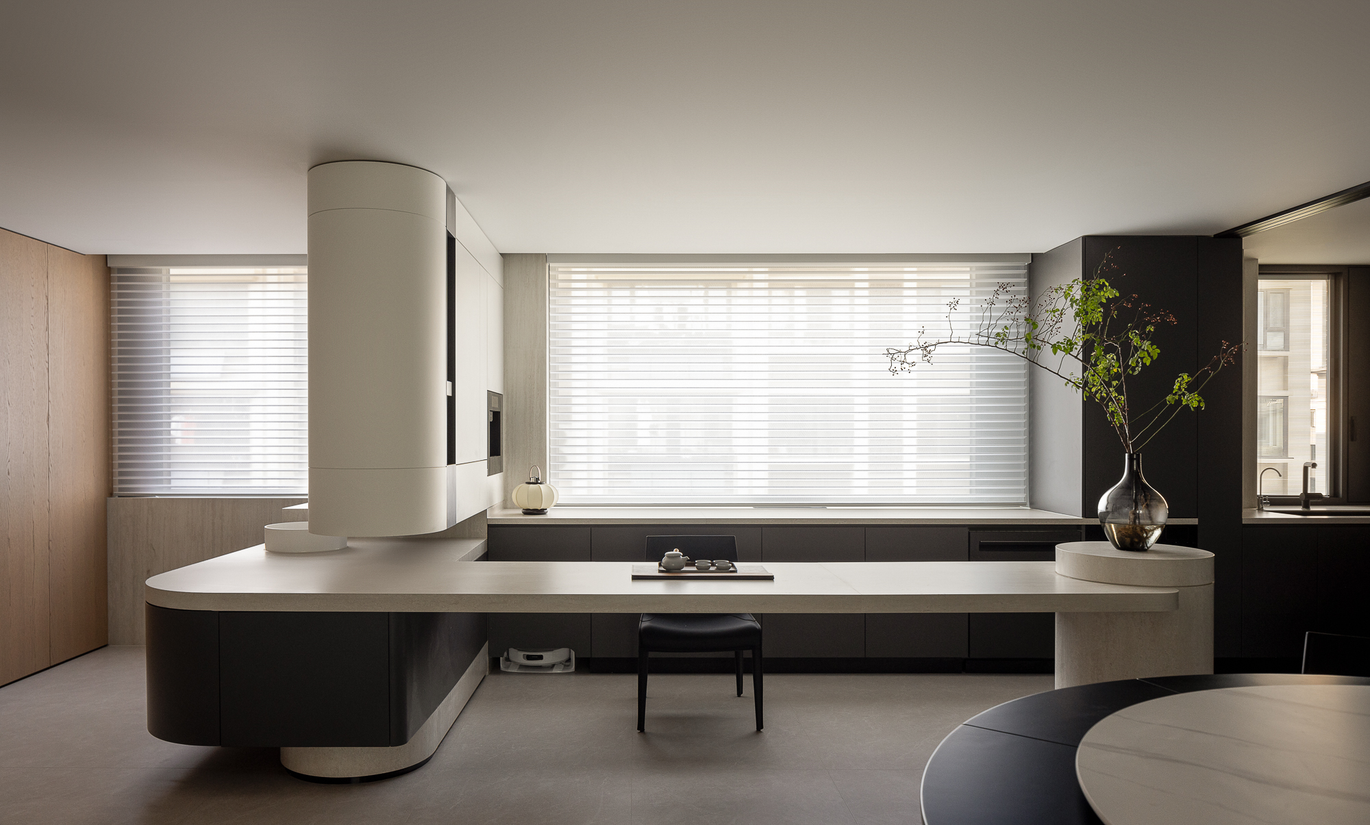 空间布局:客餐厅采用柔和的弧形线条,有效柔化了方正的空间结构。 无论是客厅电视背景墙的曲线,还是餐厅的圆形餐桌设计,这些弧形与圆形的运用不仅软化了直线带来的视觉效果,更增添了空间的流动感与和谐氛围。这种细腻的设计让空间更显亲和,为每个区域都营造出宽敞舒适的活动体验。改造后的客厅,餐厅,西厨南北动线,与中厨,西厨,客卫干区东西动线,双横厅交错,整个空间采光视野绝佳。公区墙体都以圆弧收口,再以竖向深色展示柜嵌入灯光进行断开,形成一扇扇的片墙,空间变的更灵动,也是对家中打闹孩童的保护。每一个转角都暗藏惊喜:在黑白交响的理性空间里,一道优雅的弧线划破沉寂,大人们循着白色阶梯款款而上,孩子们乘白黑色滑梯欢笑而下,在相遇的瞬间,完成了一次无言的亲子互动,让功能性空间升华为情感纽带。