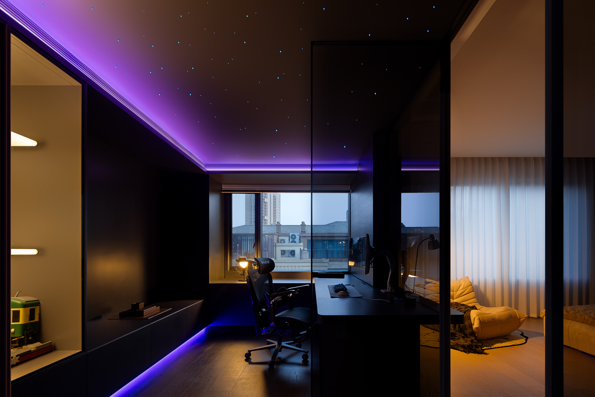 用户体验:整体布局动线流畅,通透与私密完美平衡,女主人衣帽区和男主人衣帽区分开布局,在男主人主帽区设计一处氛围感电竞房,从此快乐无边无际。千万颗微型光纤星子密布穹顶,手指划过智能面板的瞬间——银河倾泻,流星开始坠落,而你的操作比光更快。冷调紫光如北欧极夜里的幽灵,沿着机箱、桌沿、悬浮架流动,当游戏BGM炸响时,整间房便成了一场电子极光秀。