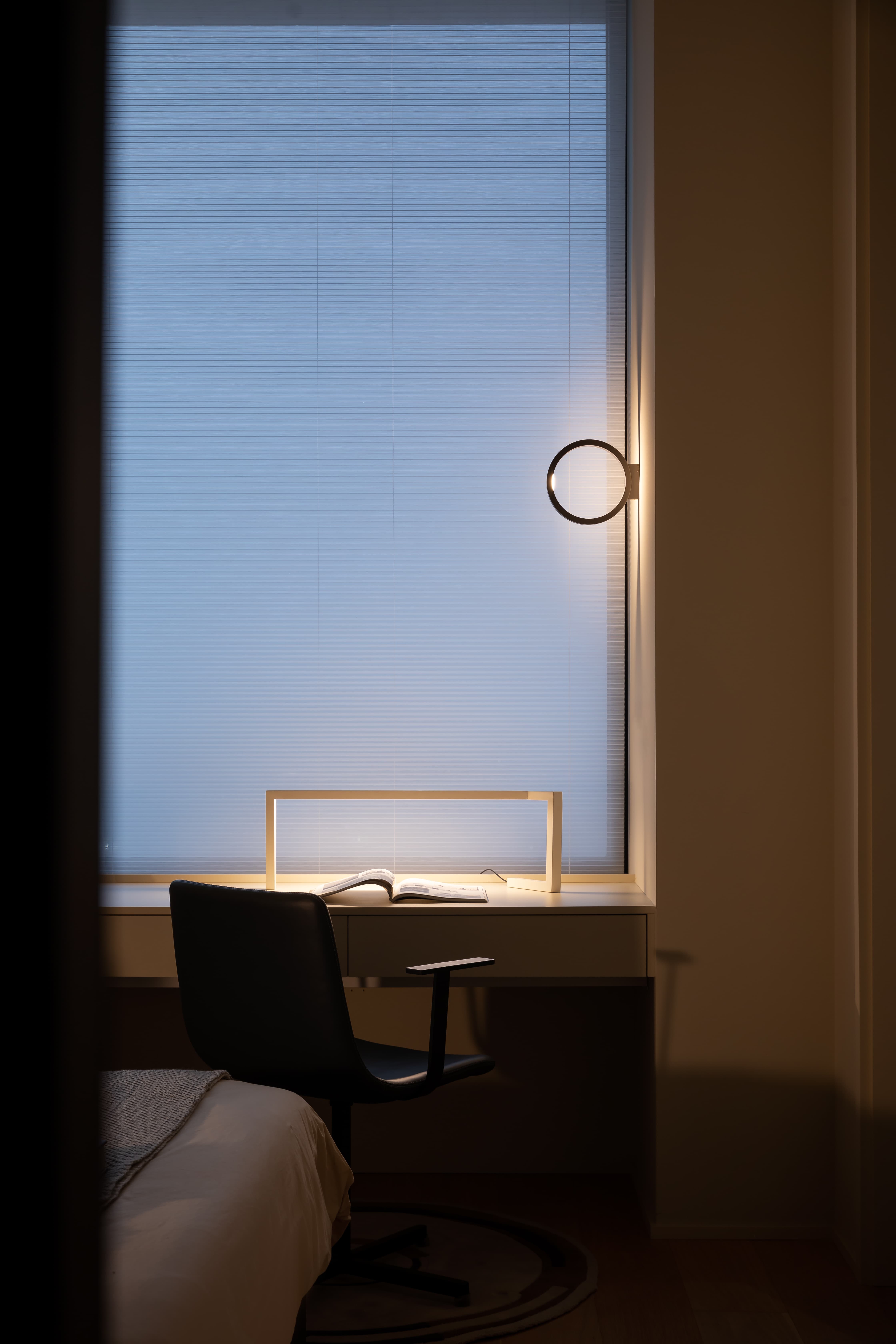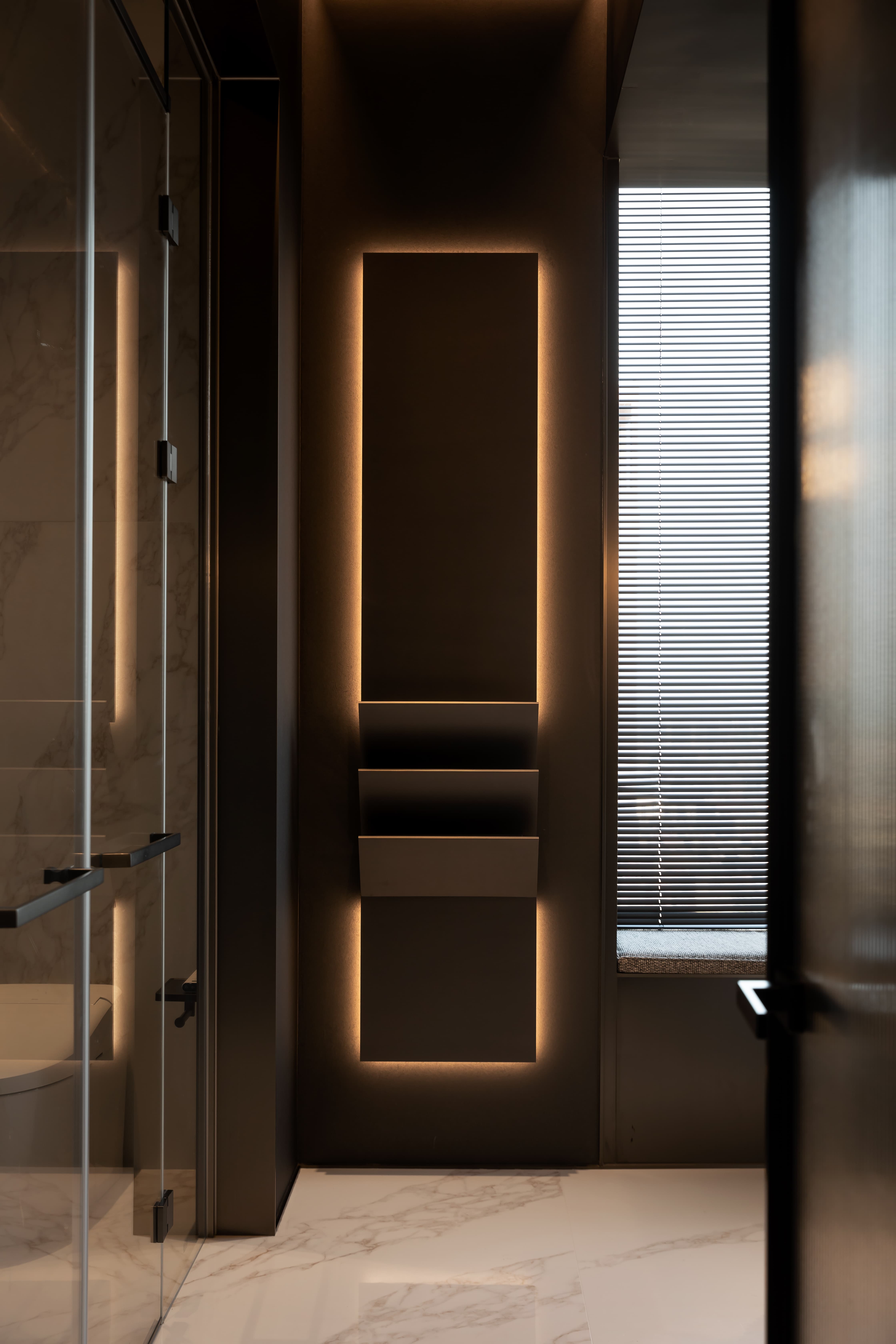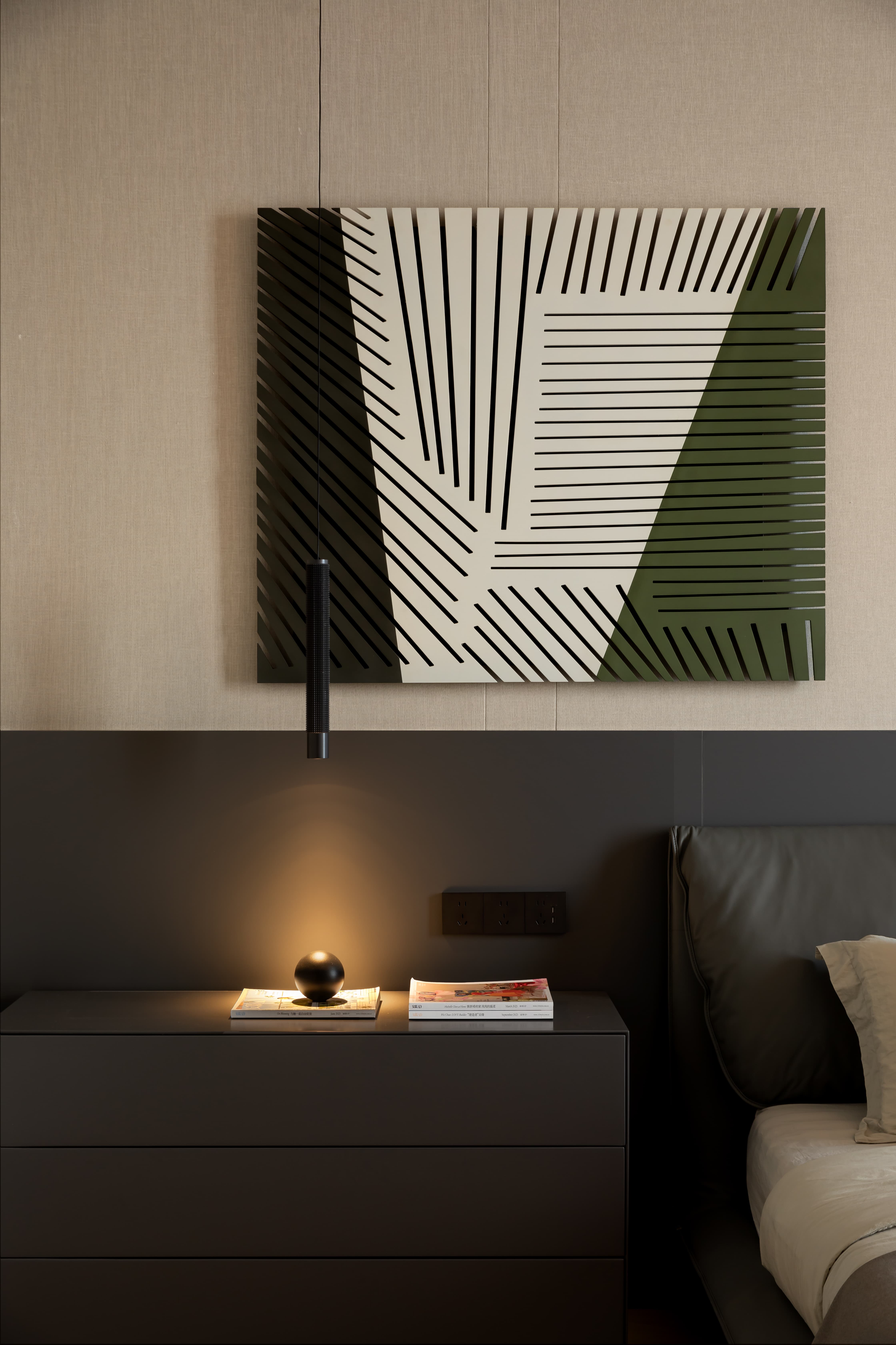 空间意境:线条的运用充满了顽皮的情趣,可控多变又活泼。但需要足够想象力与控场力的并驱,才能使线条可控之余,不陷入杂乱或单调的两级。设计呈现了一个容易捕捉到线条存在感的空间。纹理与层次感非常鲜明,营造出静谧而动态的平衡。手法的运用,在呈现背后,是一套复杂的解读和操控。甚至元素的反复堆叠,在热情中透露出冷静、克制,不失温情的效果。这种效果投射在空间里,将内敛、稳定演经得鲜明又极具哲学意味--抵消矛盾边界,融合建立在此完成。空间的退让与叠套,大量运用了电影镜头中长镜式衔接,线条转换成雕塑量感贯穿其中,渗入细节,将线条的运镜作用拉满。