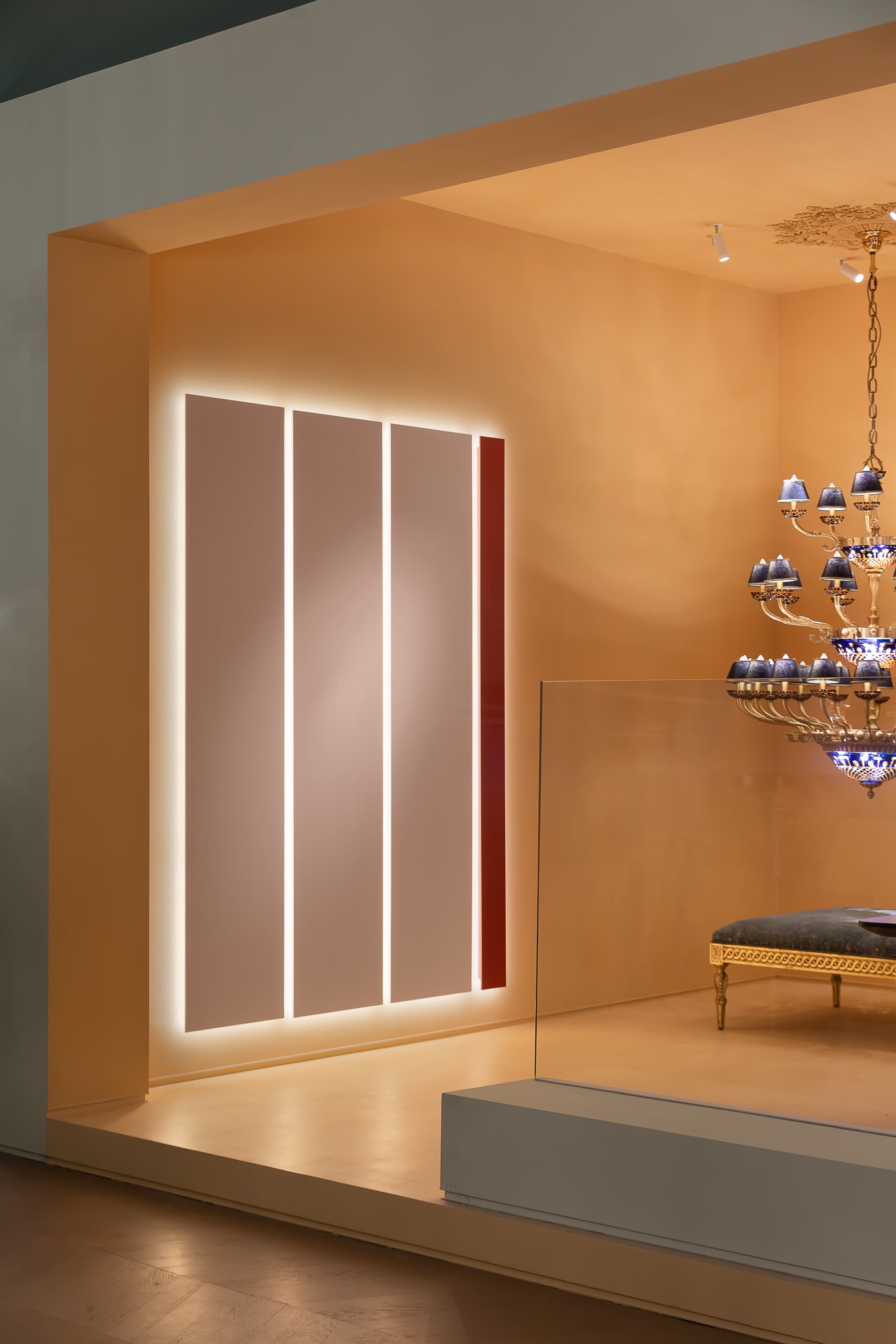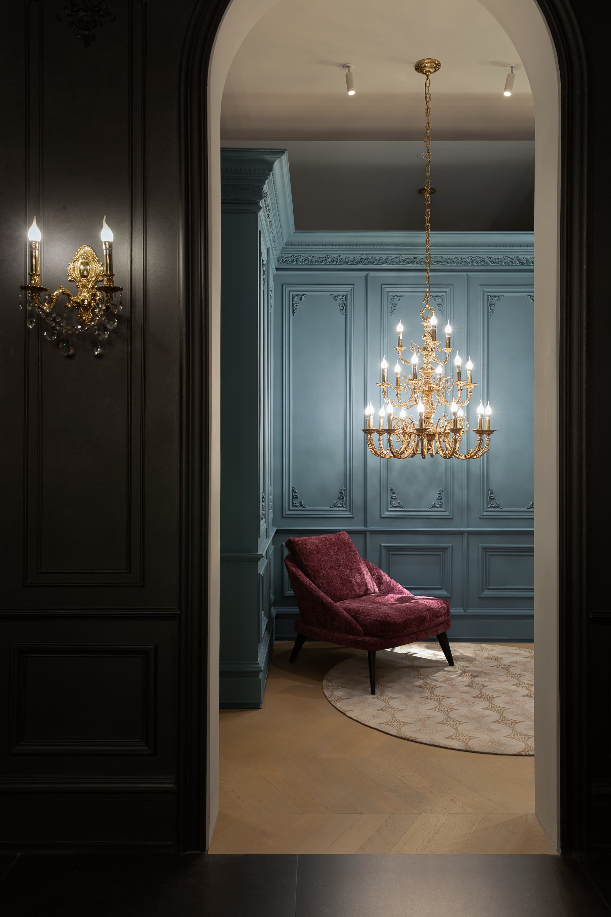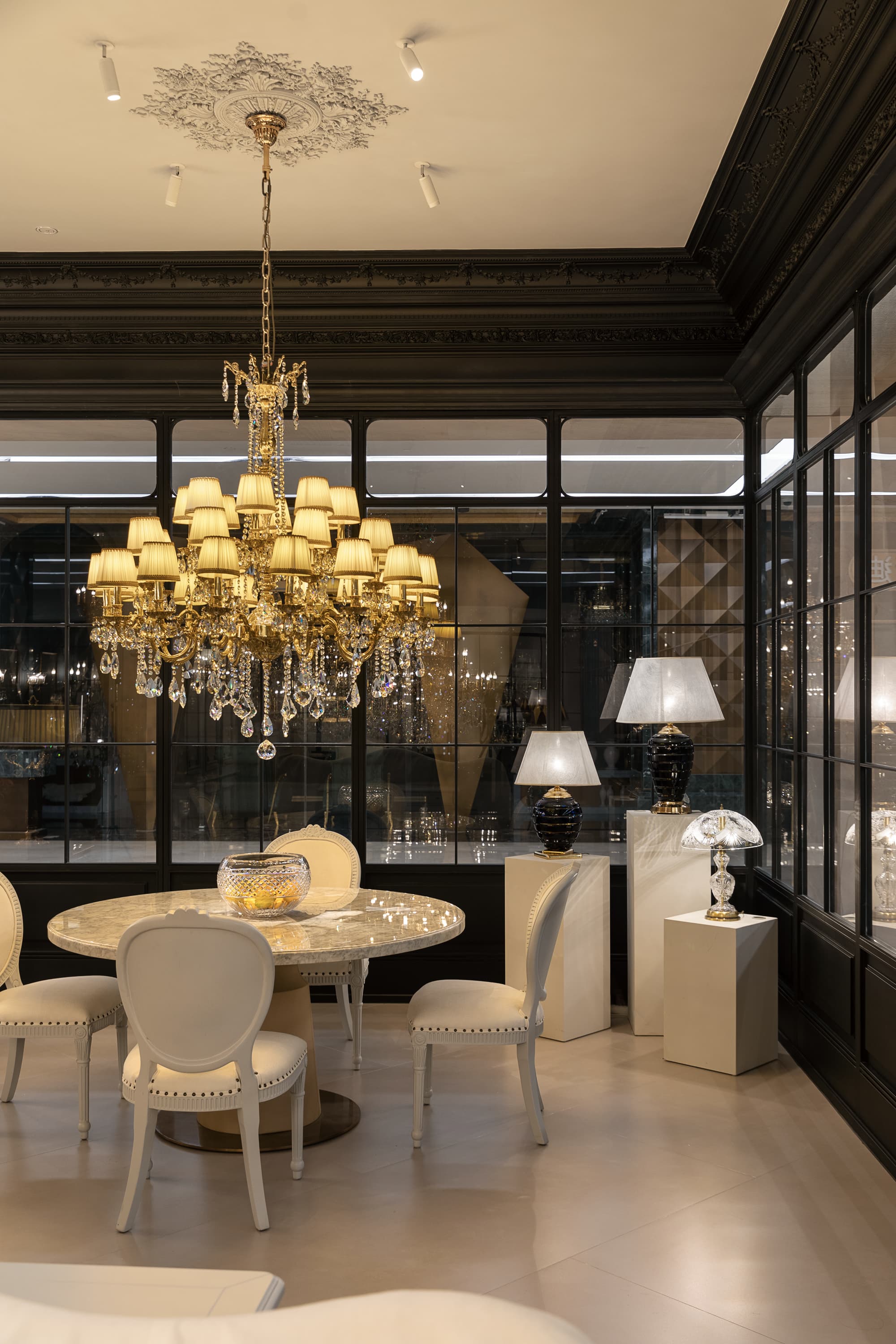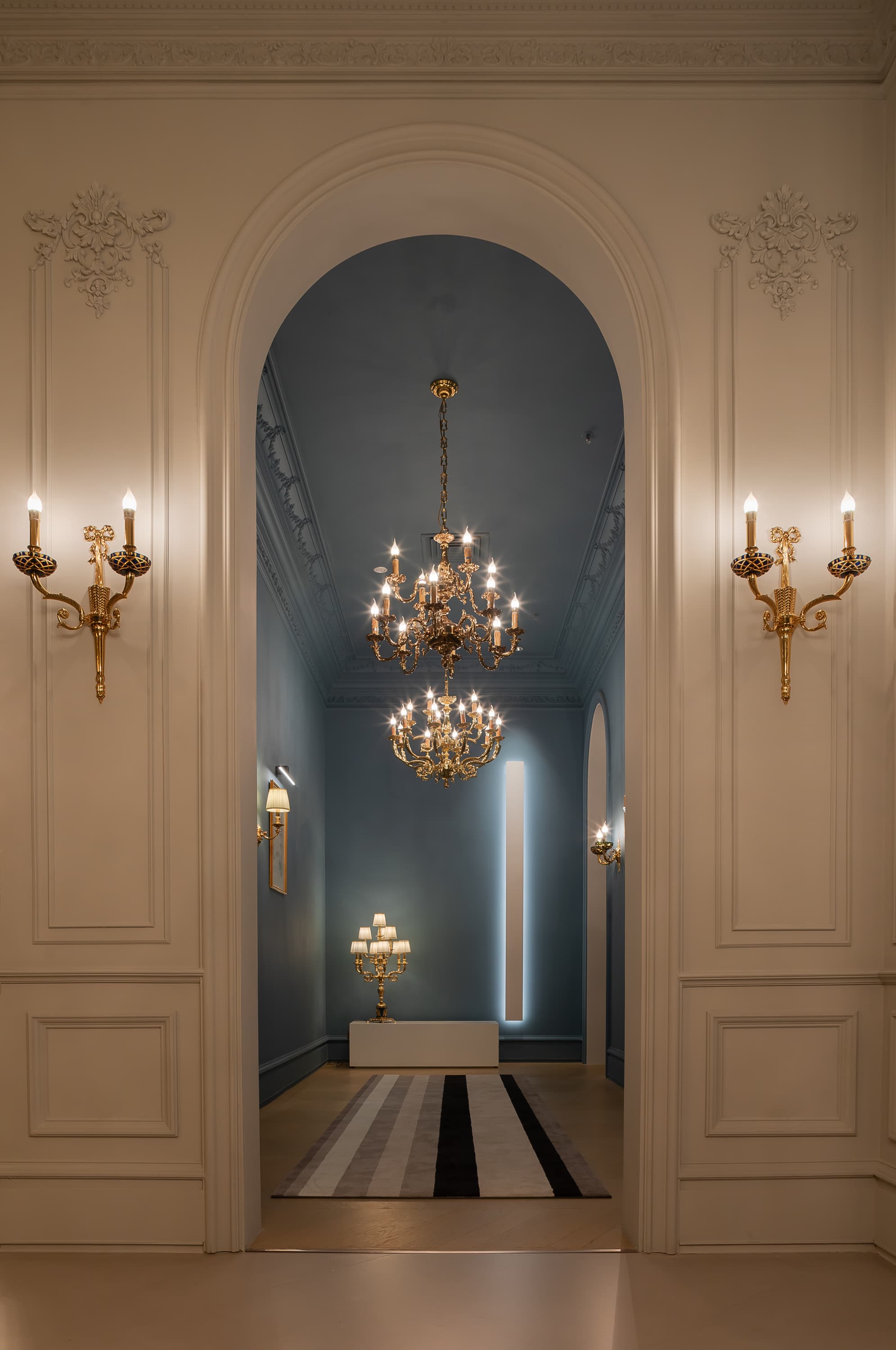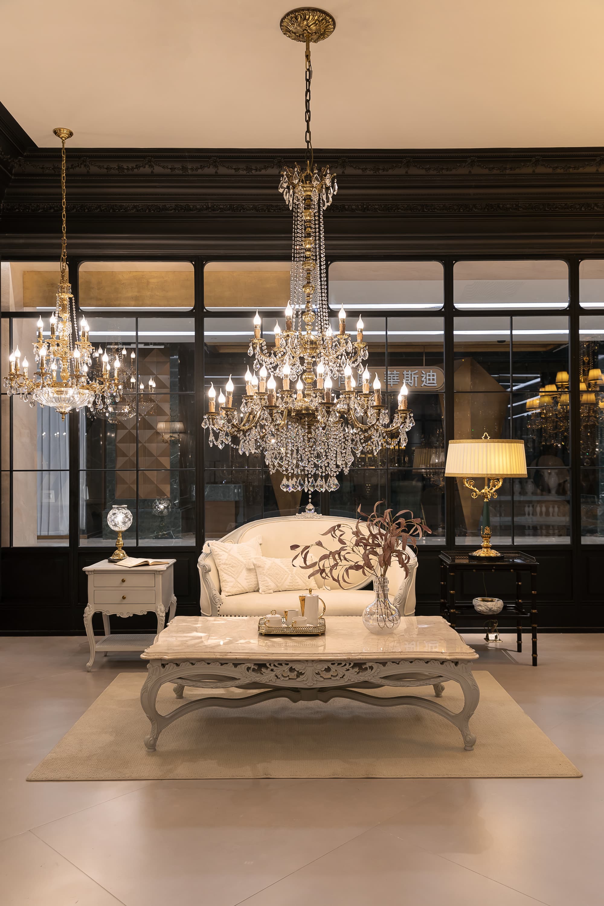 设计选材:特种蓝灰是我们寻找了很久的颜色。代表着展厅以及品牌的某种意志--阳光映衬下的天空、海洋的远眺感,也代表着“设计的星丛”从传统的风格中找到积极向上的想法。设计语言所讲述的逻辑是:传统的灯饰与年轻化时代的存在和共生是完全可行的。