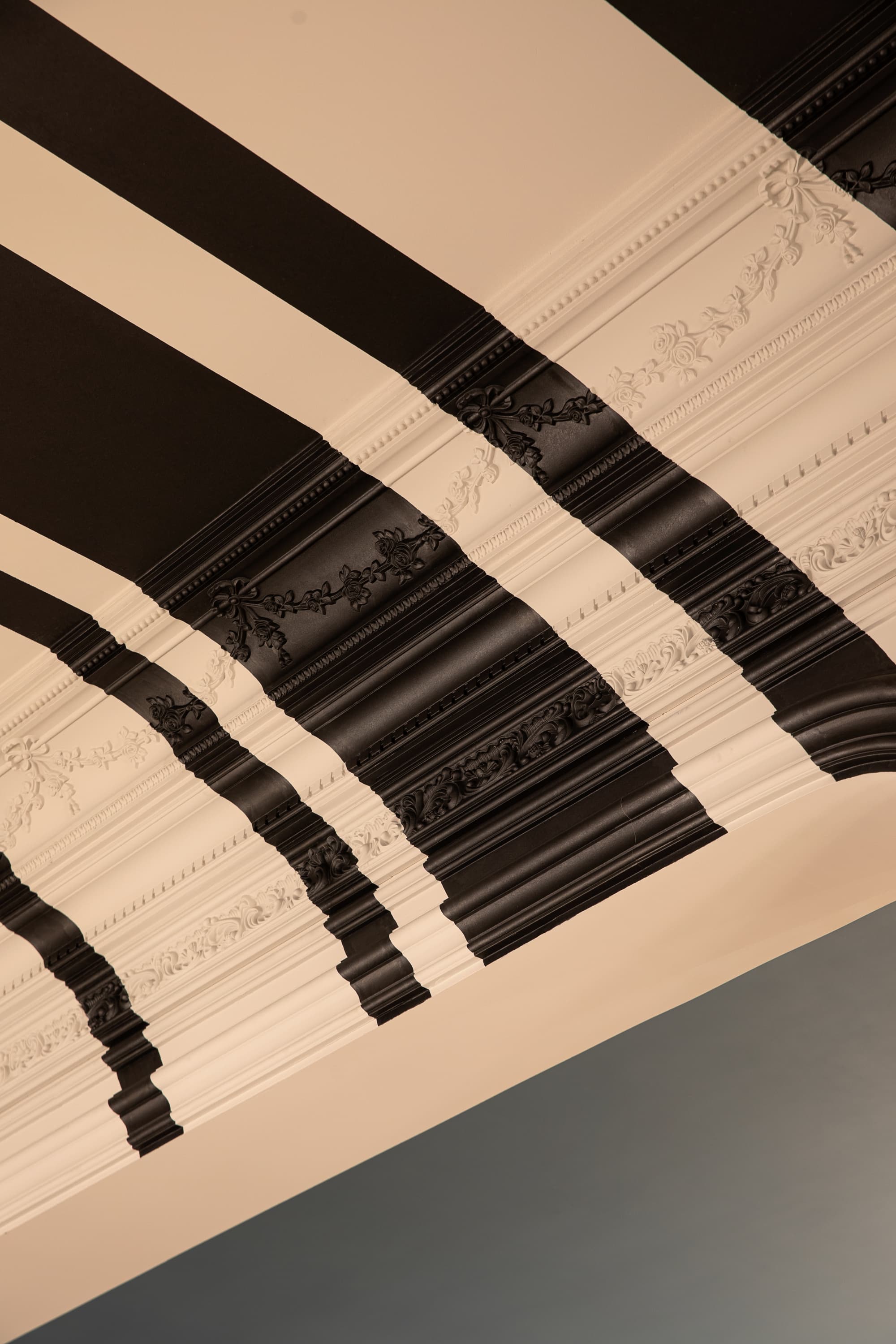 这些看似单一,但极其复杂的色块运用,将“面”的视觉张力增大,把整个下行空间打开,缓冲复杂多样的灯具、光线对上行空间的过度聚焦,完成一个浓重的空间共鸣。 -