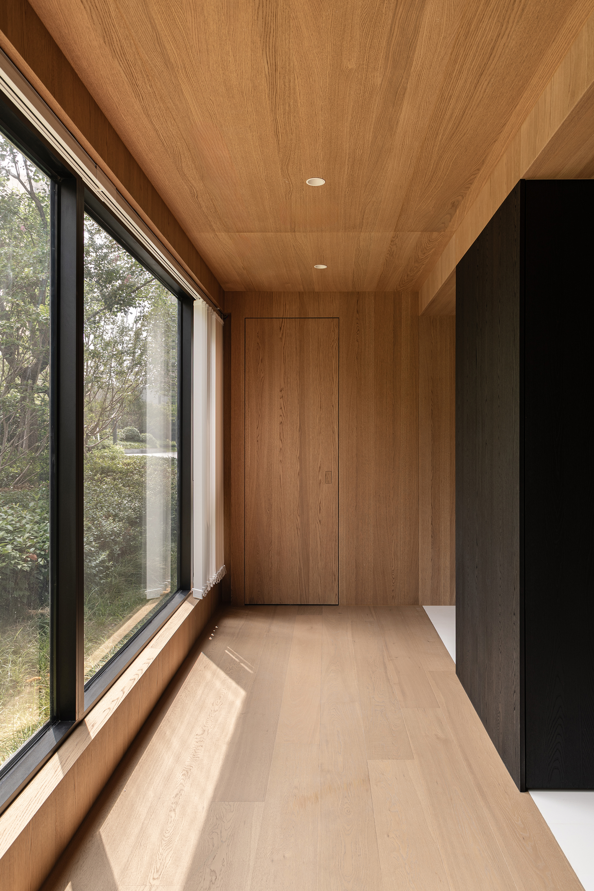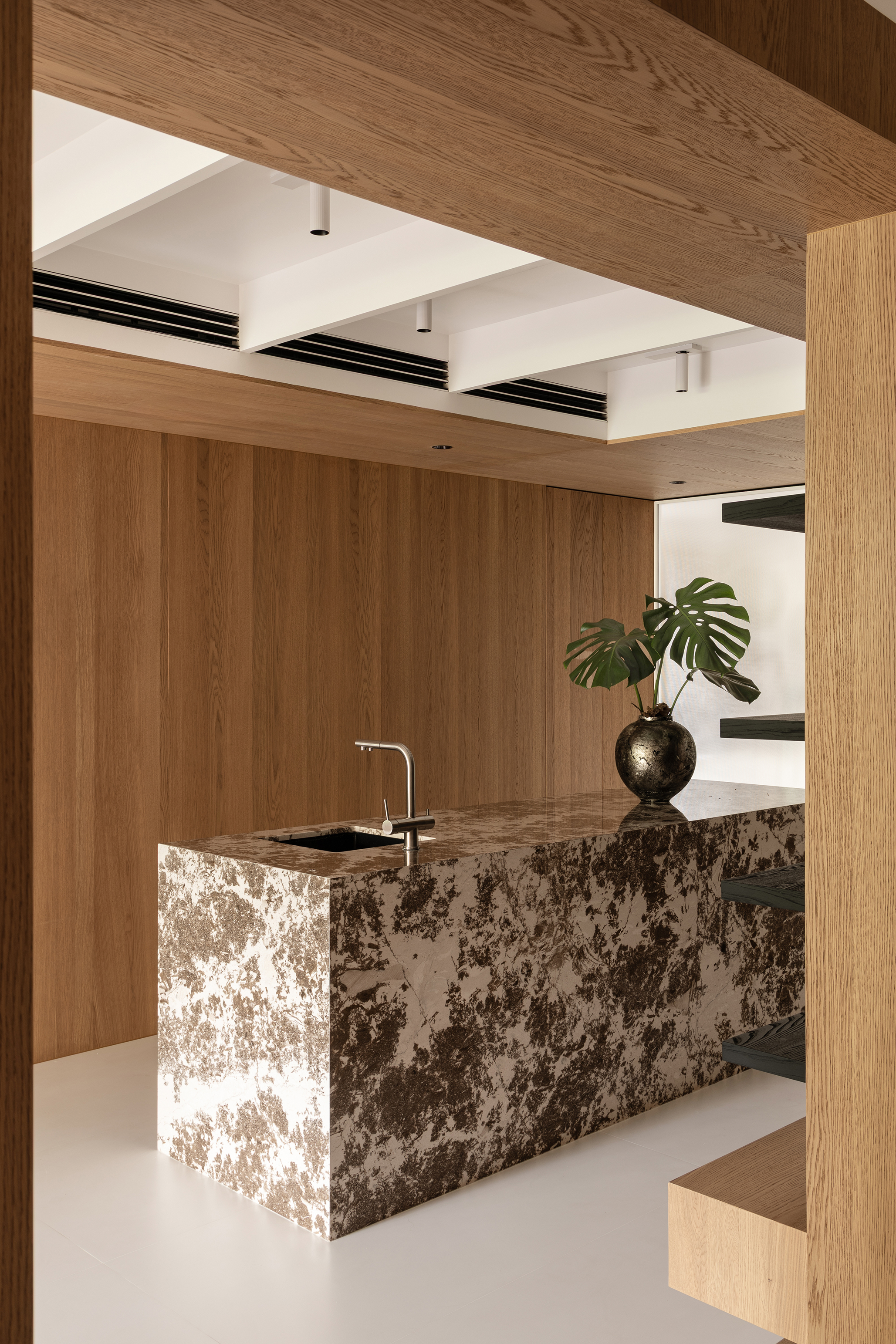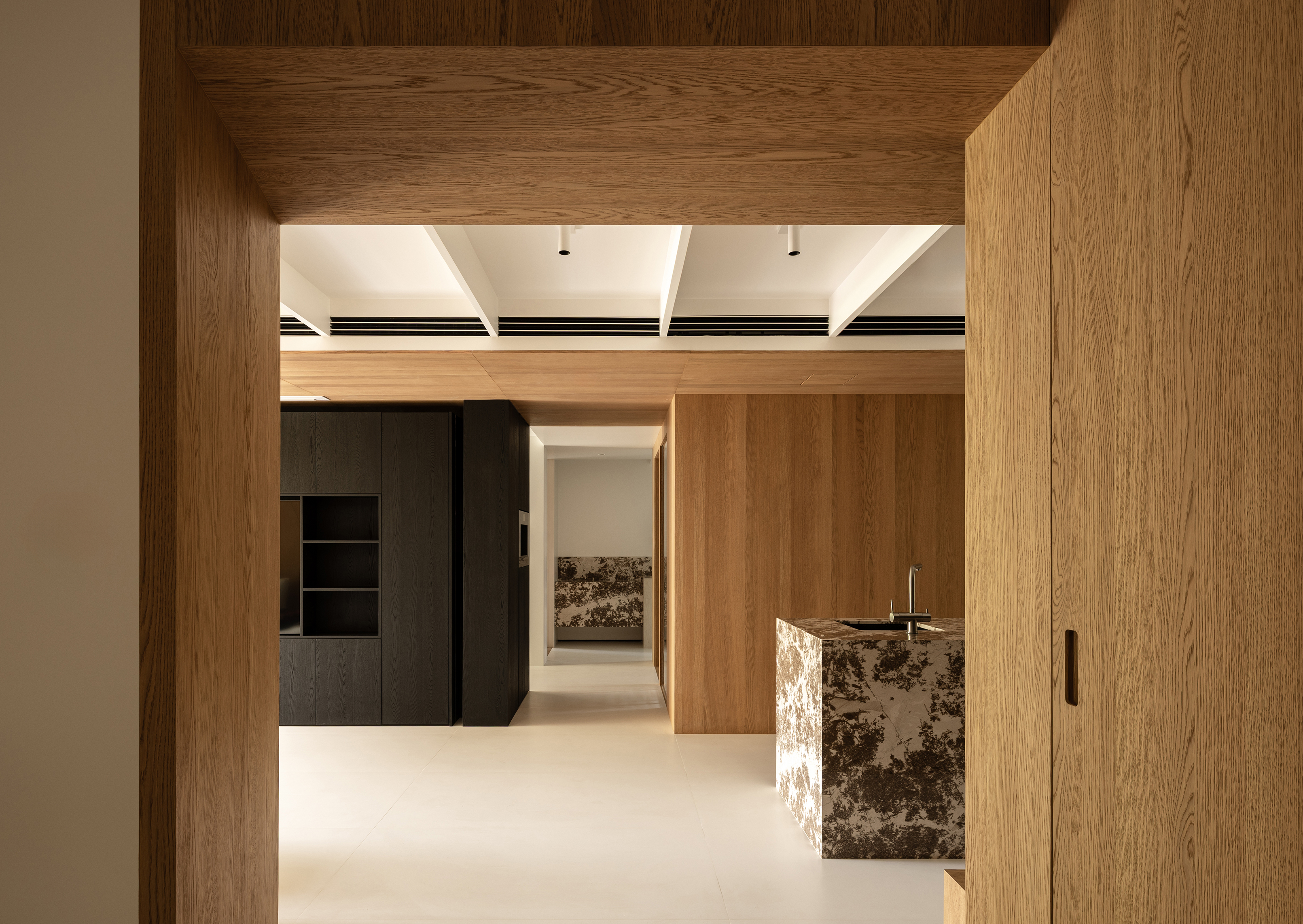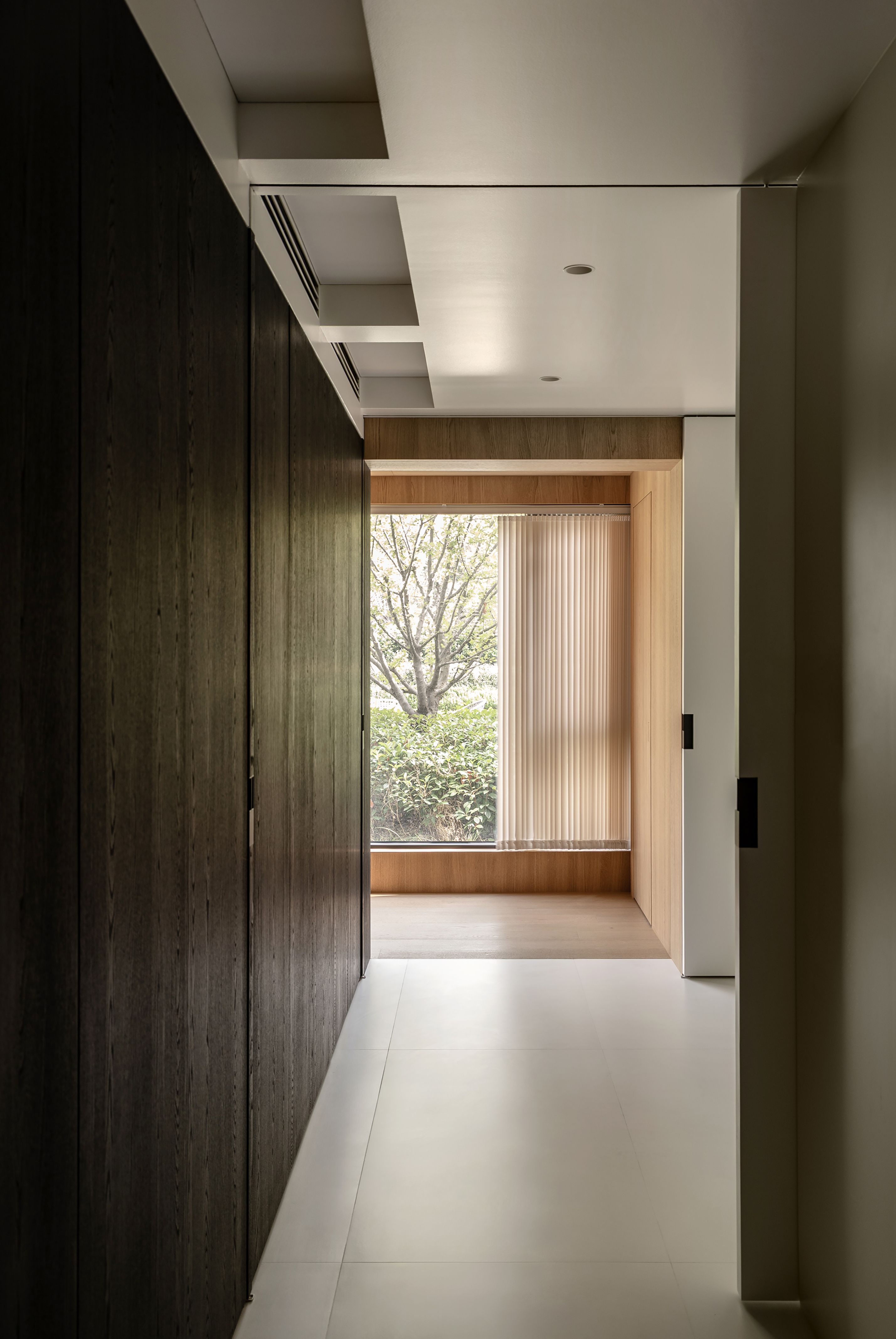 空间意境:事物存在于逻辑,希望空间承载人与自然的链接和共生性。建立了空间的架构关系,使视觉重心中心化,避免压迫感,顶部层级的阵列、深色体块和顶部形成的悬浮感,这些场景使得空间明确层次分明,也让光感更加温润。在让空间变得有延伸以及使使用者用起来更加便利后,材质的应用上考虑到一层的光线,工区的地面整体以浅色地砖作为漫反射统一铺贴,辅助的白橡木让空间安静下来,温和下来,与廊道和室外的植被形成共生的自然状态,每一个垭口的交错和延伸都让空间充满趣味,小隐于世。