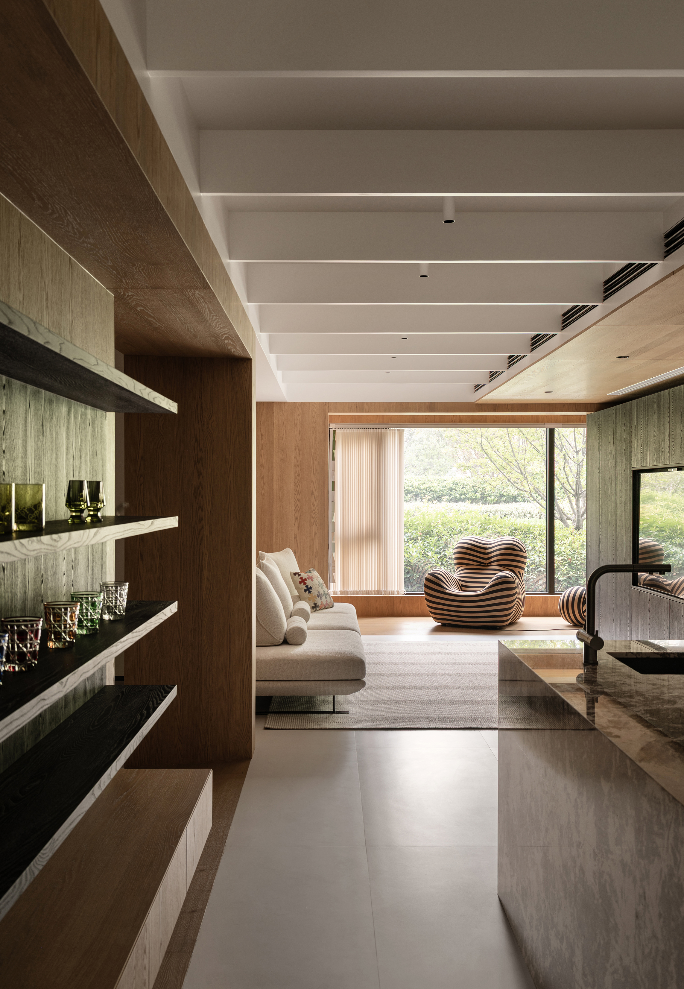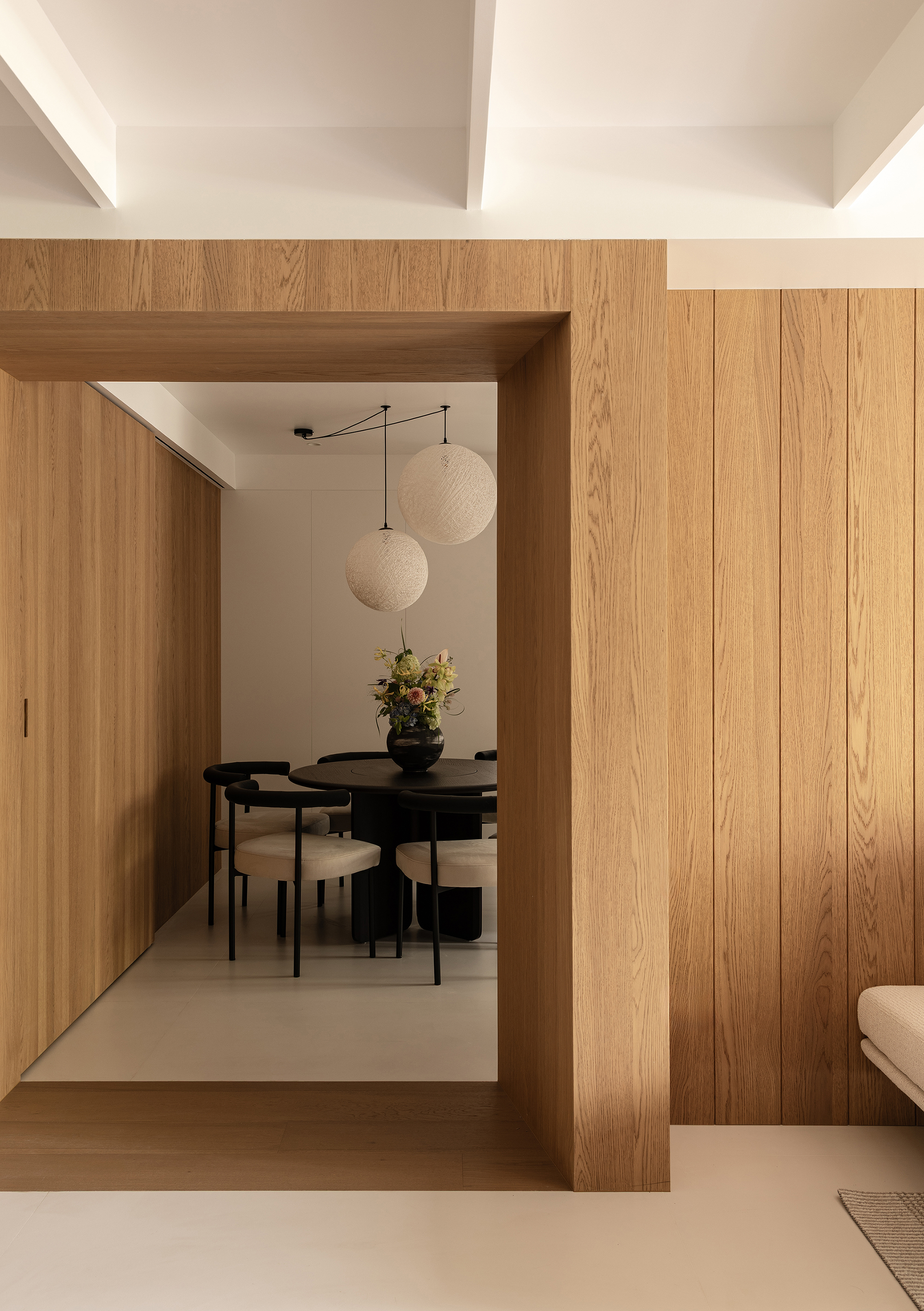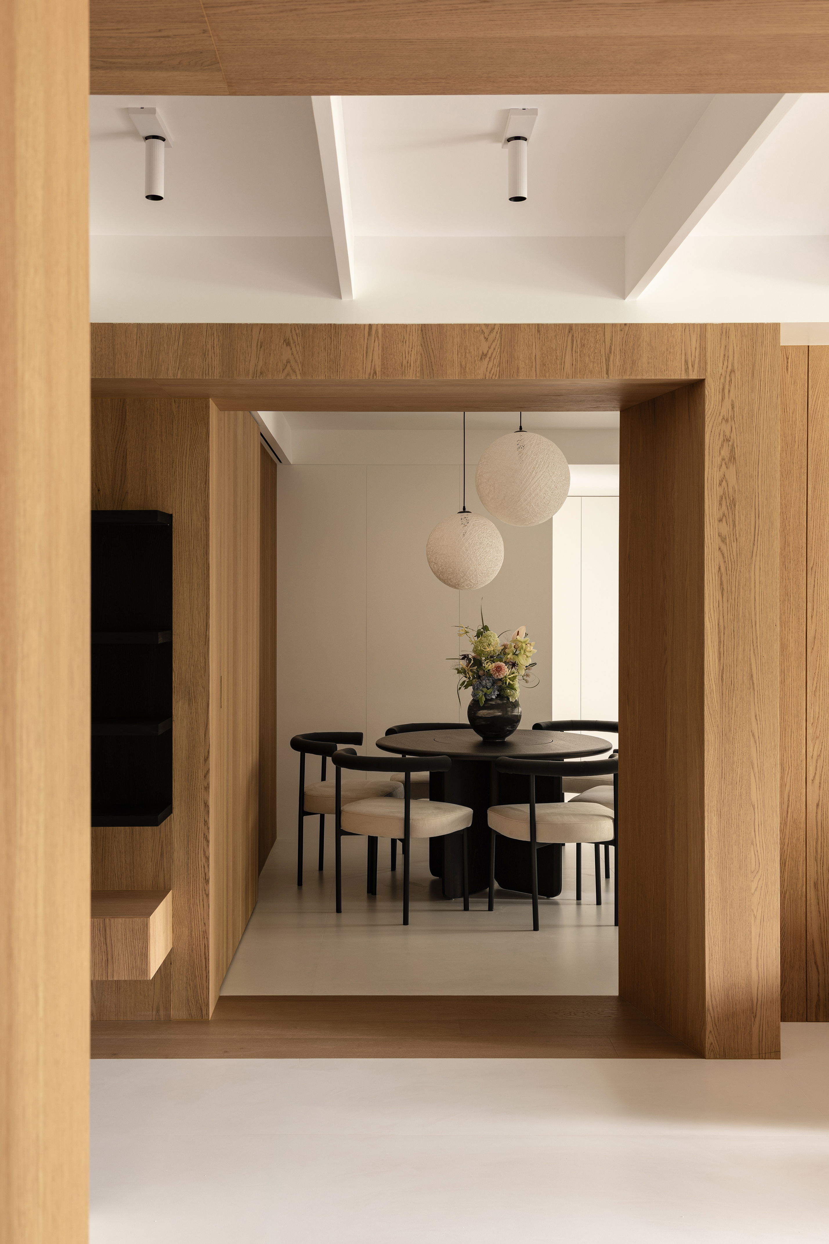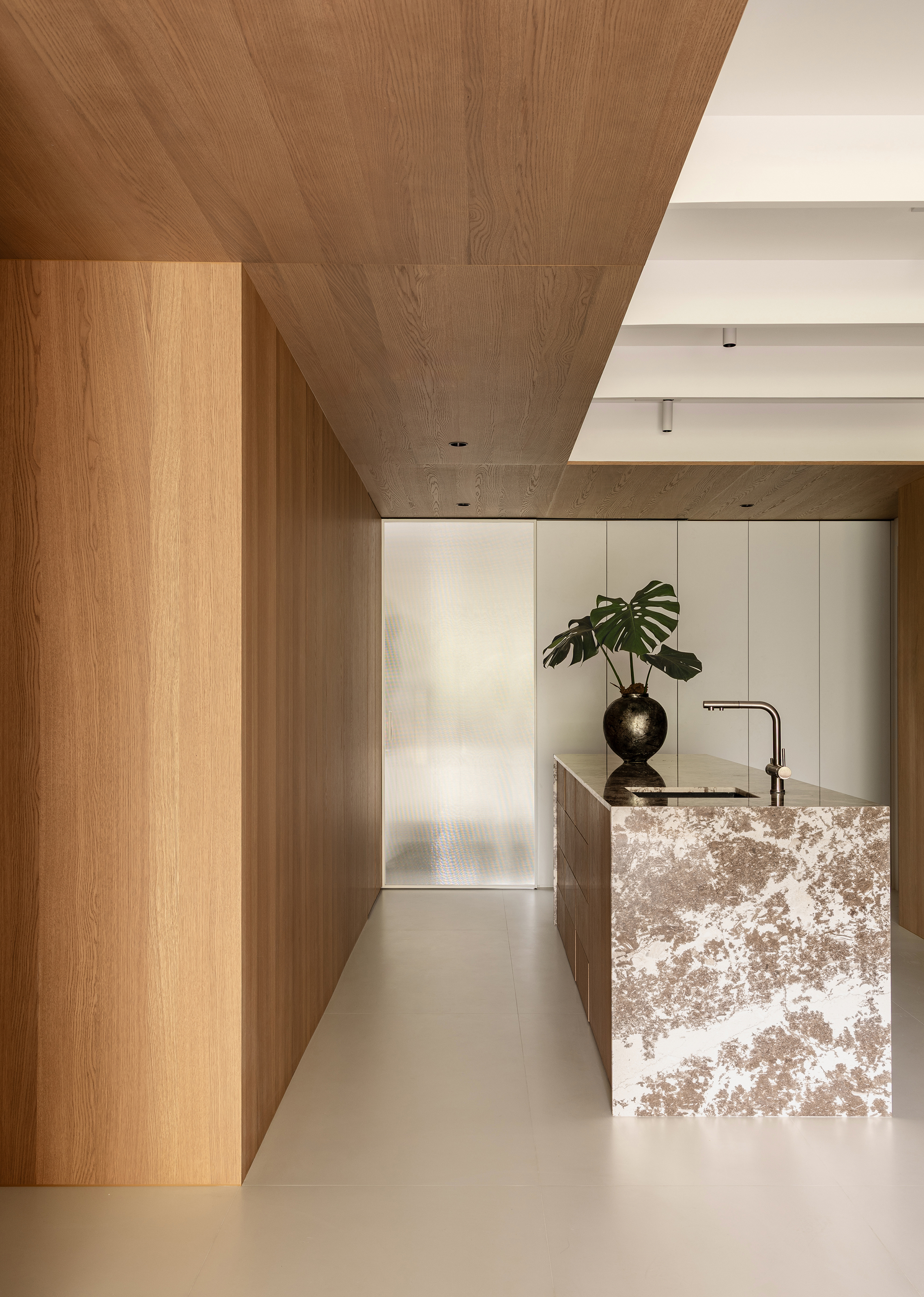 空间意境:事物存在于逻辑,希望空间承载人与自然的链接和共生性。建立了空间的架构关系,使视觉重心中心化,避免压迫感,顶部层级的阵列、深色体块和顶部形成的悬浮感,这些场景使得空间明确层次分明,也让光感更加温润。在让空间变得有延伸以及使使用者用起来更加便利后,材质的应用上考虑到一层的光线,工区的地面整体以浅色地砖作为漫反射统一铺贴,辅助的白橡木让空间安静下来,温和下来,与廊道和室外的植被形成共生的自然状态,每一个垭口的交错和延伸都让空间充满趣味,小隐于世。