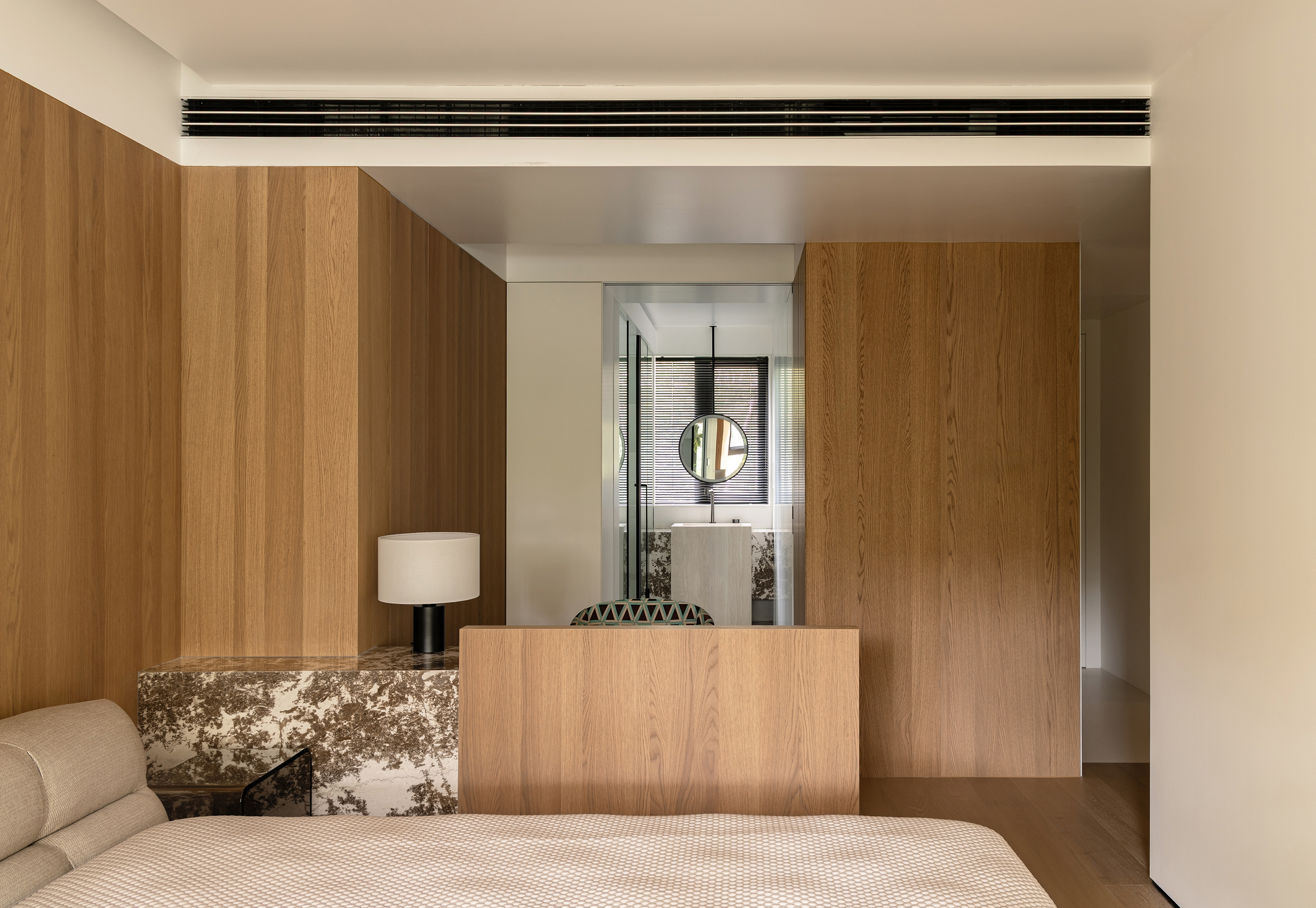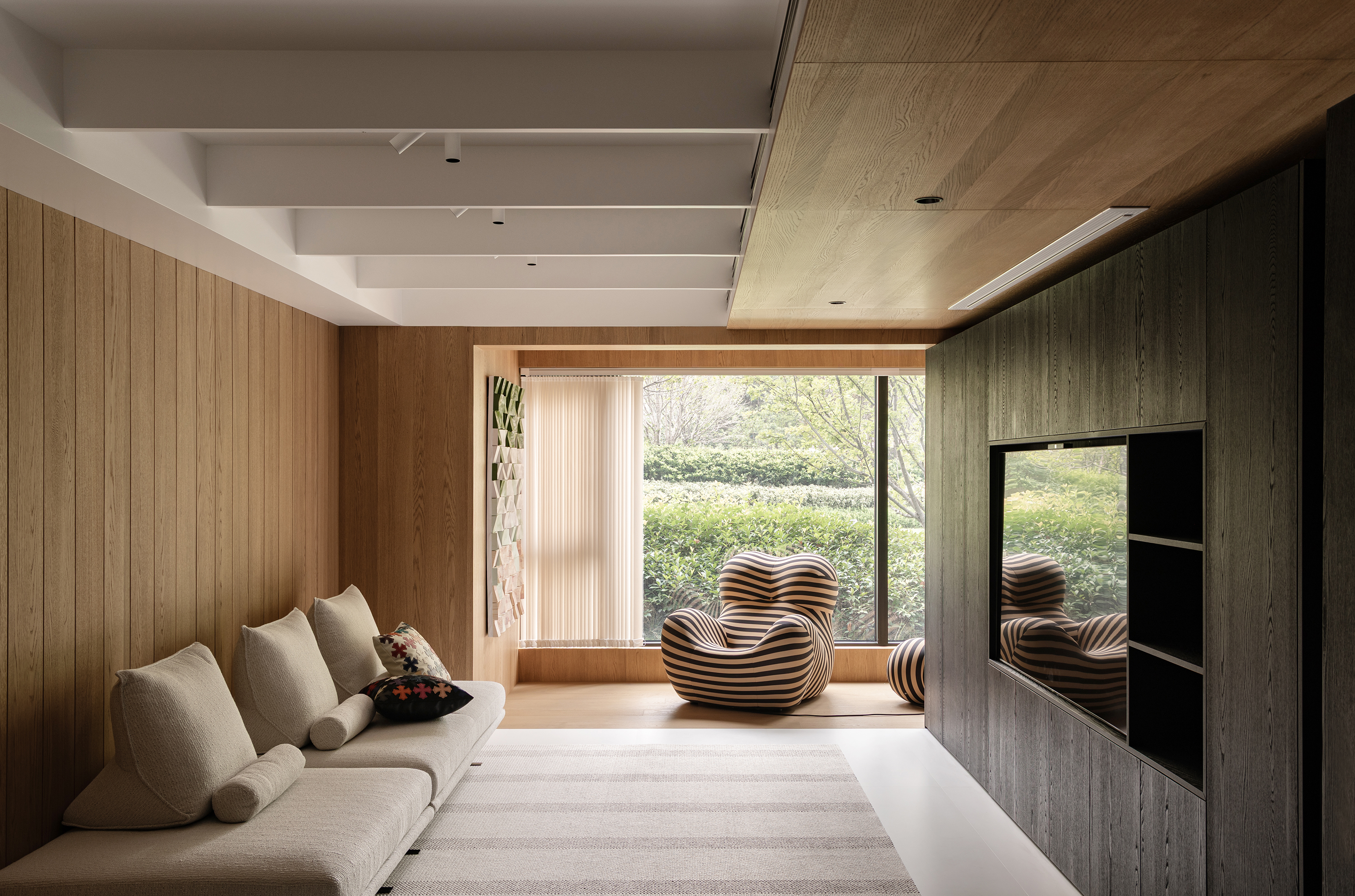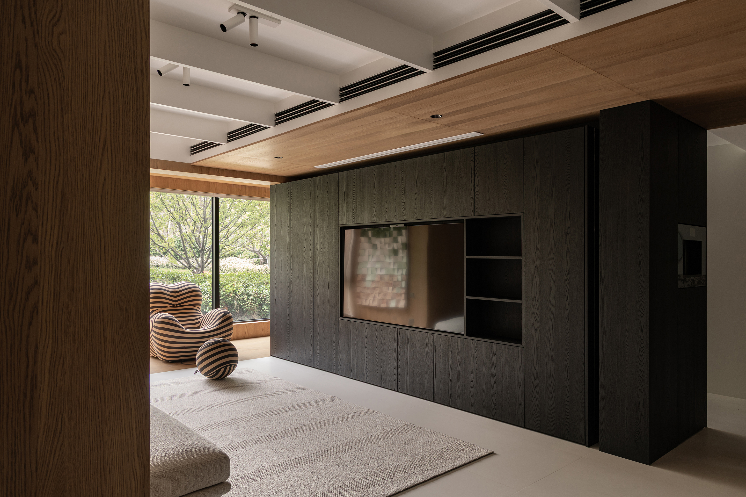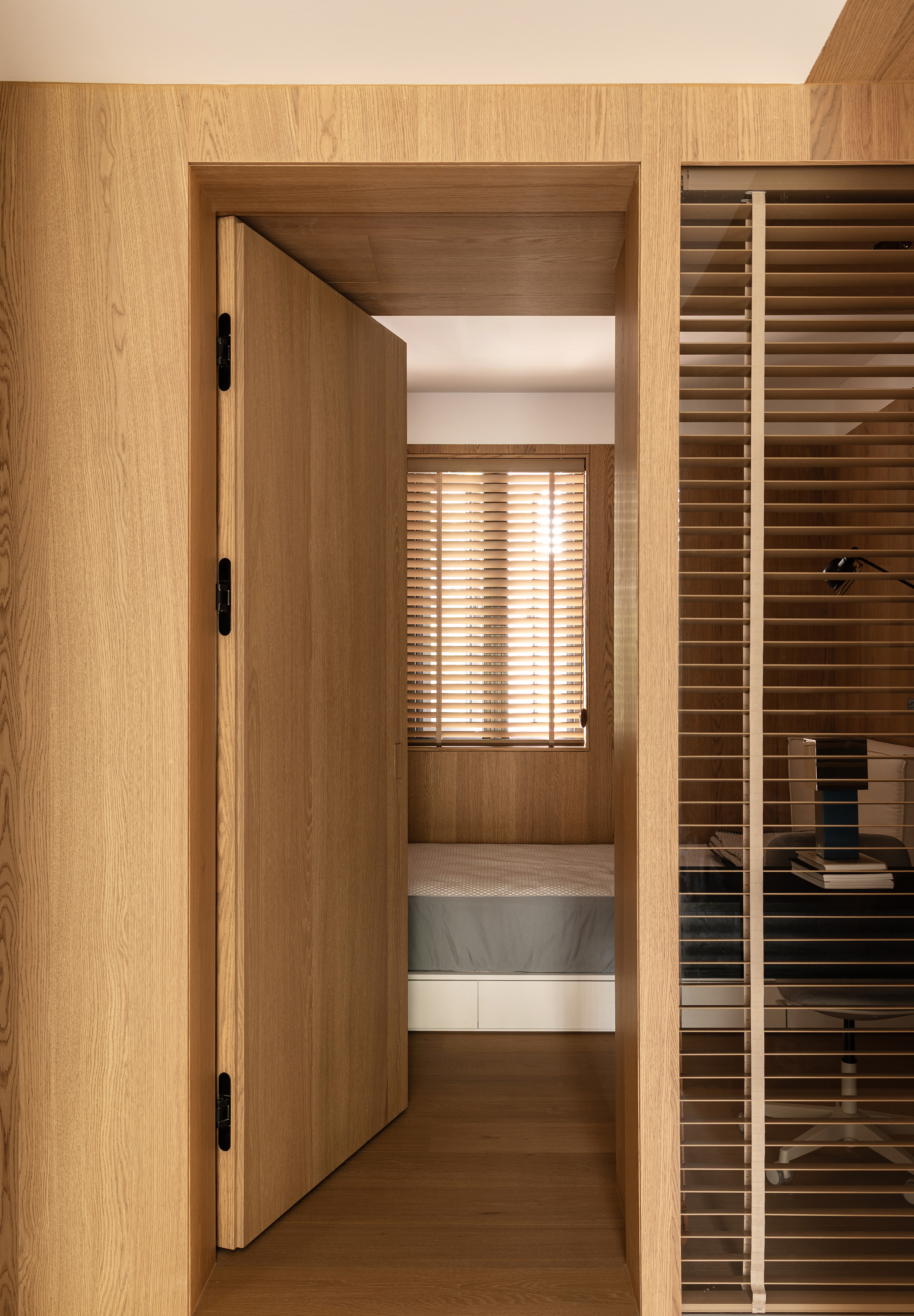 空间意境:事物存在于逻辑,希望空间承载人与自然的链接和共生性。建立了空间的架构关系,使视觉重心中心化,避免压迫感,顶部层级的阵列、深色体块和顶部形成的悬浮感,这些场景使得空间明确层次分明,也让光感更加温润。在让空间变得有延伸以及使使用者用起来更加便利后,材质的应用上考虑到一层的光线,工区的地面整体以浅色地砖作为漫反射统一铺贴,辅助的白橡木让空间安静下来,温和下来,与廊道和室外的植被形成共生的自然状态,每一个垭口的交错和延伸都让空间充满趣味,小隐于世。