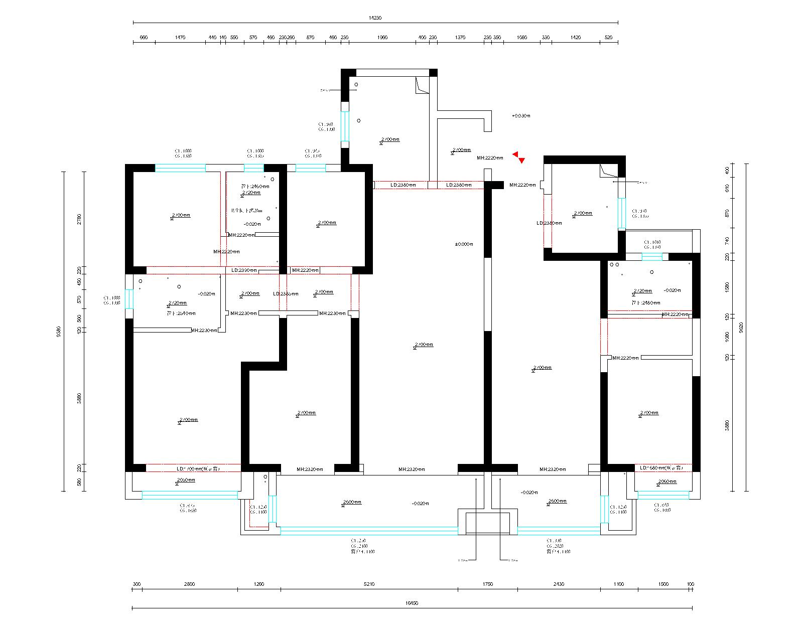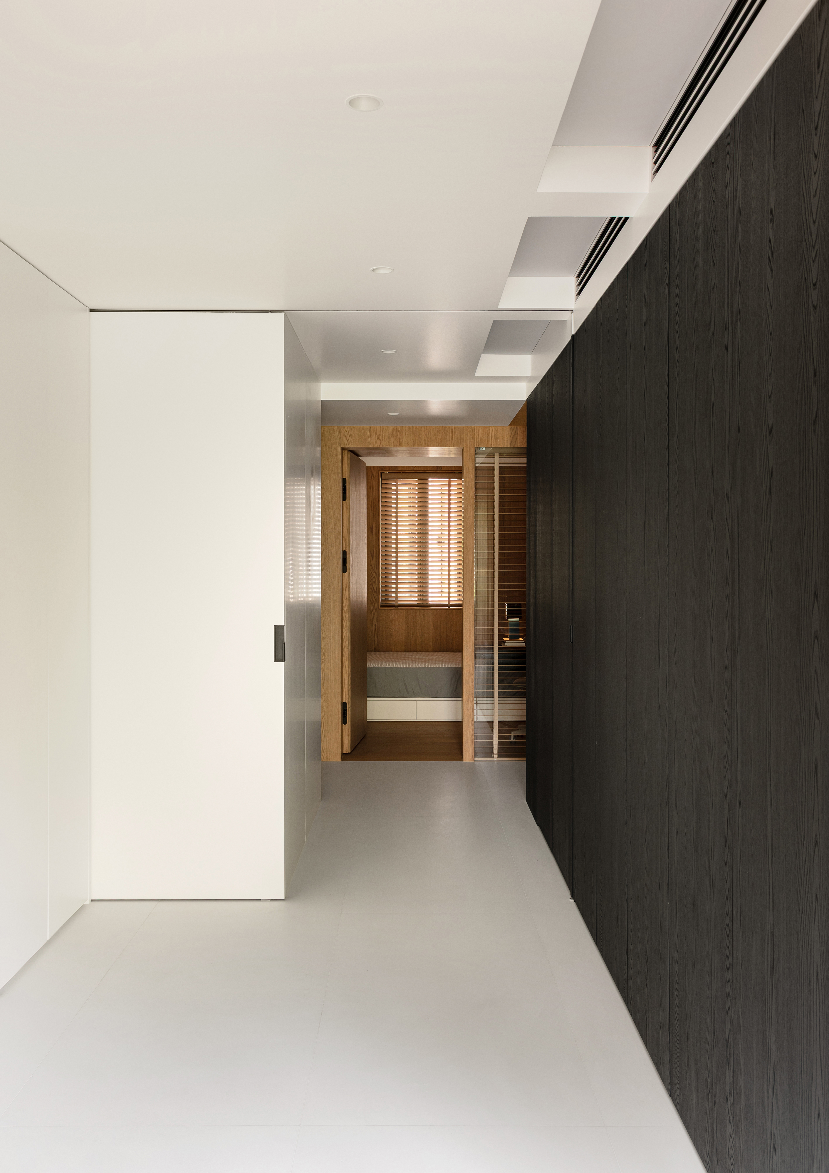 空间布局:设计思考上对于空间来说,感官的东西未必是准确的,就像是时间被风化,你才知道原来风也有形状。空间在伴随着梁体、结构柱生成的时候,其实已经被赋予了有形的一部分,我们要做的就是如何可以让它通过结构与感官产生对话达到共鸣,设计技法会形成自己的语言,但是味道和精神很难被表达出来。原始的两套户型之间仅有的一道墙体可以作为两个空间的链接,在施工当中发现原有建筑浇筑和图纸不符,导致二次植筋加固,才有了现在唯一的衔接点。在方案布局当中,两个入户门,客观来说会对应两个出发点,决定了入户的第一视觉,在整个游走的关系中,其实核心的点更多在于公区的利用方式和呈现感受上,如果只是简单的一个客厅,那么人均面积将会非常闭塞,加上高度仅2.76m,承重墙让工区显得狭长,所以移动路径的目标点则是阳台北侧的这道墙体和紧挨着这个墙体的房间,是否可以释放出来,决定着空间的横向比例关系。呈现效果上以重色体块隐匿了承重墙体,实现了流动式交互空间和移动路径感官达到的视觉张力与空旷的精神 ,用板块与面把原本琐碎的独立几何体黏揉一块,让光通过不同角度的视觉,呈现每个几何体的特有层次,在层次中二次寻找平衡点,最后的触点便是最终的兼容与感动。