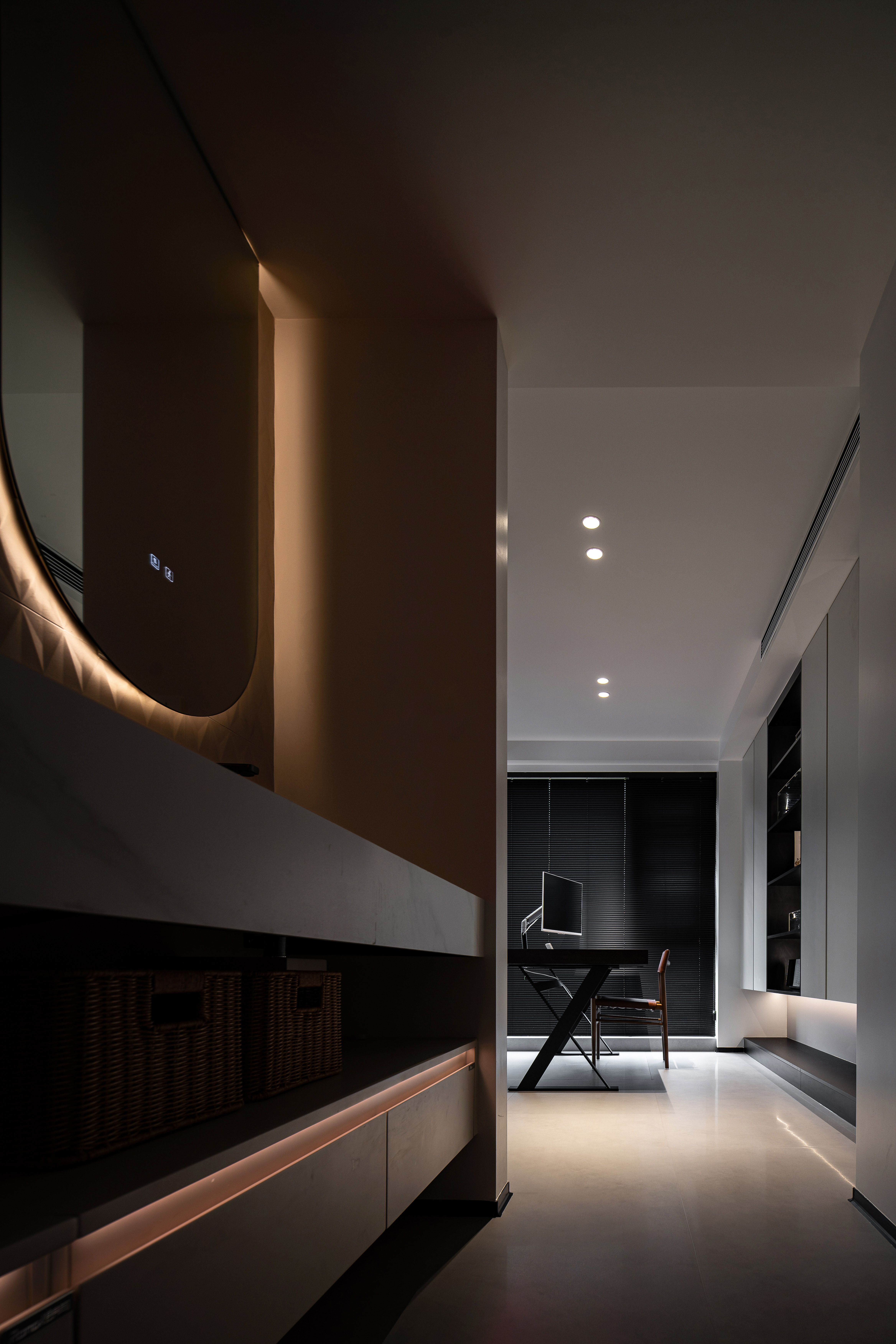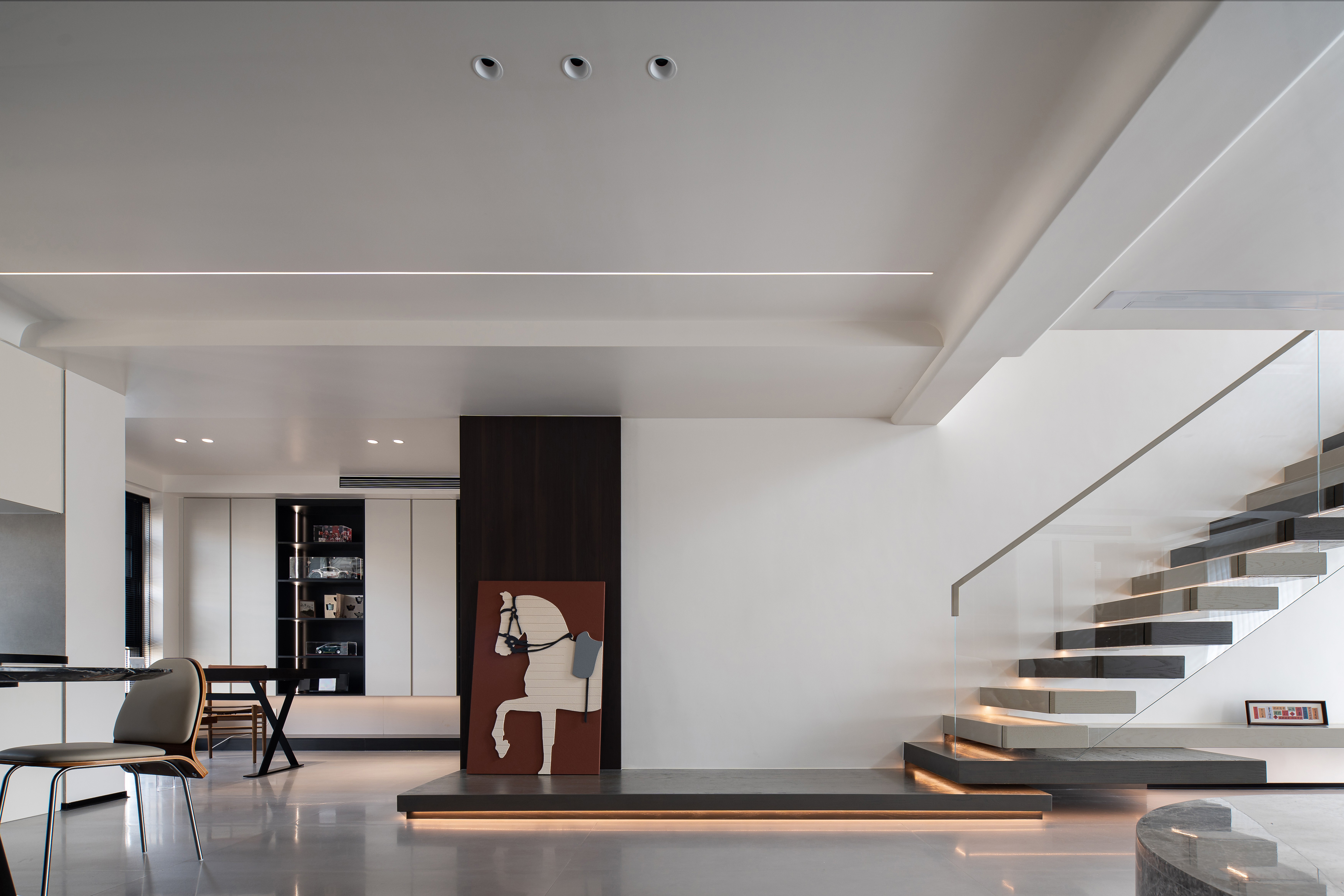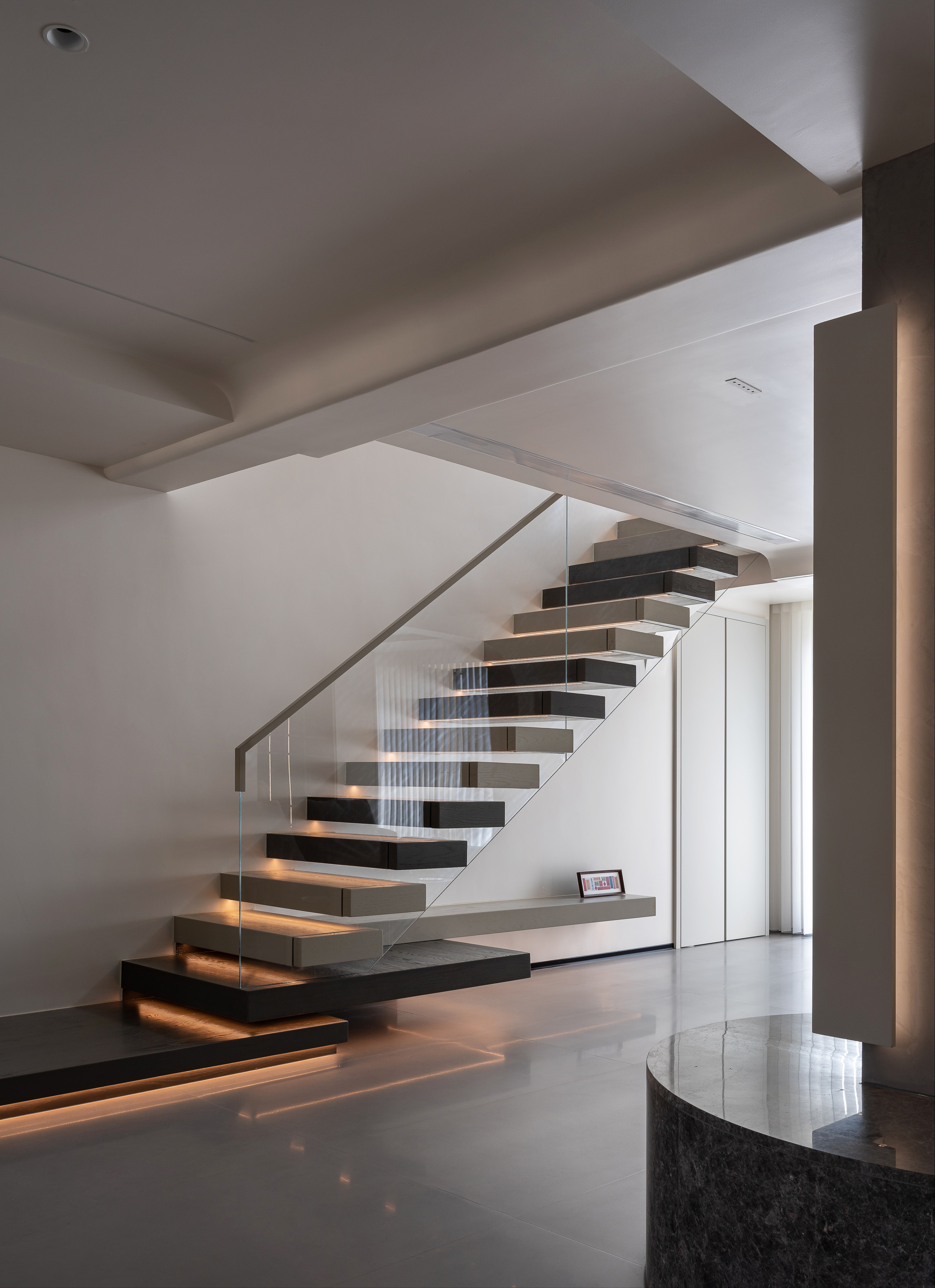 故事的链接处, 改变原本的出处, 以悬浮的突出, 均衡空间的诗意。 层层台阶处, 是不同气质的材质, 木质的古朴温润, 岩板的现代柔和, 玻璃的纯净透明, 交织出独有的韵律。