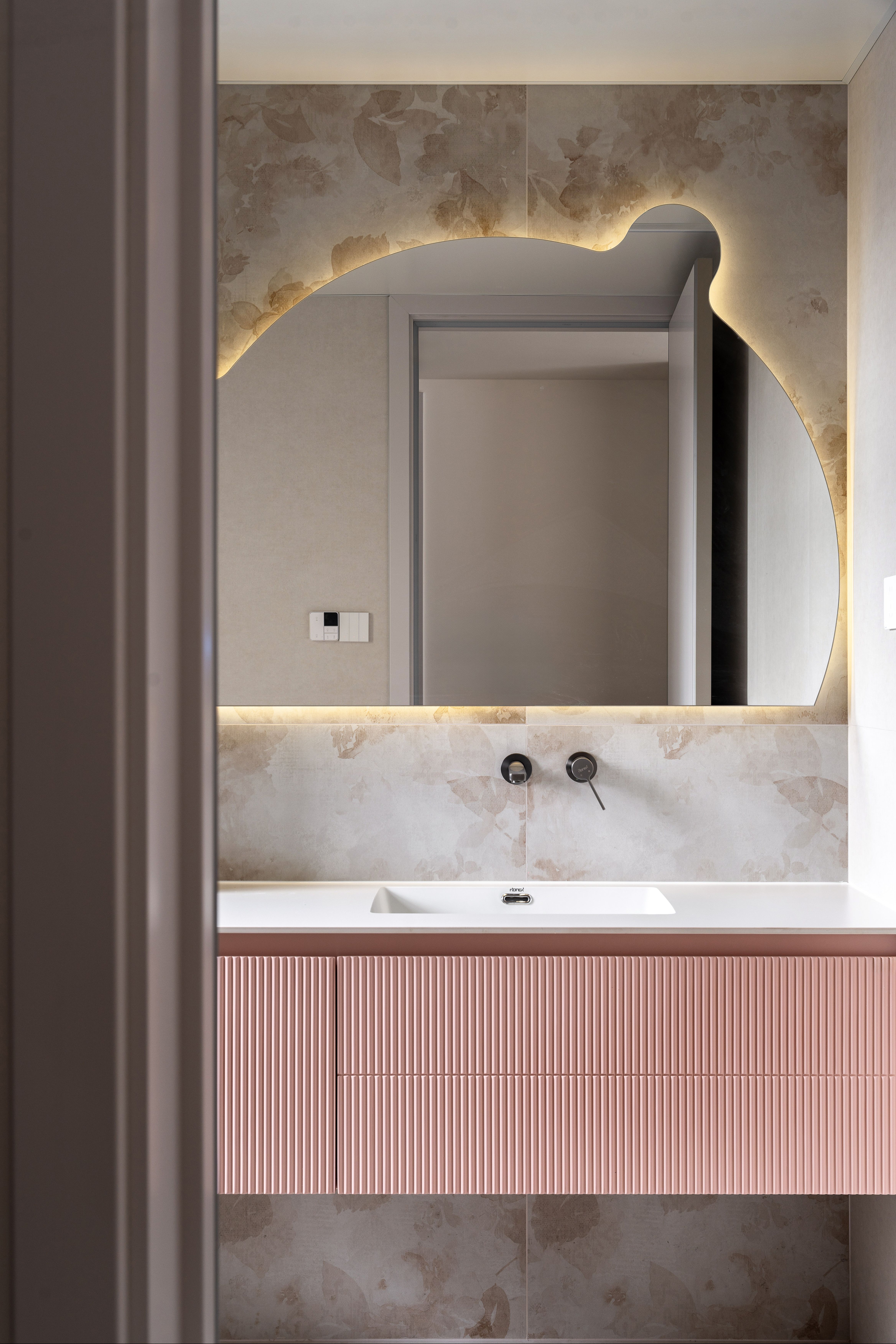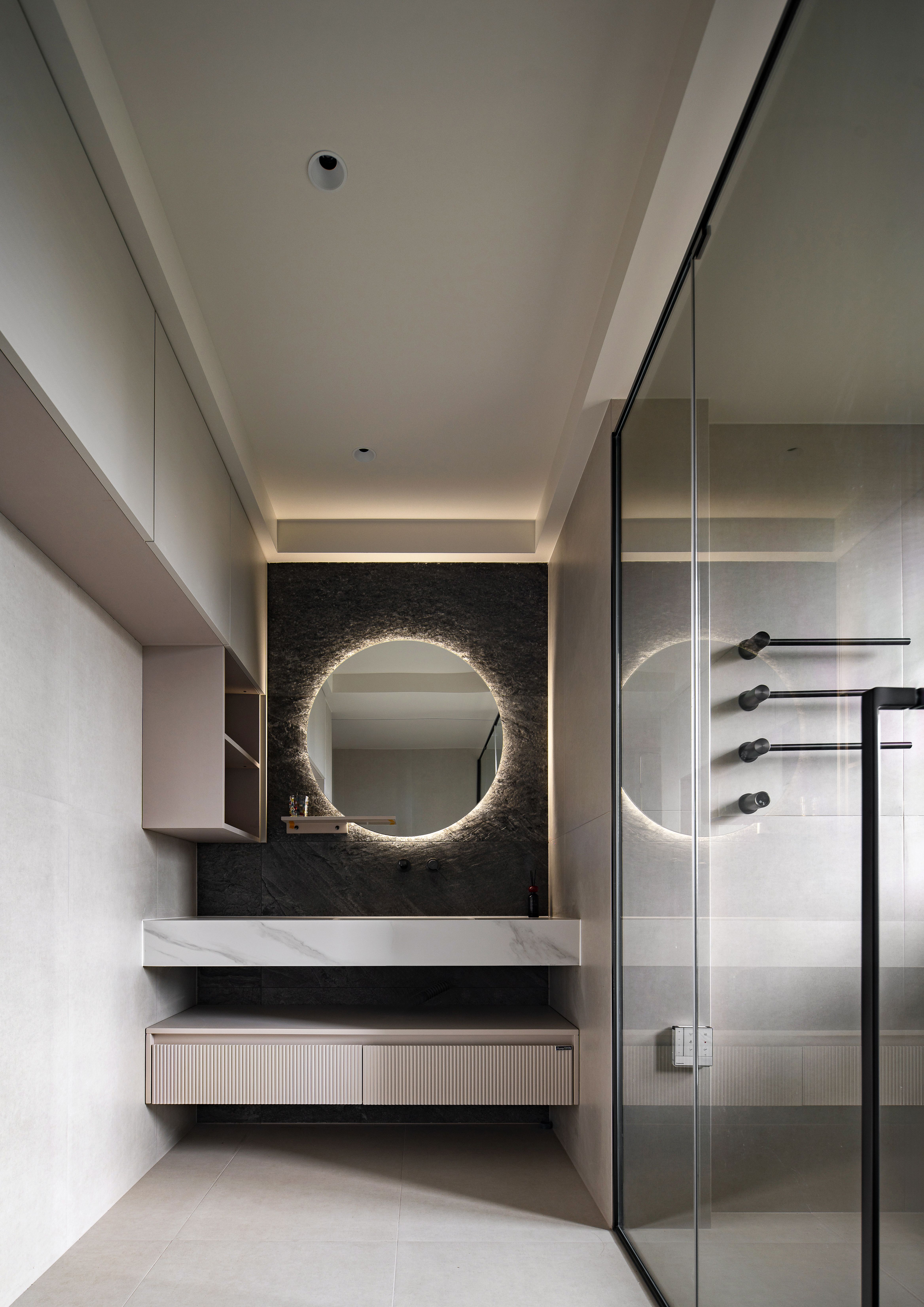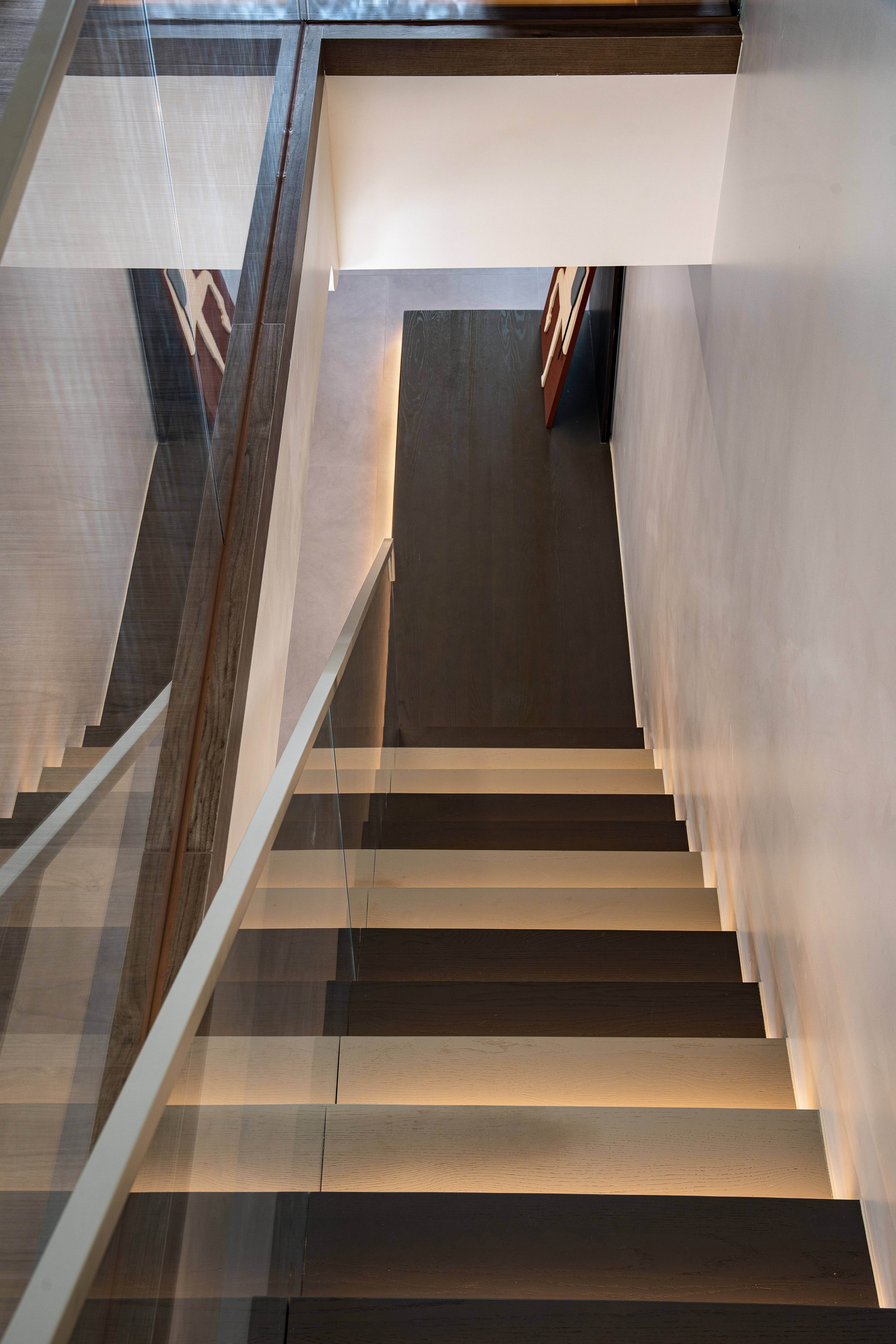 故事的链接处, 改变原本的出处, 以悬浮的突出, 均衡空间的诗意。 层层台阶处, 是不同气质的材质, 木质的古朴温润, 岩板的现代柔和, 玻璃的纯净透明, 交织出独有的韵律。
