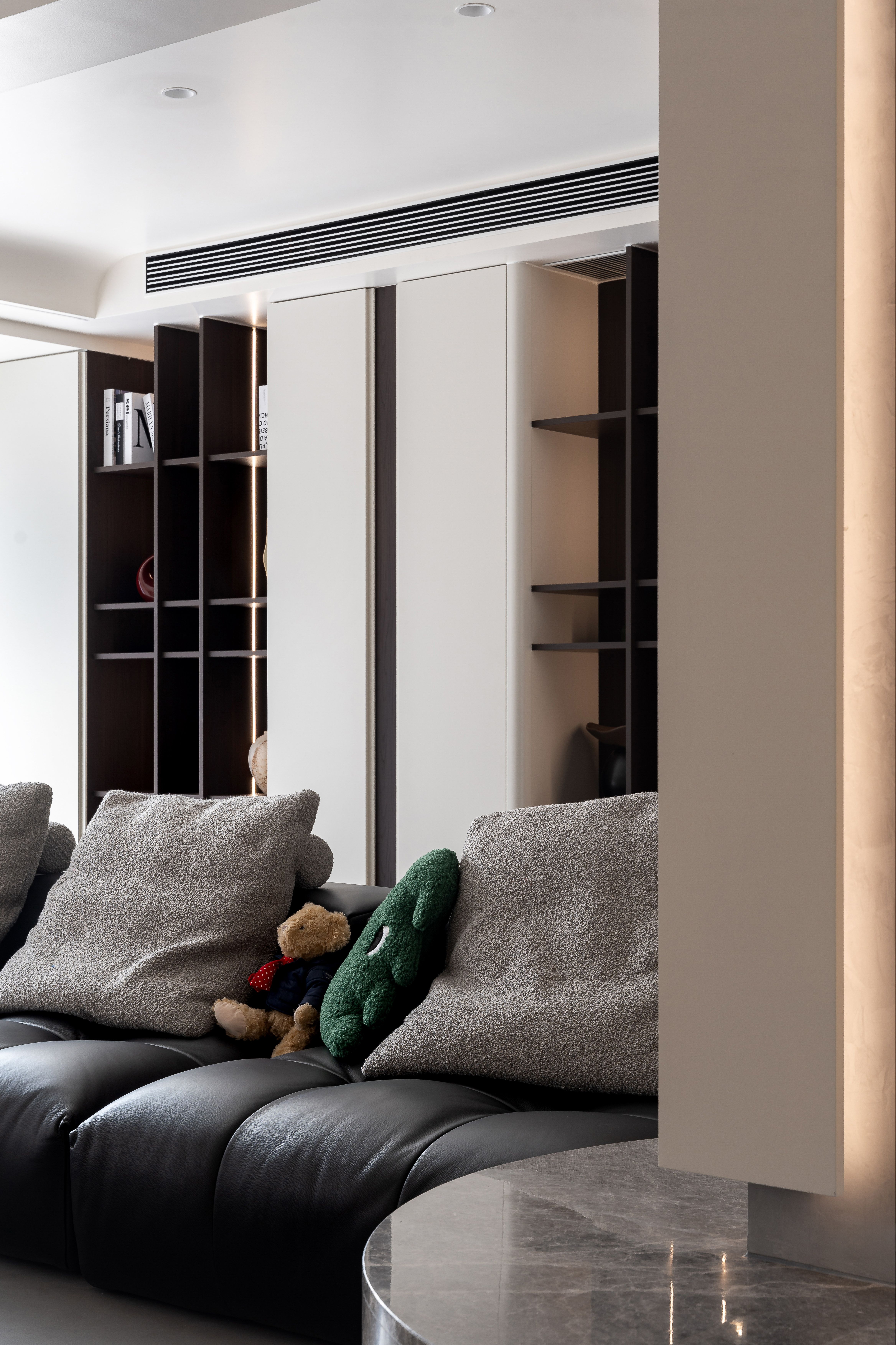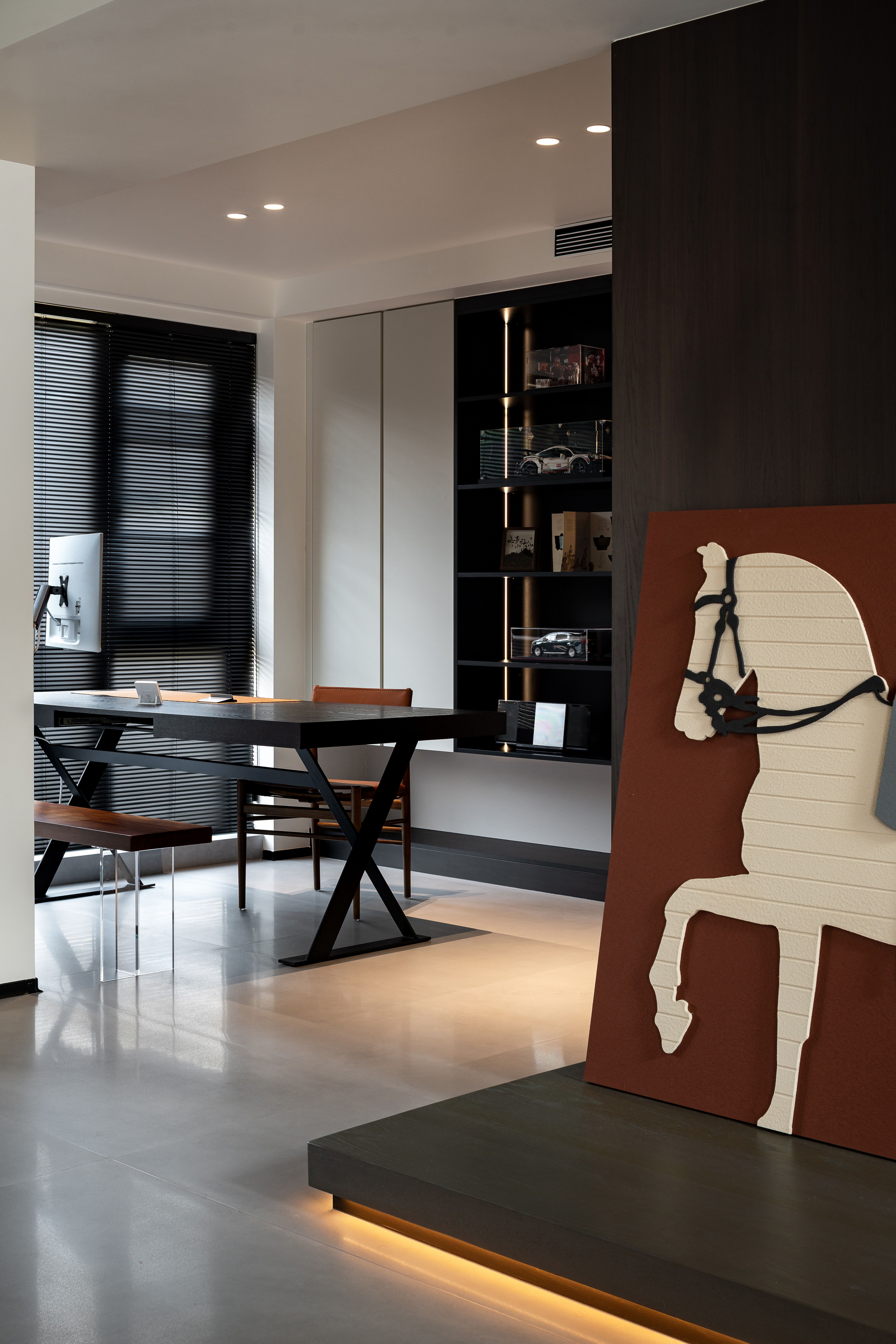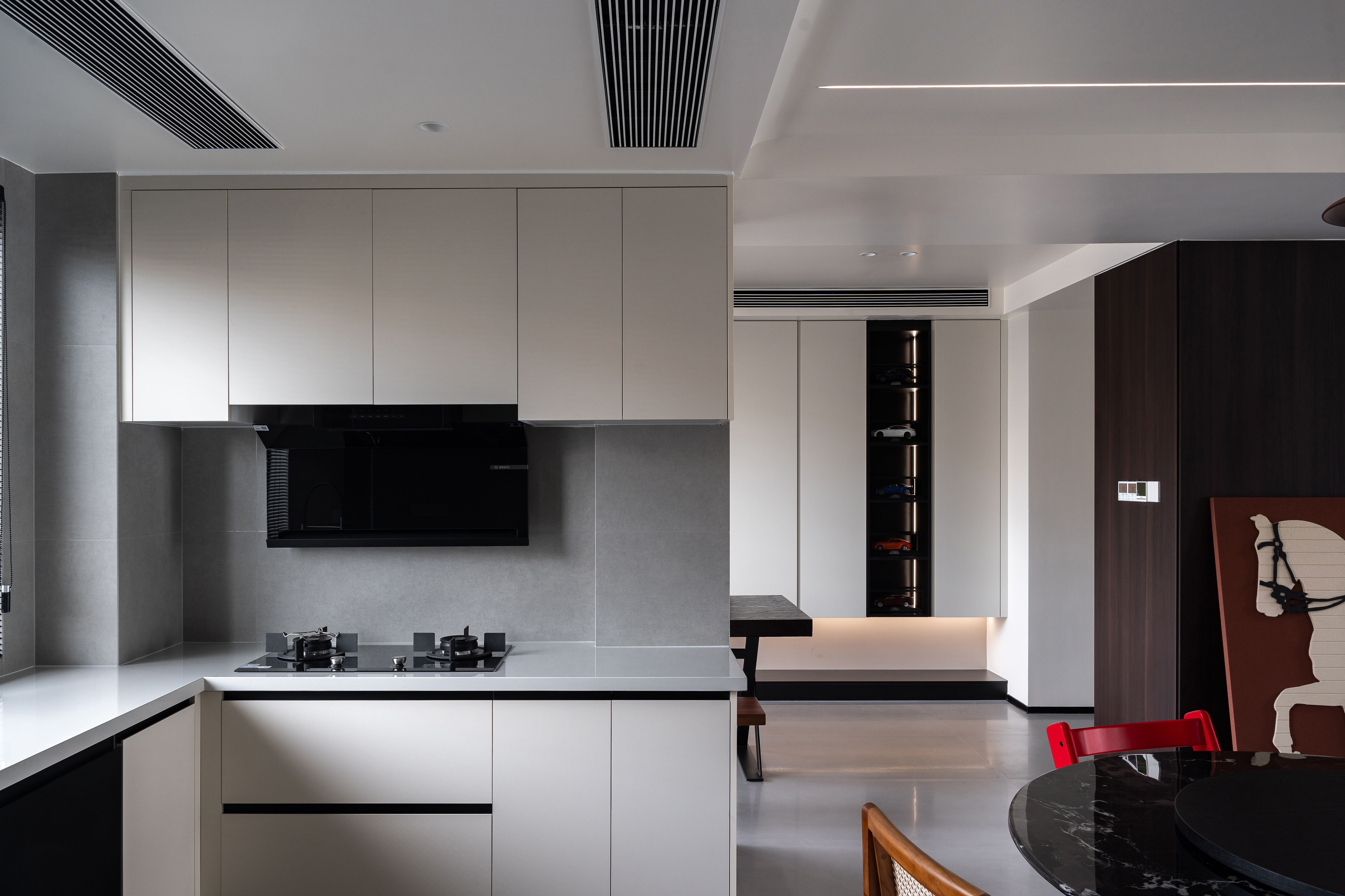 故事的章节, 点缀了中古家具, 贯穿的LDK设计, 通透的空间格局, 跳色的活跃, 在展示柜中摆放的车子, 确实是业主事业的名词。 起承转合自然融合, 一点一点丰富家的想象。