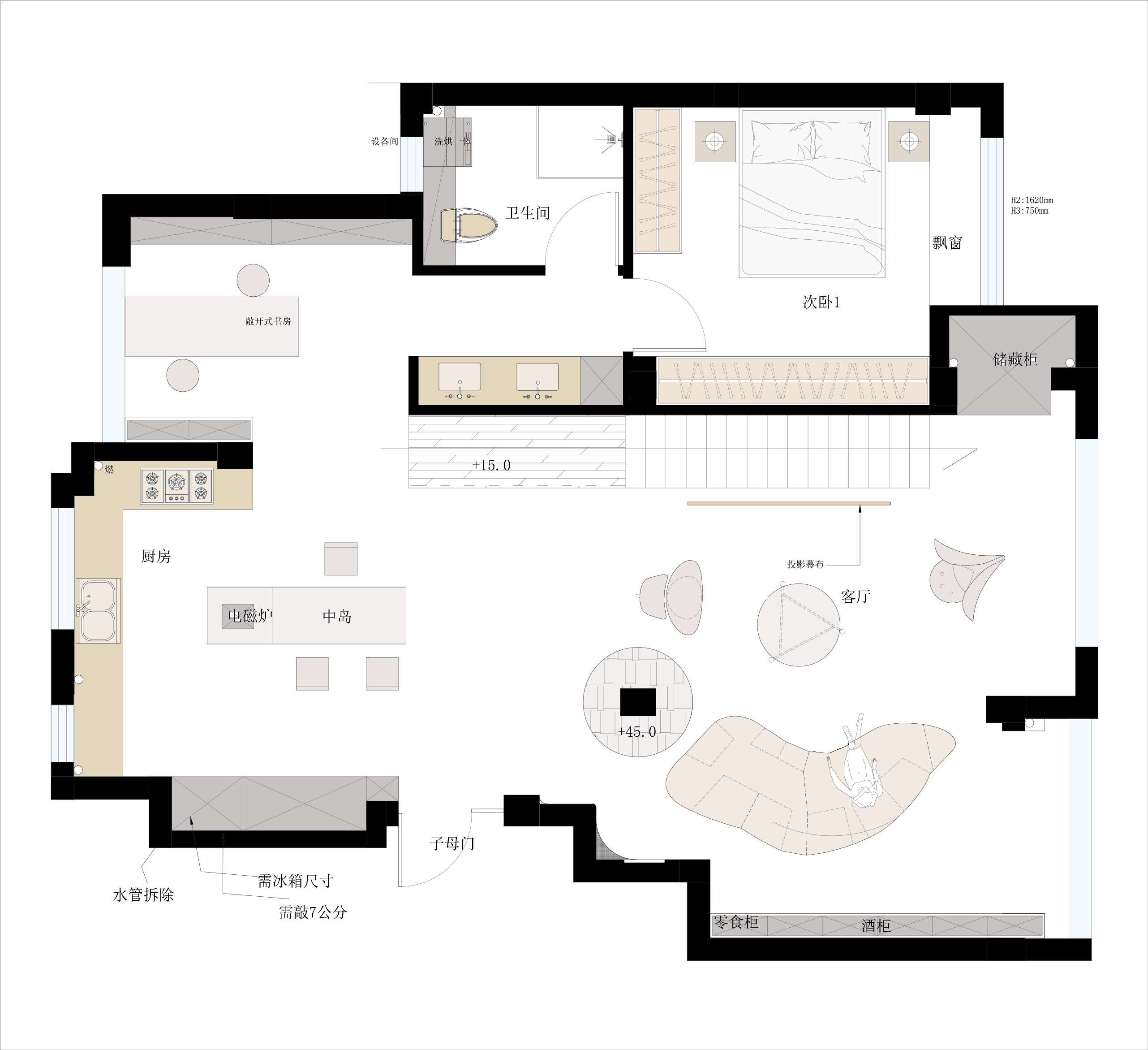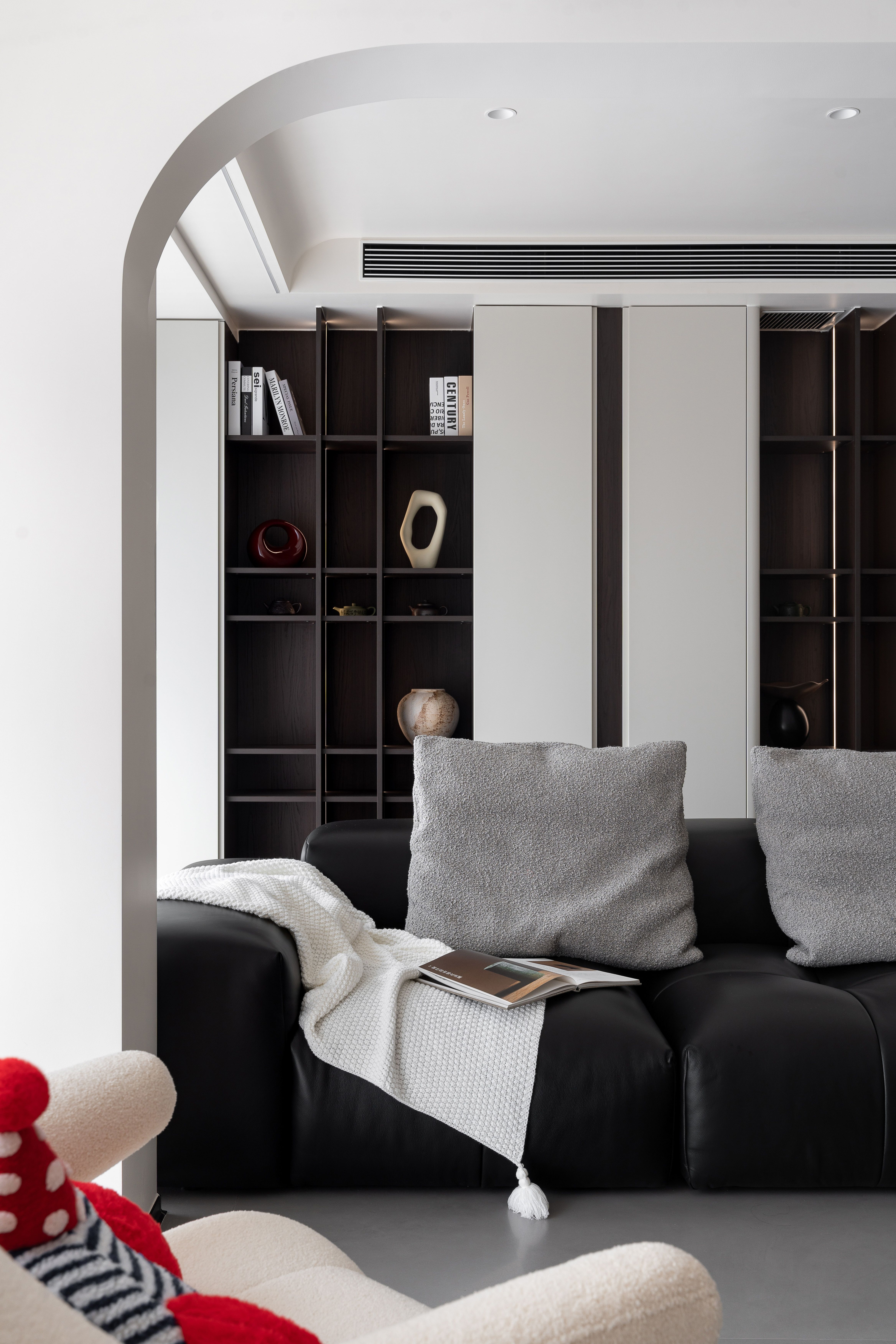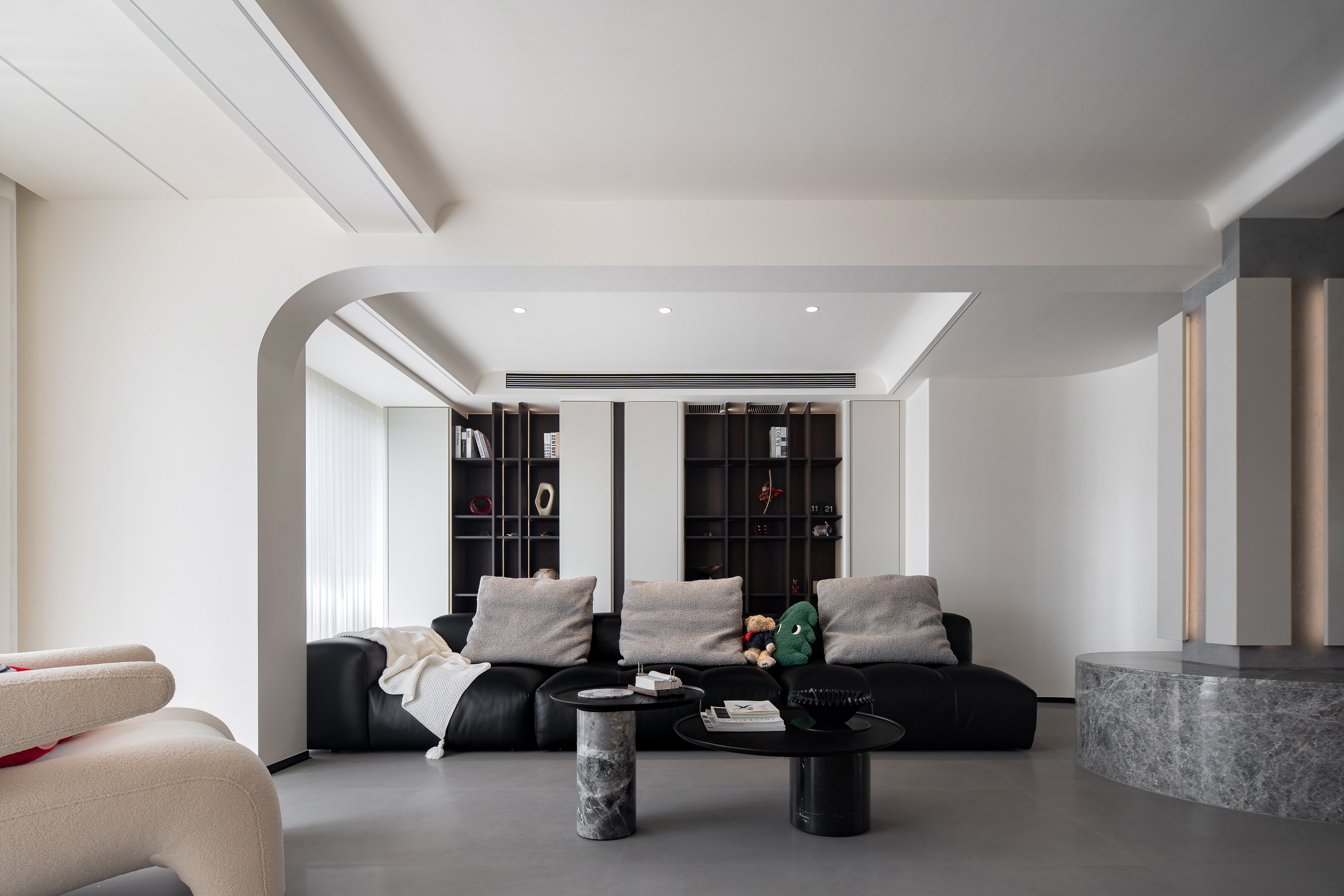 故事的开头, 在错综的梁柱关系, 在黑白的色调铺陈, 在起伏的情绪表, 我们尊重空间本质, 我们弱化房梁存在, 承重柱上的水磨石, 弧角天花曲面墙体, 修饰,装饰,布置, 一步步具象家的样子。