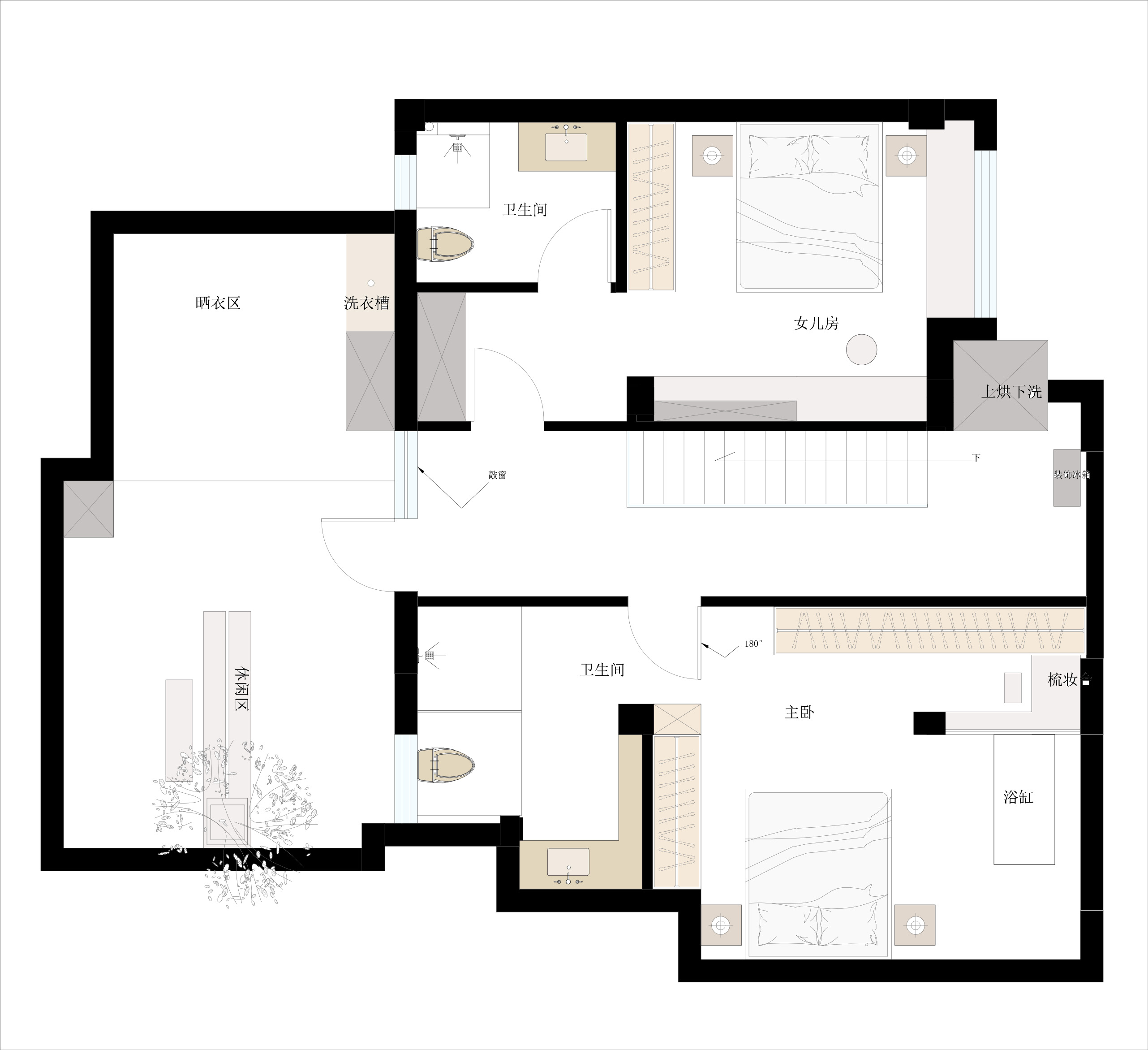 项目定位:以顶层复式的物理属性为依据,尊重其开阔视野与双层结构,结合家庭分区需求做理性规划;同时契合居住者对美观时尚、细节匠心的精神诉求,以光与风为载体,打造承载情感的高端人文居所。