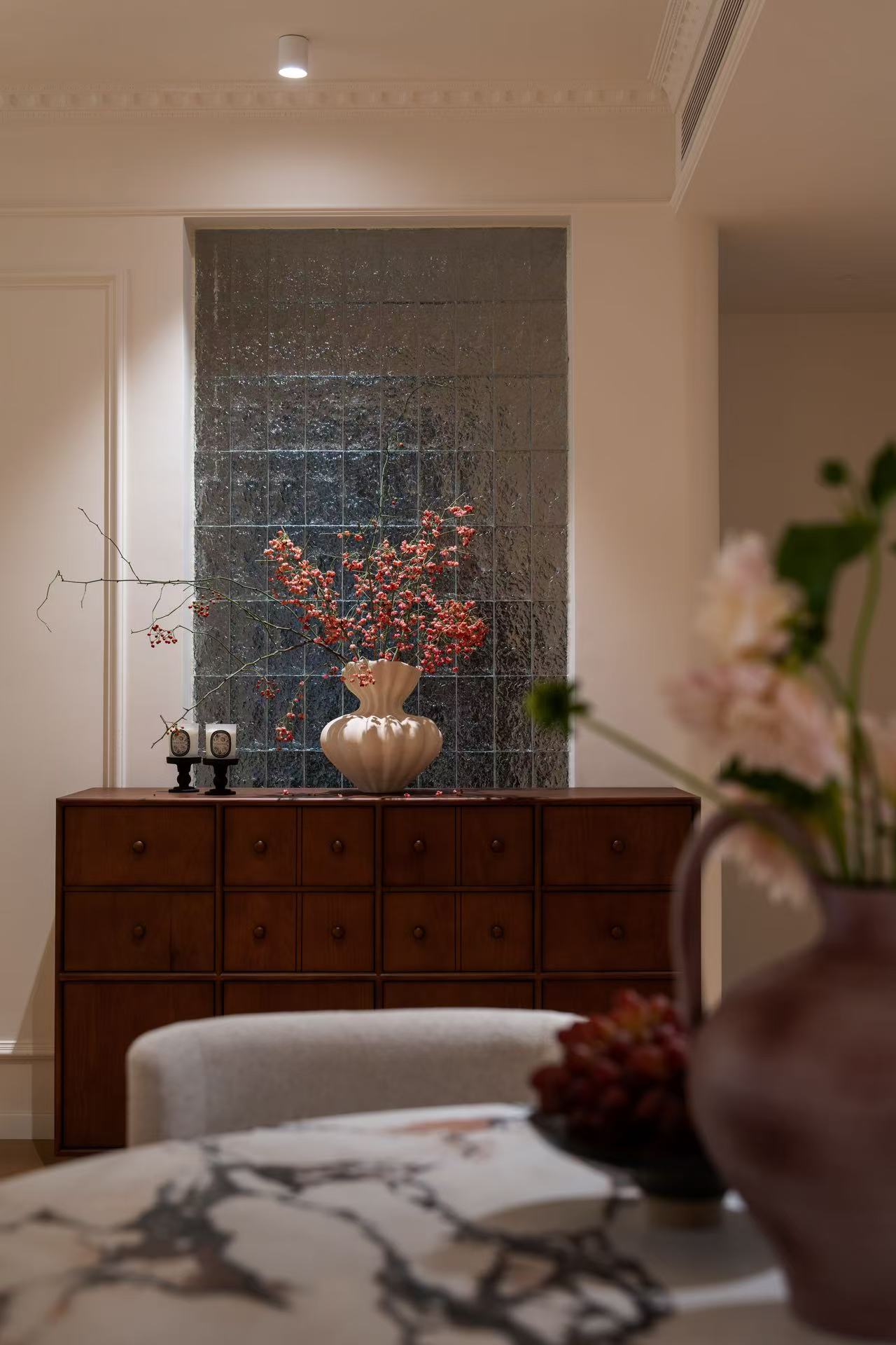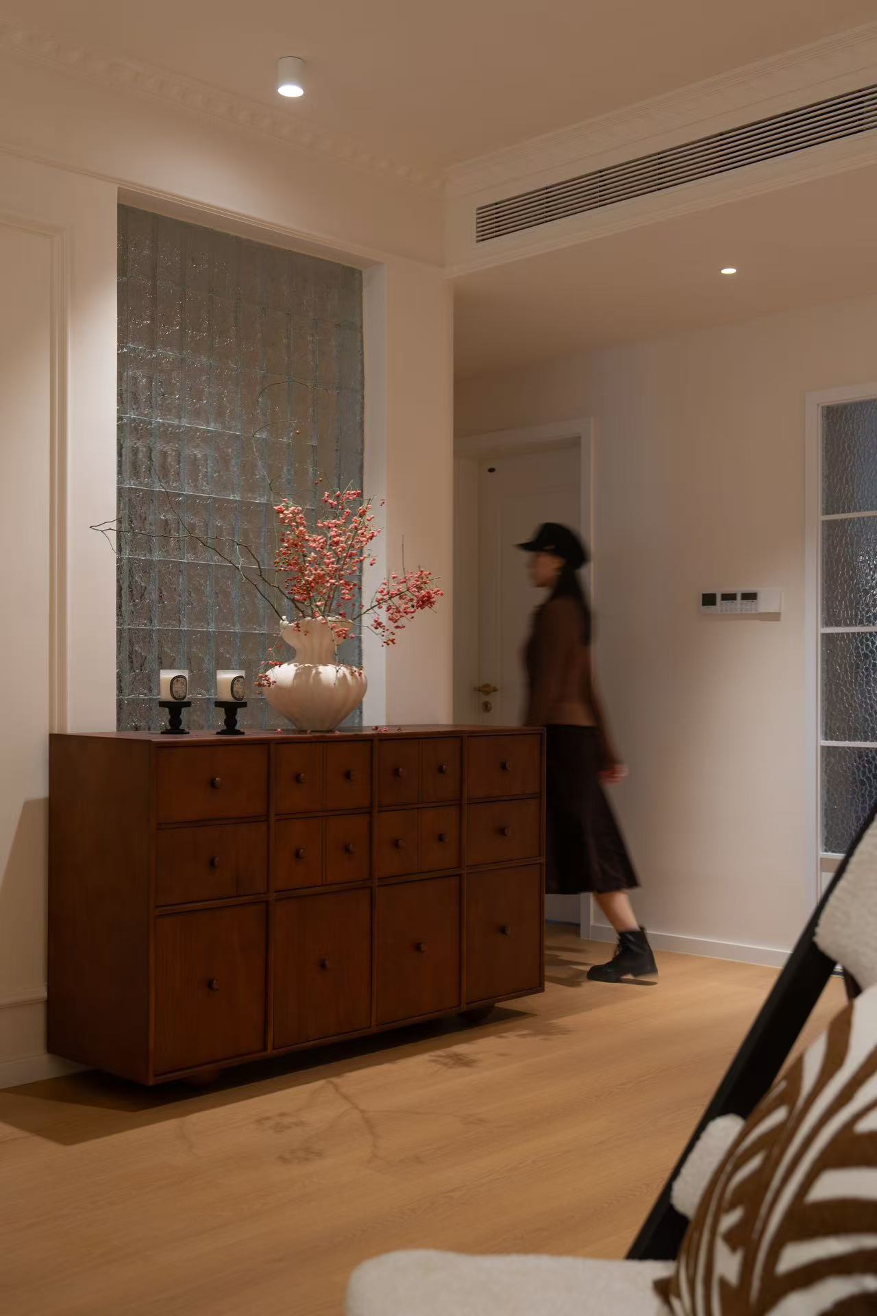 在设计中保留了原基础的玄关处玻璃,不做颠覆性改造,在轻法式风格基础上优化空间功能与美感.