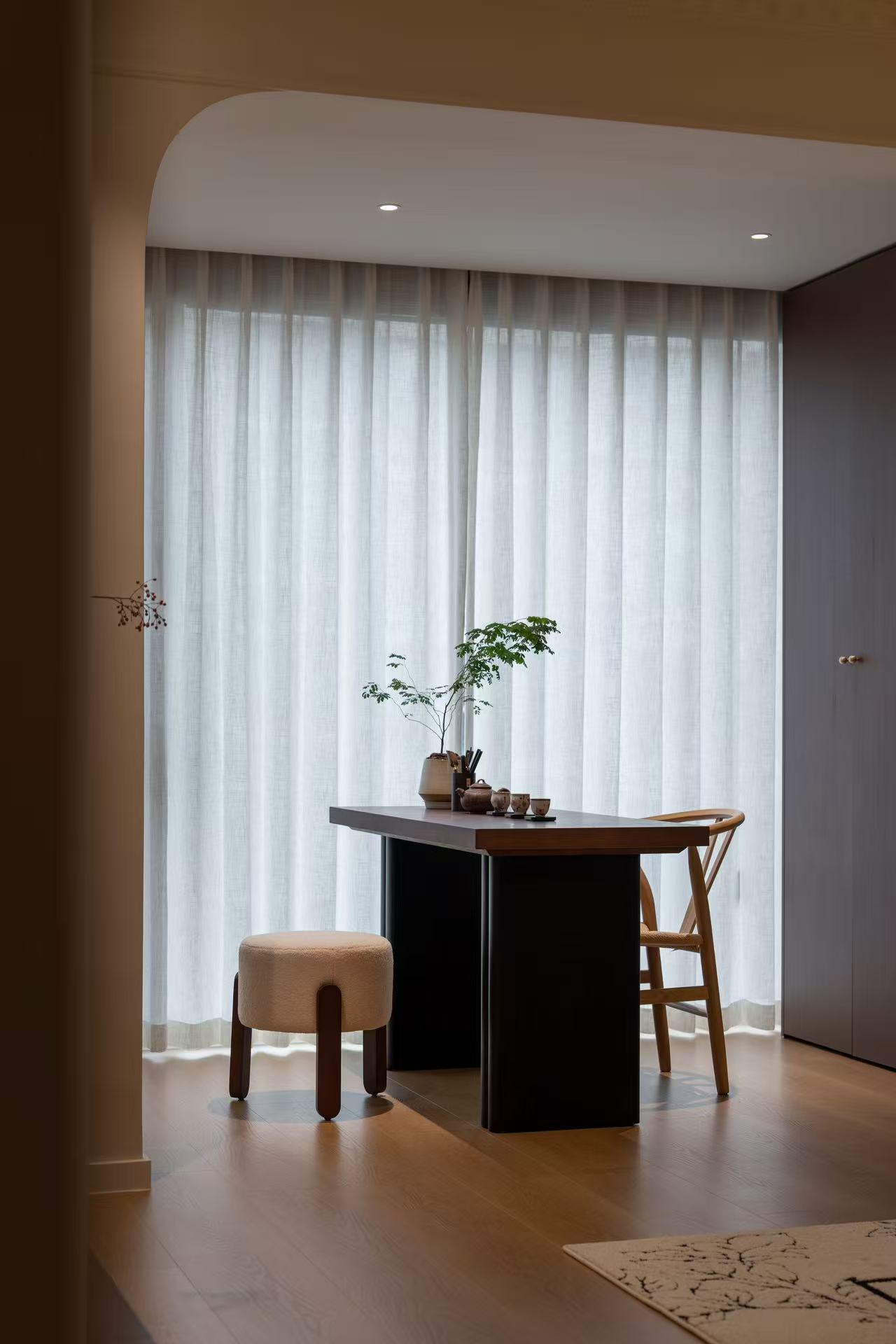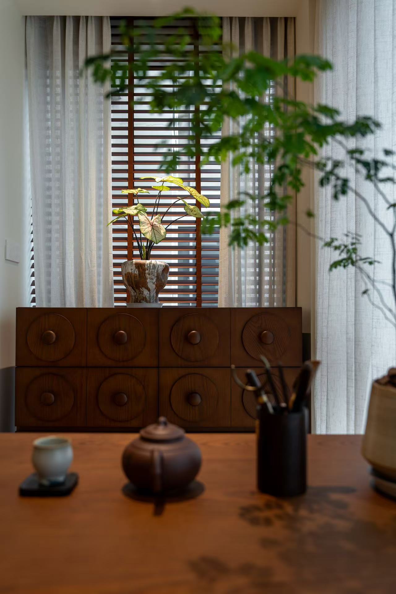 阳台茶柜不仅有禅意氛围,还兼顾了储物功能,为屋主提供休闲品茗的空间,一侧安排了成品的装饰矮柜,让屋主能在这个空间中,感受到快乐与满足。