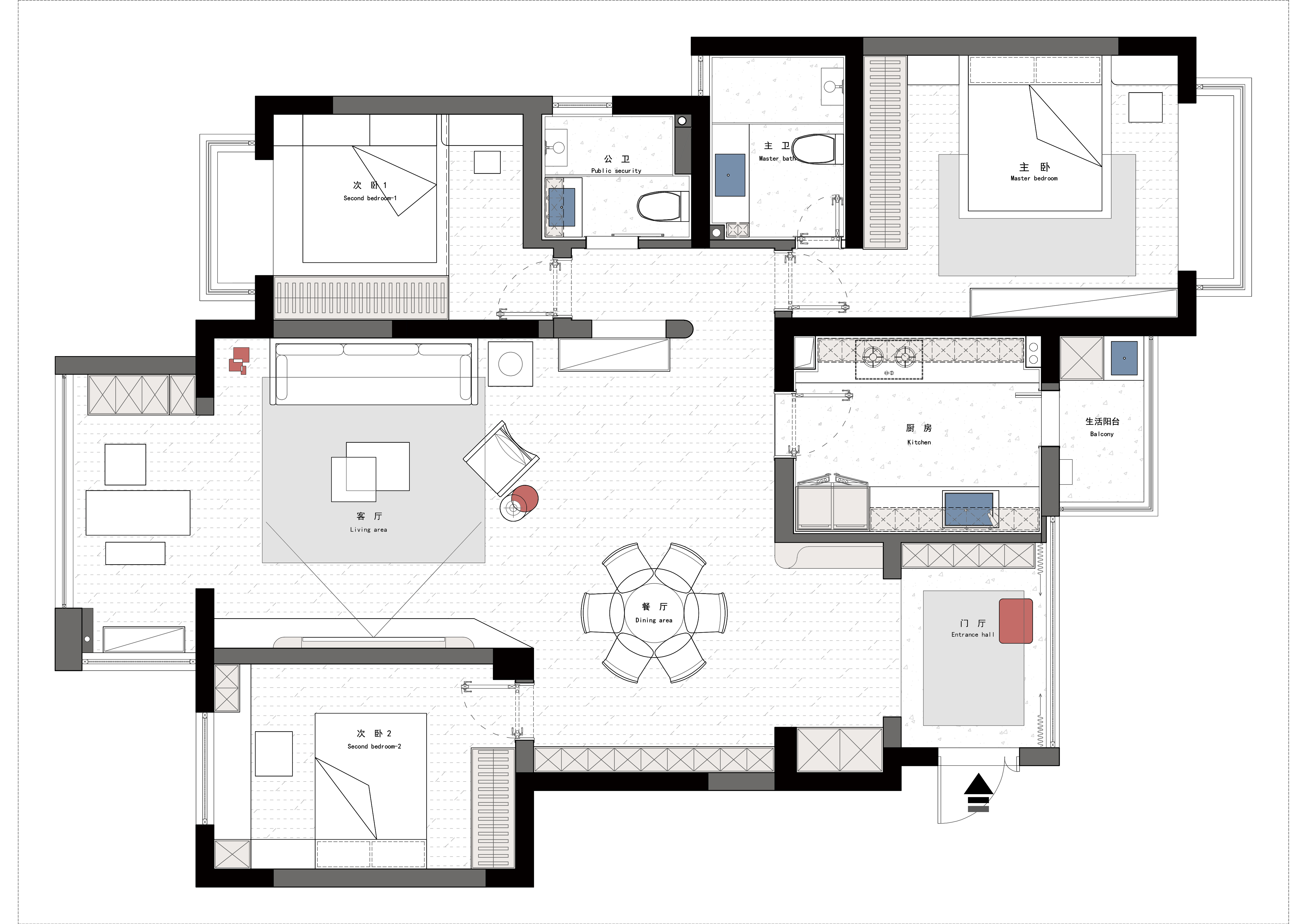 以“保留习惯+功能优化”为核心: 动线:延续原居住动线,各空间衔接顺畅,契合业主日常行为惯性; 功能:客餐厅开放式布局增强通透感,次卧设地台+整柜提升储物,厨房连生活阳台补操作区,玄关实现“换鞋-收纳”一体; 细节:主卧配独立卫浴保障私密,公共卫浴靠近次卧1提升使用效率,空间划分兼顾实用与生活记忆延续。