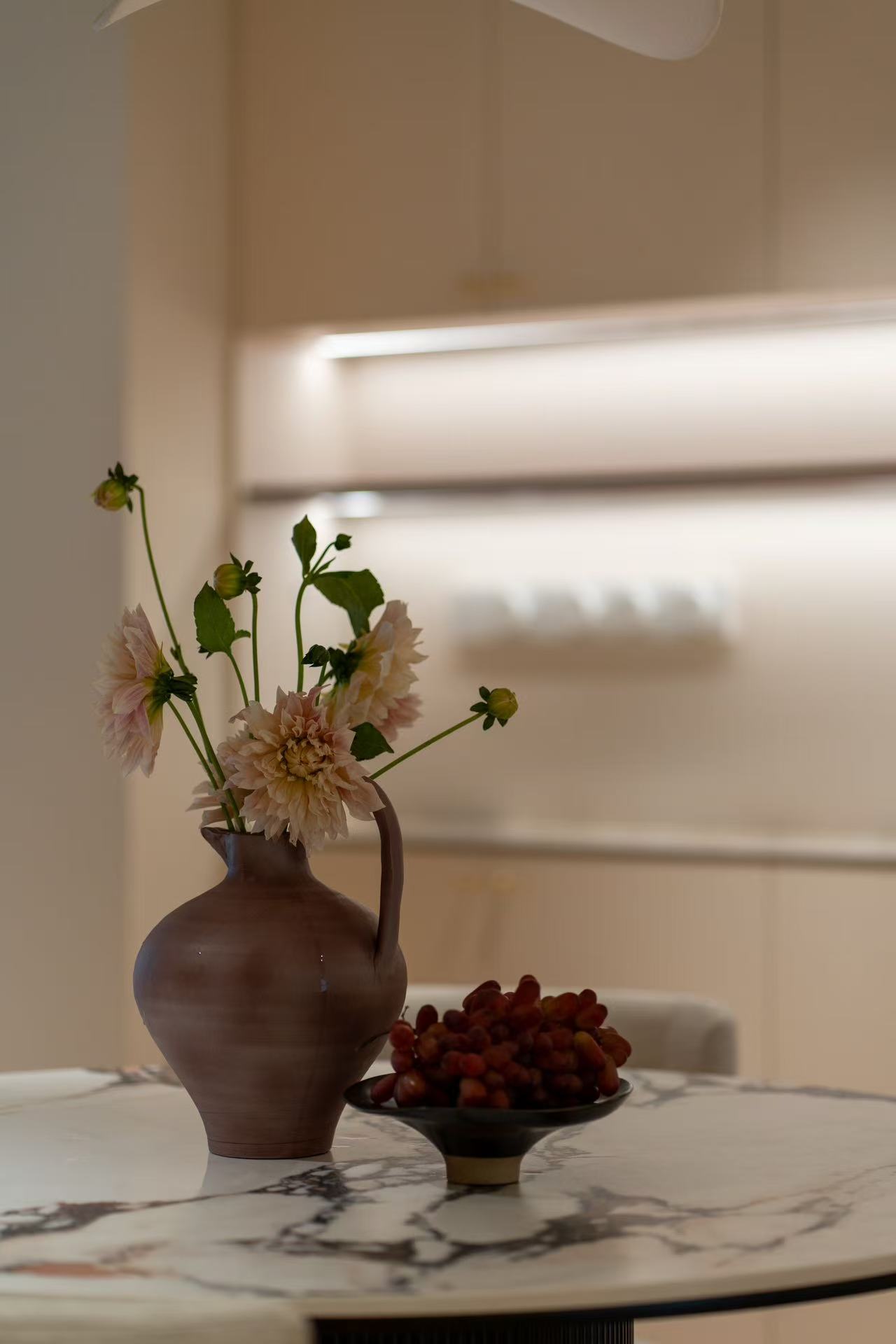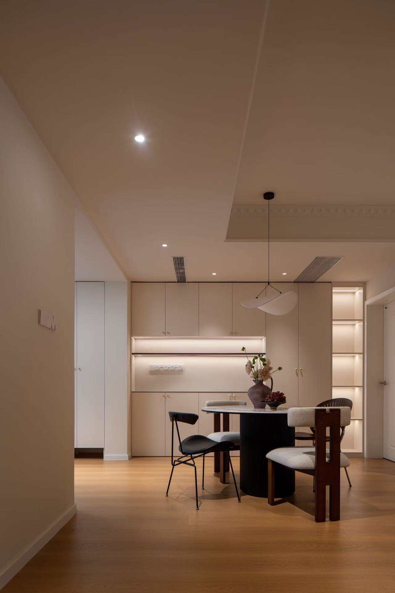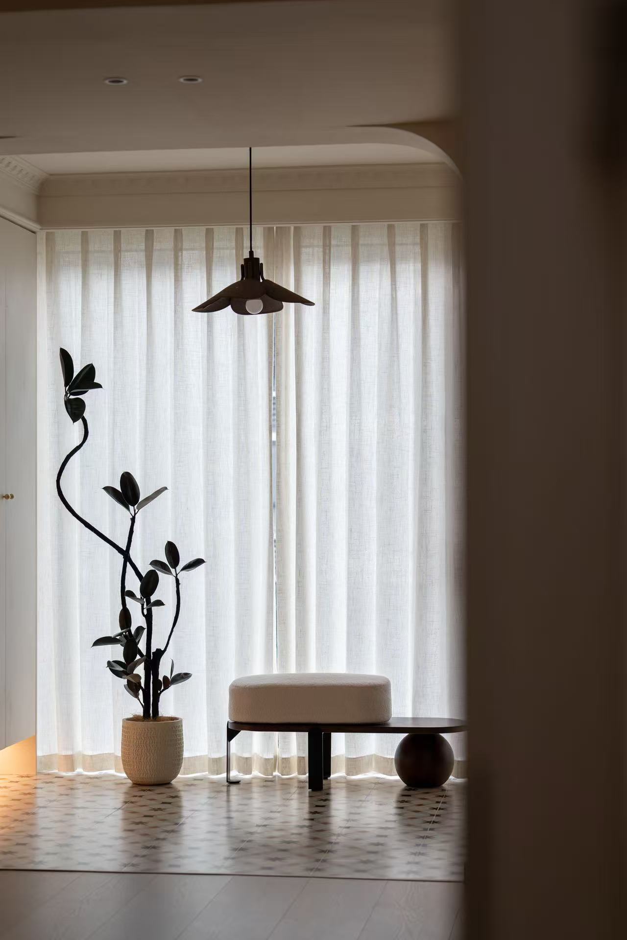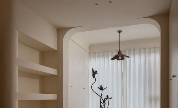 质感表达:玄关地砖选用带有特色花色的款式,搭配拱形线条与弧形壁龛,增添空间精致感;室内线条平直整齐,兼顾柔缓氛围与力量感,整体质感既显艺术气质,又不脱离日常居住的实用性。