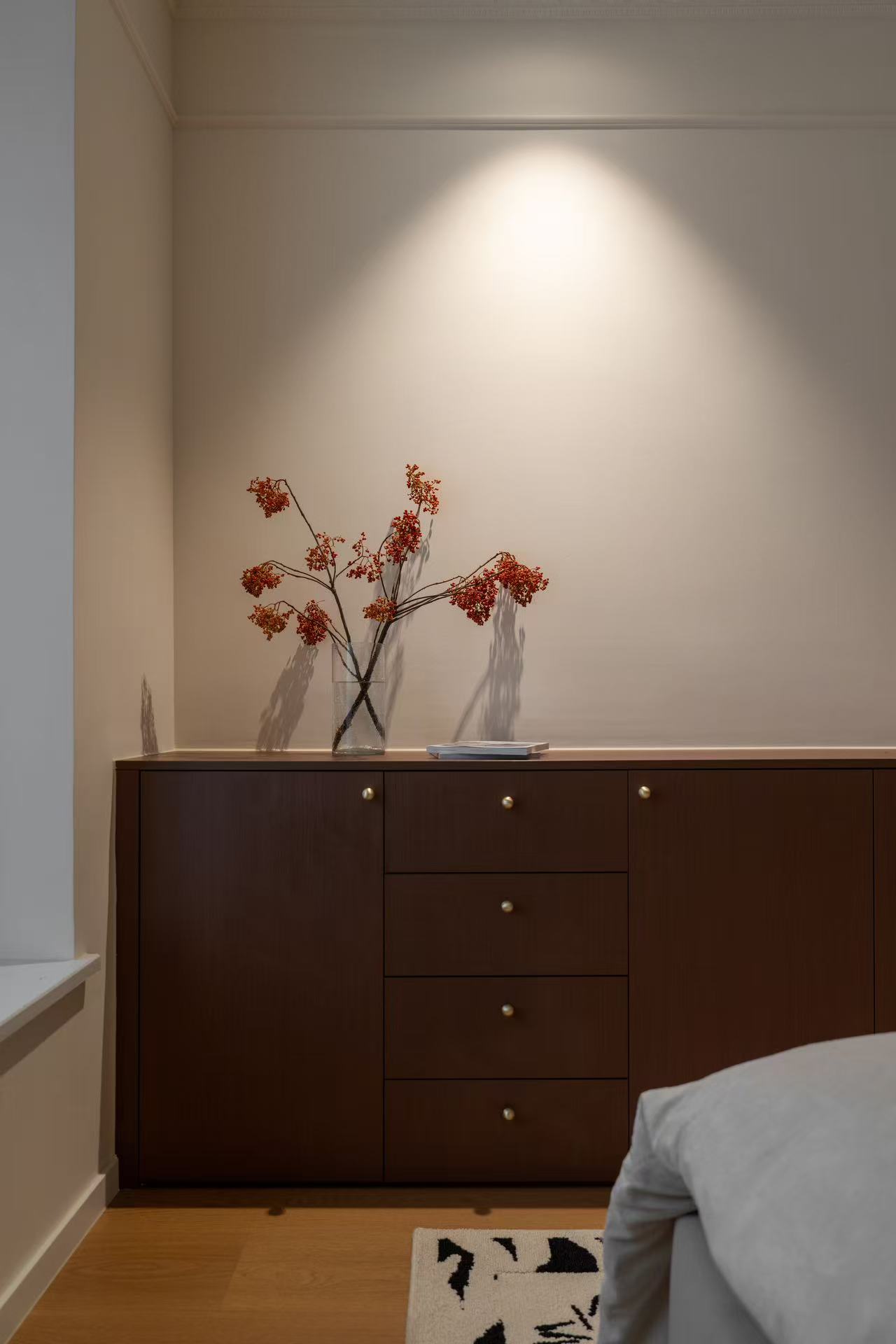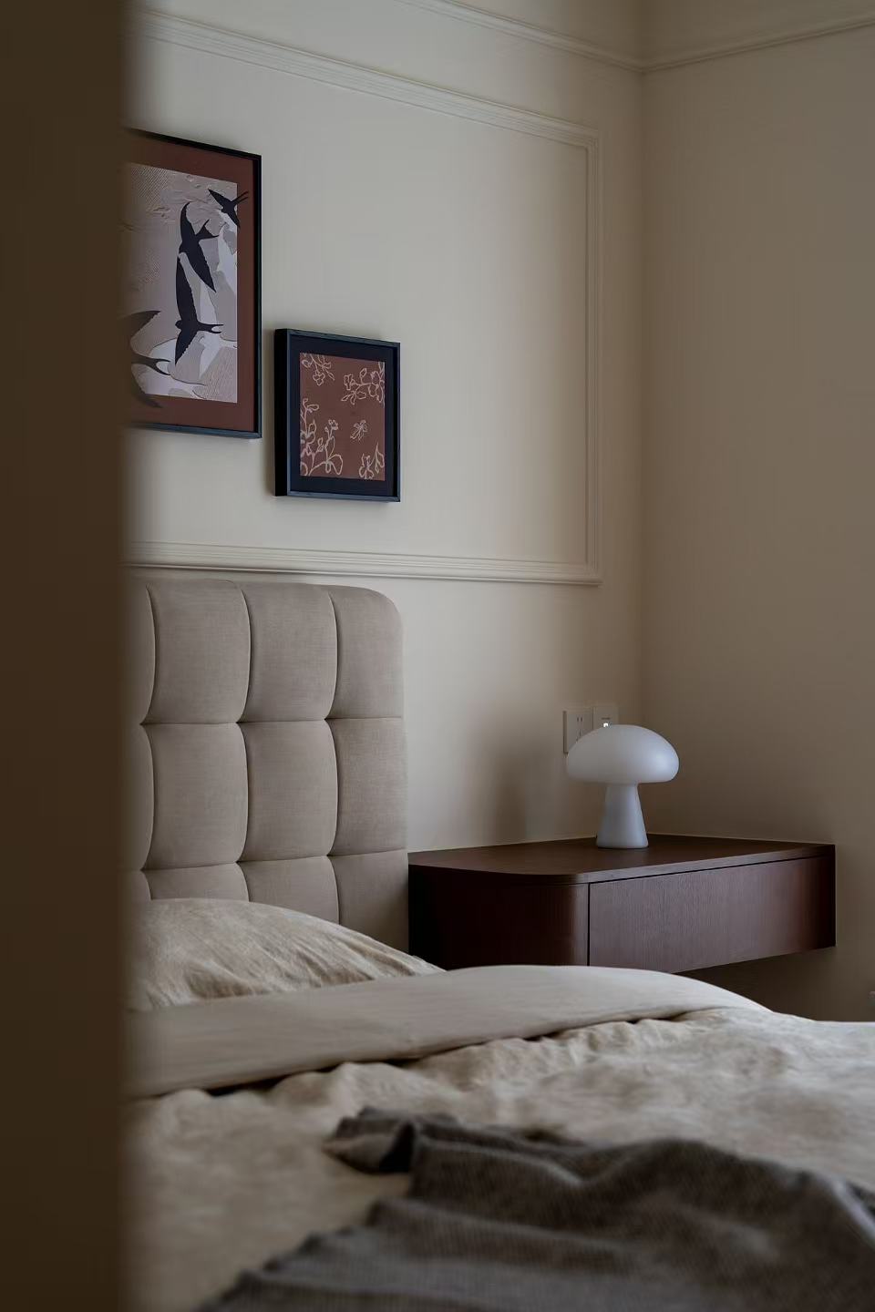卧室则以静谧、舒适为设计主旨,采用隔音性能良好的材料,打造安静的睡眠环境。搭配柔软的床品、温馨的床头灯以及定制的衣柜,满足业主的睡眠和收纳需求。在场景设计的创新点上,打破“二手房改造必大改”的惯性思维,通过保留业主熟悉的生活元素(如玻璃玄关),在场景中融入情感记忆,实现“功能升级不割裂习惯”。阳台茶柜将“禅意氛围”与“储物功能”结合,次卧梳妆台兼顾“梳妆”与“临时办公”,以“一空间多用途”的创新设计,提升小空间的实用性与灵活性。 -