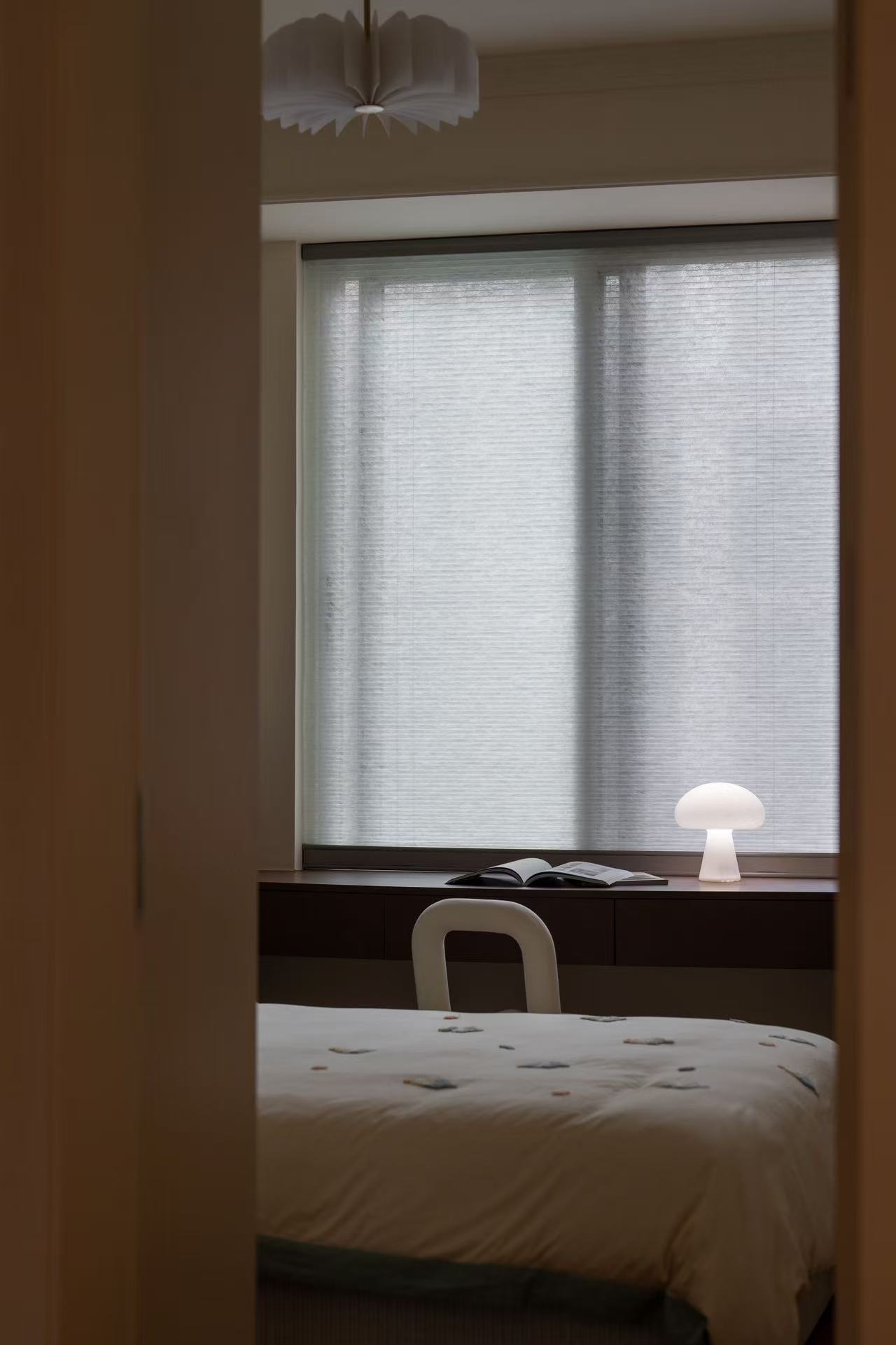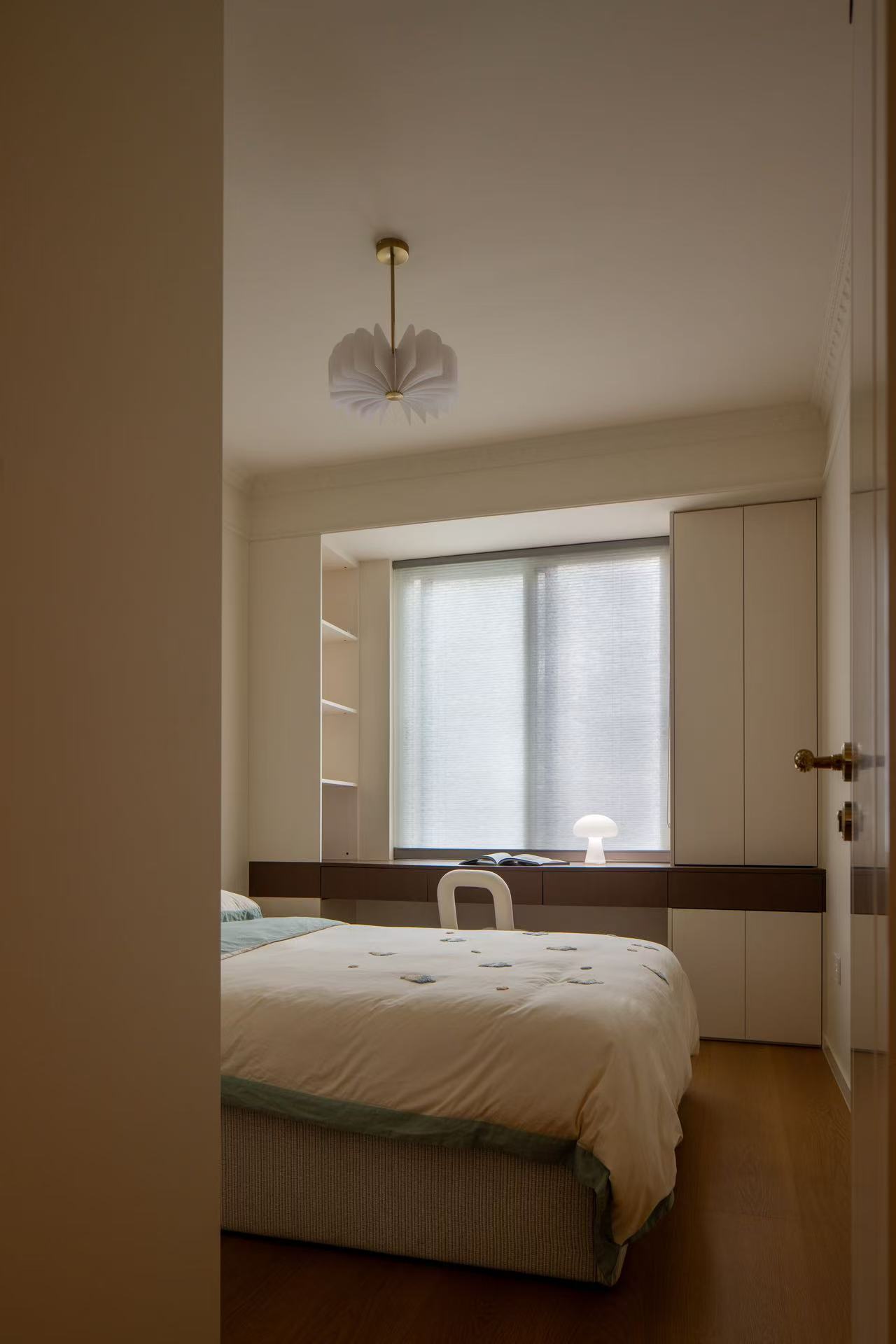 次卧室做了地台直接代替常规床,床尾的整面柜子保证了整个房间的储物量,并且使有限的空间更加舒适。床边的梳妆台兼具了梳妆与临时办公的需求。