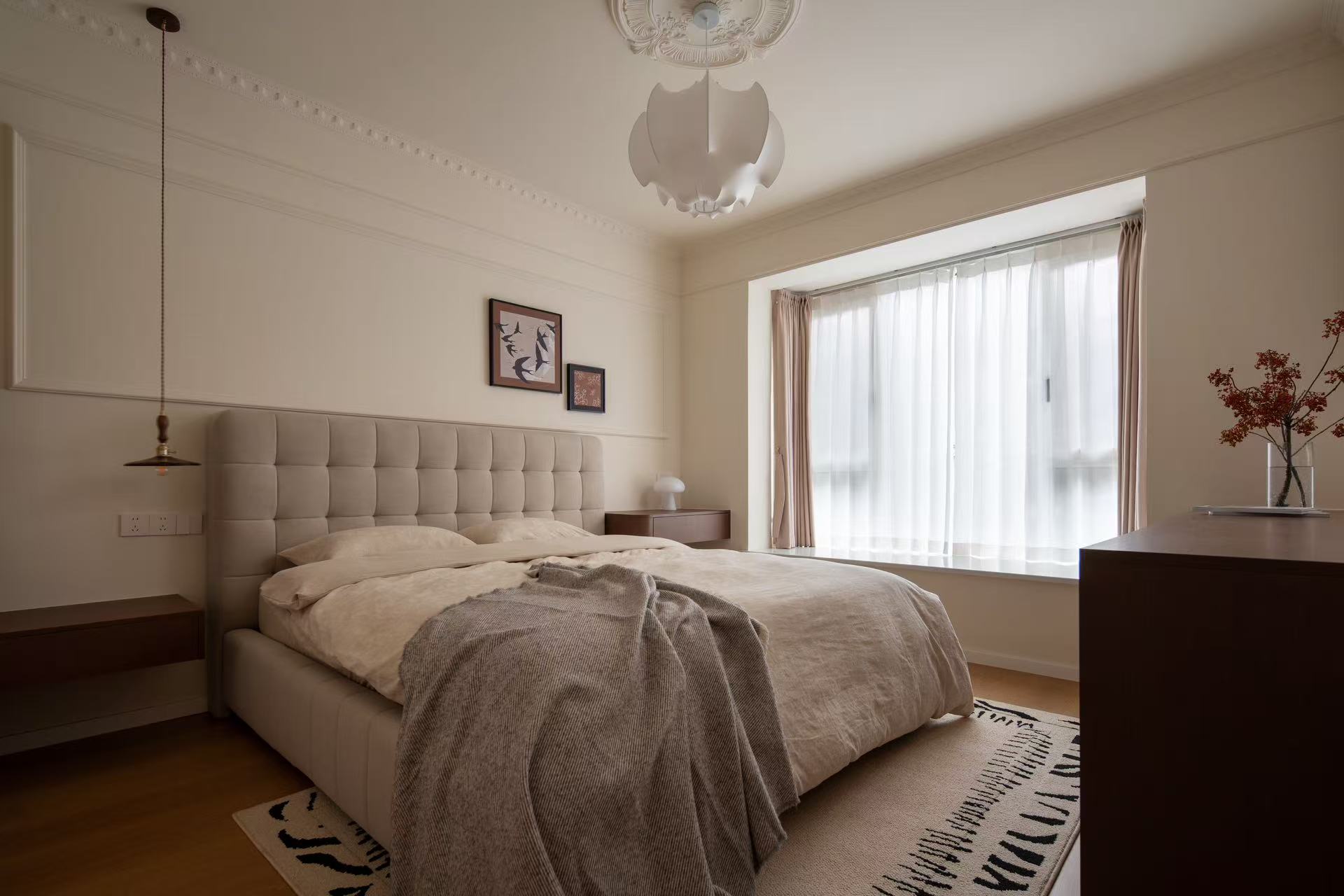 一个充满欧式风情、简约明亮,且温馨的主卧空间,有着优雅、舒适和自由的居住体验。