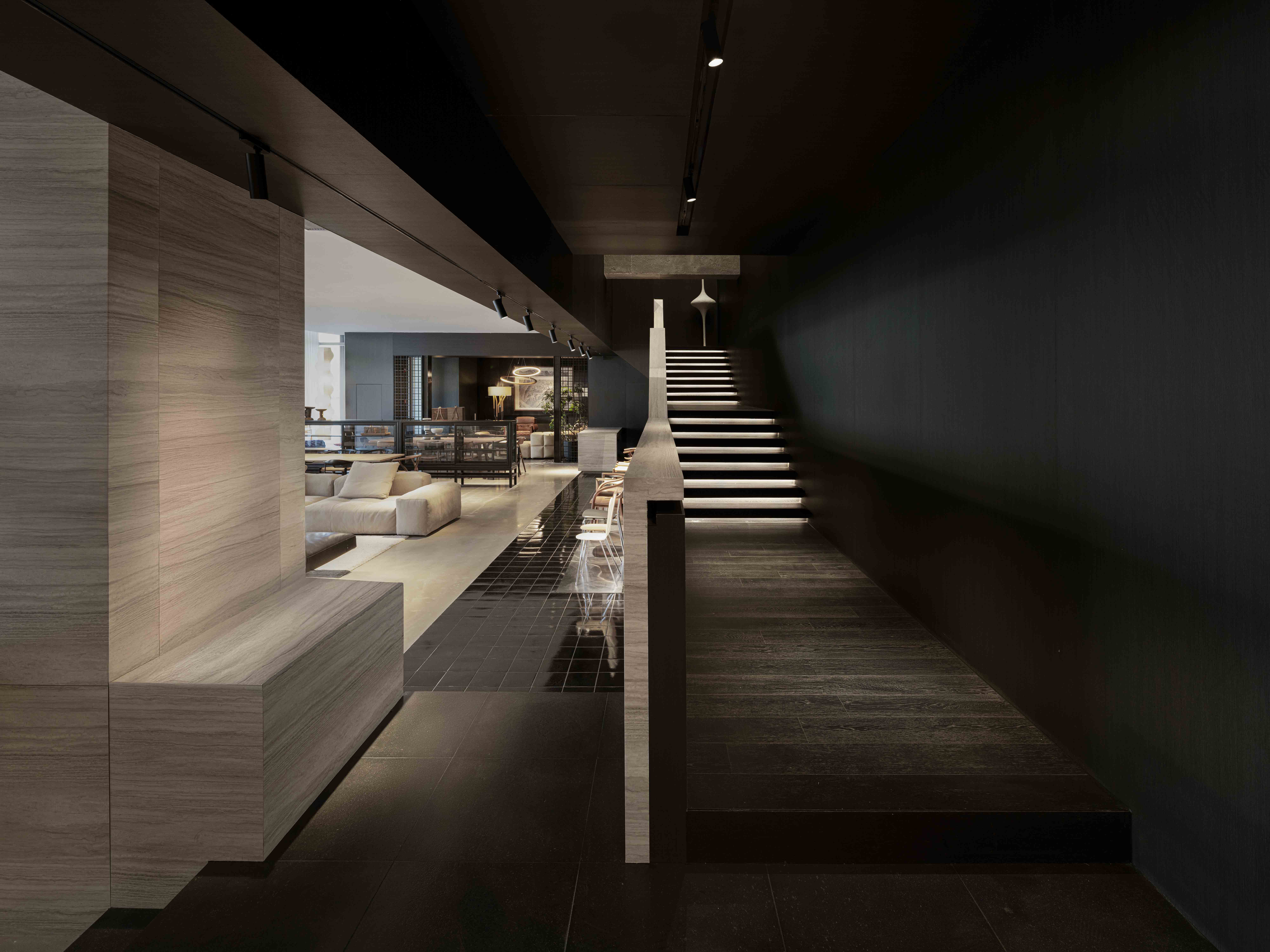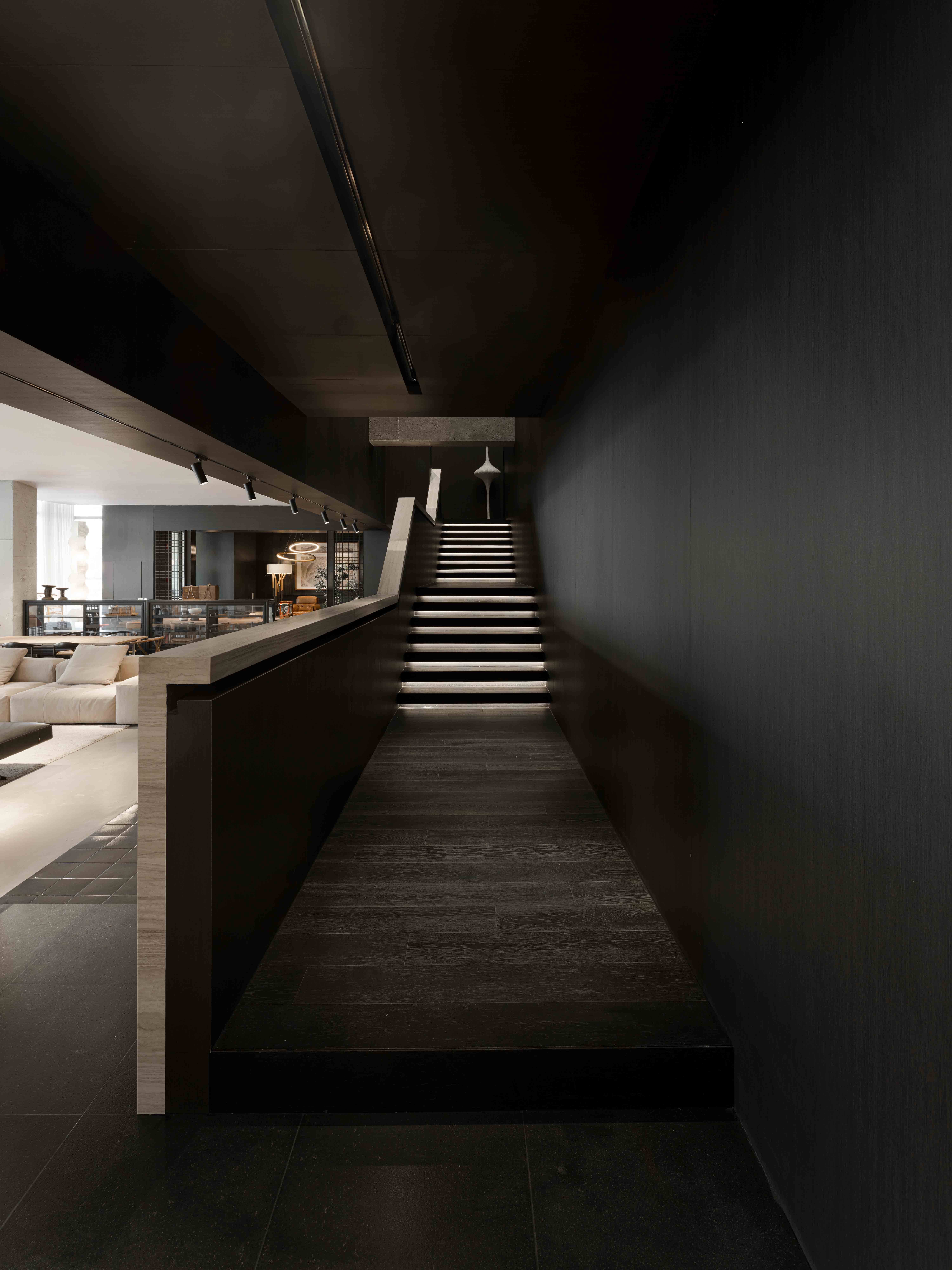 • 承 • 焦点: 一个贯通两层的黑色体量构成视觉核心,其内部一道极具雕塑感的楼梯蜿蜒而上,它不仅是连接垂直空间的枢纽,更是一个强烈的艺术符号,成为空间的记忆锚点。