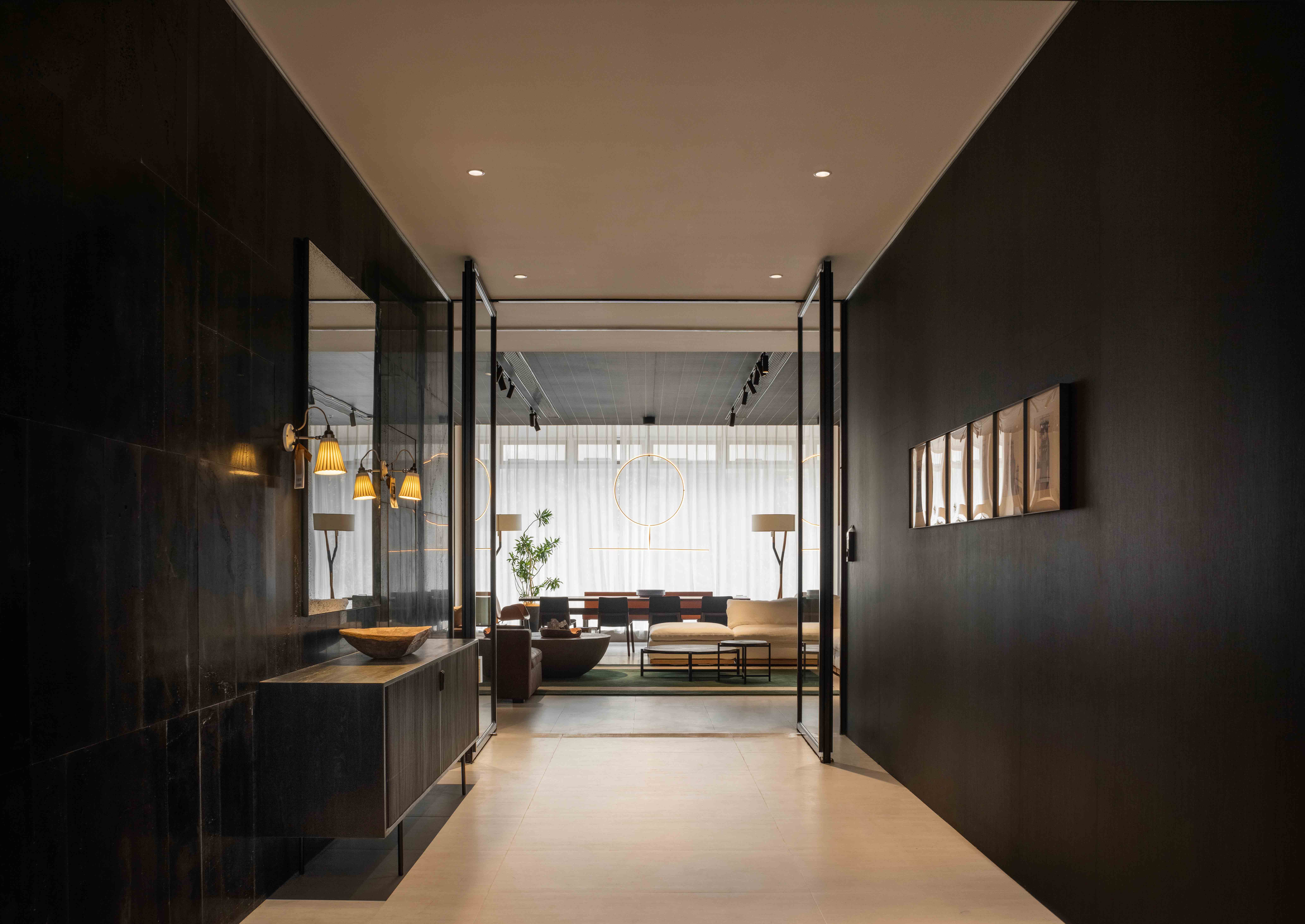 • 起 • 入境: 入口处匠心设置了一个沉静的“黑色空间盒子”,以幽暗的光线和沉稳的质感过滤外界喧嚣,柔和地将访客情绪过渡至专注、内省的“家”的状态。