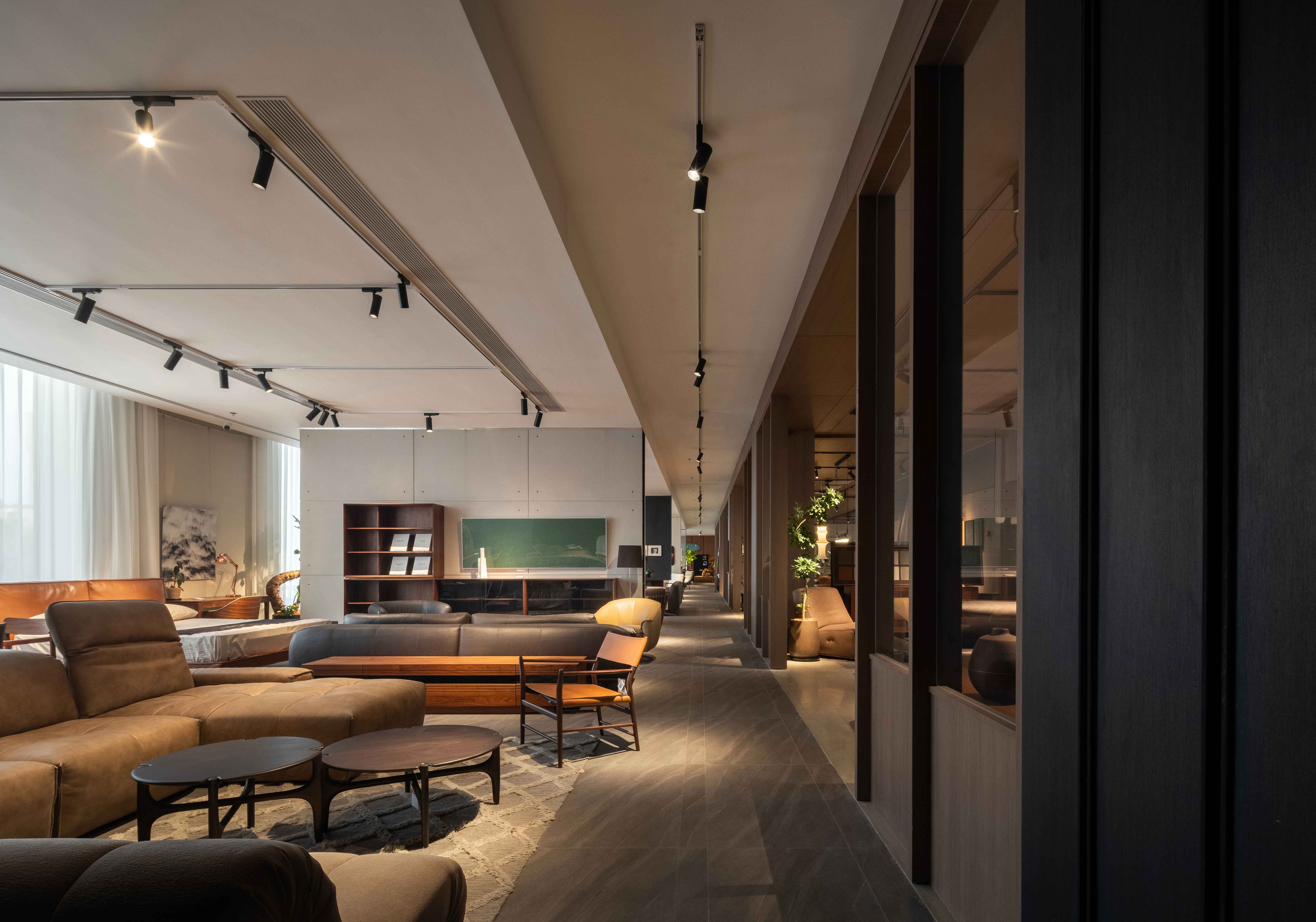 空间意境:设计的核心是一场“时空对话”。我们抽象提取南京的城市底蕴,并融汇江南古典园林“移步异景”的哲学,将2180平方米的空间转化为一幅可游、可观的立体长卷。访客的旅程不仅是挑选家具,更是在材质、光影与空间的起承转合中,感受历史与当代设计的静谧交融。