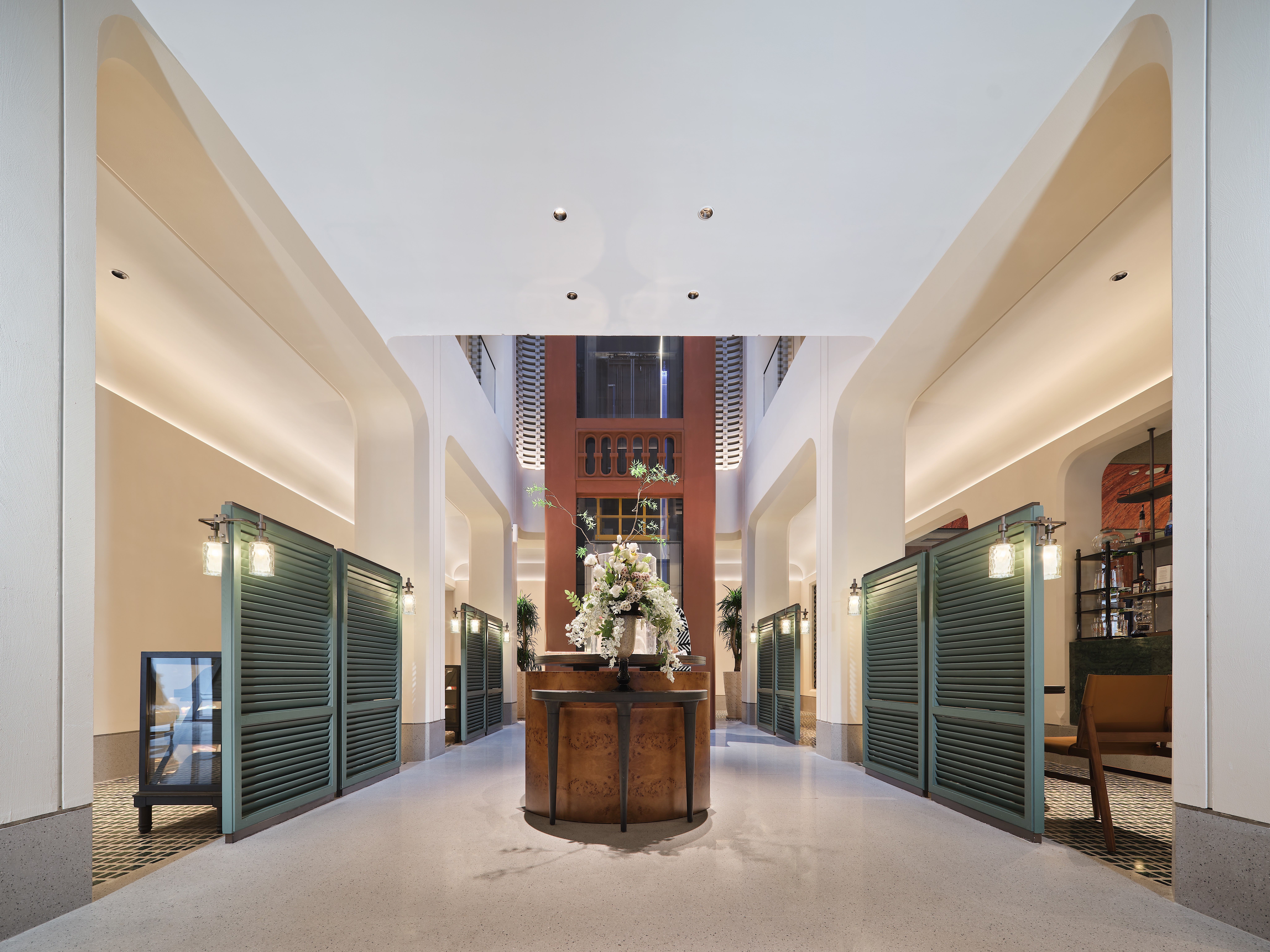 在独栋骑楼的物理限制下,我们通过“时间维度”与“功能复合”策略实现价值最大化。核心社交岛台随昼夜功能切换;廊道被重塑为艺术长廊;内退的灰空间模糊了酒店与社区的边界。这不仅提升了空间效率,更创造了持续活力的社交生态。 -