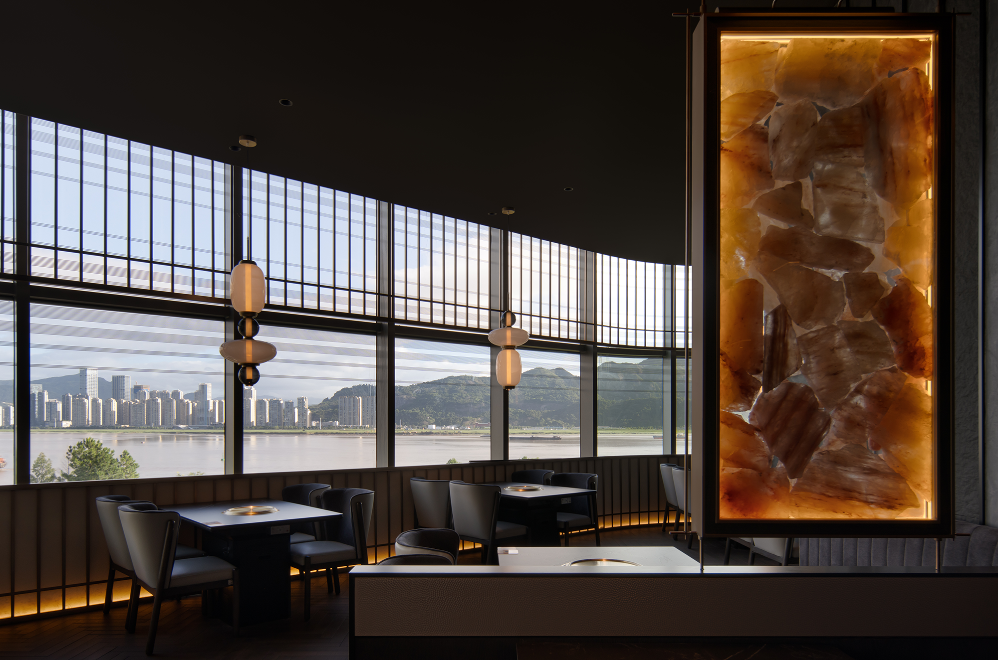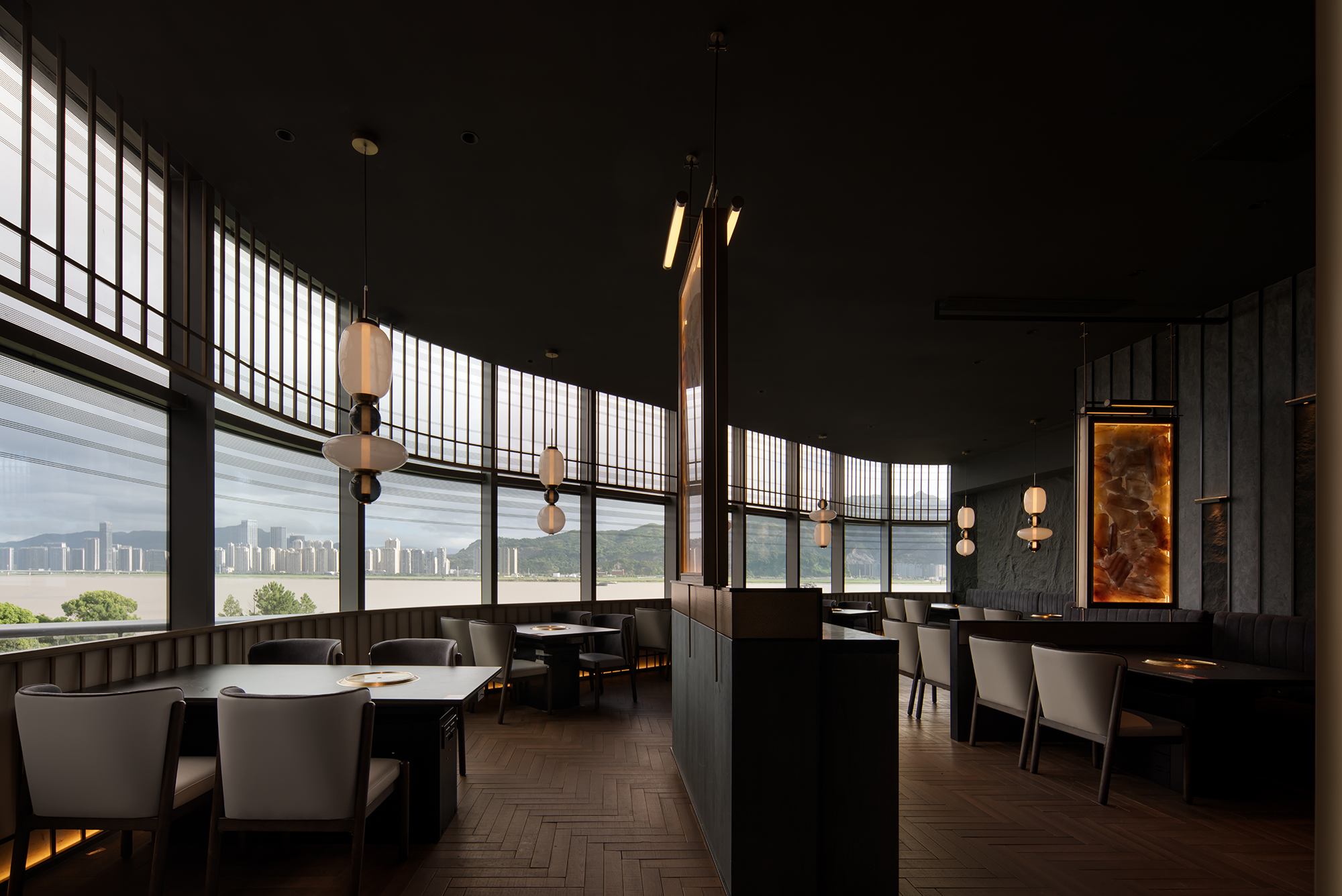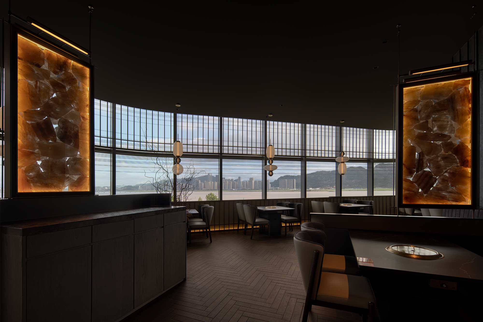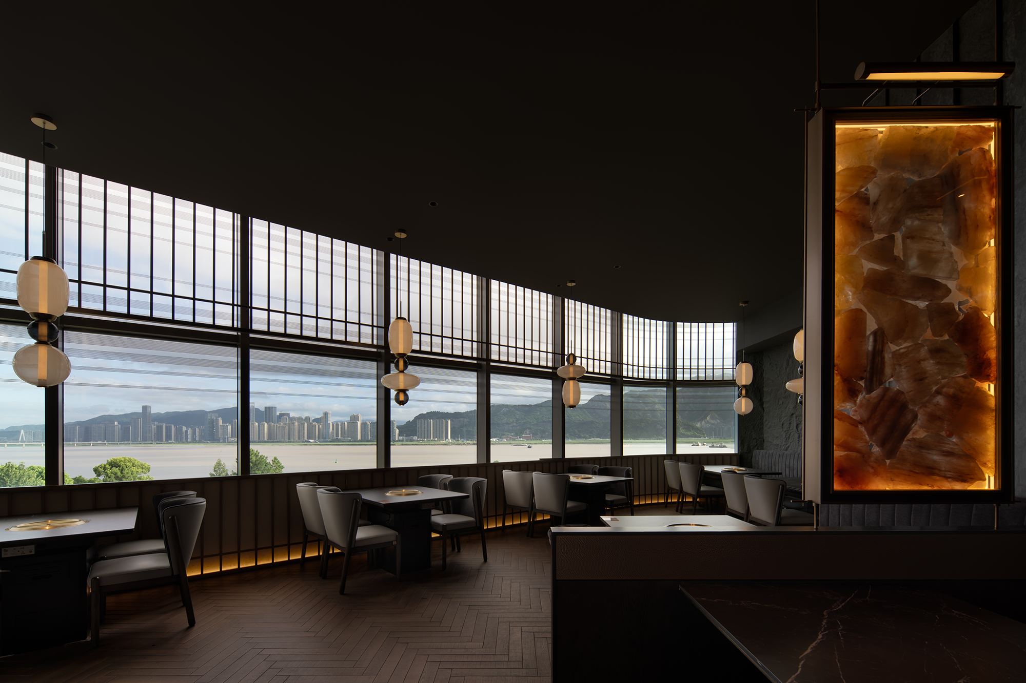 空间意境:炭色作底,以火苗燃烧、跃动的姿态为形,盐晶贮香,熏染入味。此番色香味之五感,尽数化意为境,衍生场景体验之极致,使浑然一体的形、色、质达到统一,共奏一曲“盐火咏叹”的餐饮空间,在内在力量的凝练中,设计以更贴合当代审美的方式,打破单一的空间形态。取炭色作为空间基底,光影微透,如炉火摇曳,不断指引宾客向内,在温暖且私密的环境中,指向一场对情感的慰藉。粗粝石皮围合出幽暗的骨架,暖灯点燃就餐温度,烟火滋味与精致腔调融合,每一寸光影下的肌理材质映照着品牌的独特气质,置身其中,宾客能沉浸这份场景体验的新切面。借建筑体结构和环境稀缺优势,将原始位于临窗面的厨房进行改位,最佳江景位留给客座区。临江的外立面顺着弧形结构舒展,框景瓯江,极尽开阔视野。
