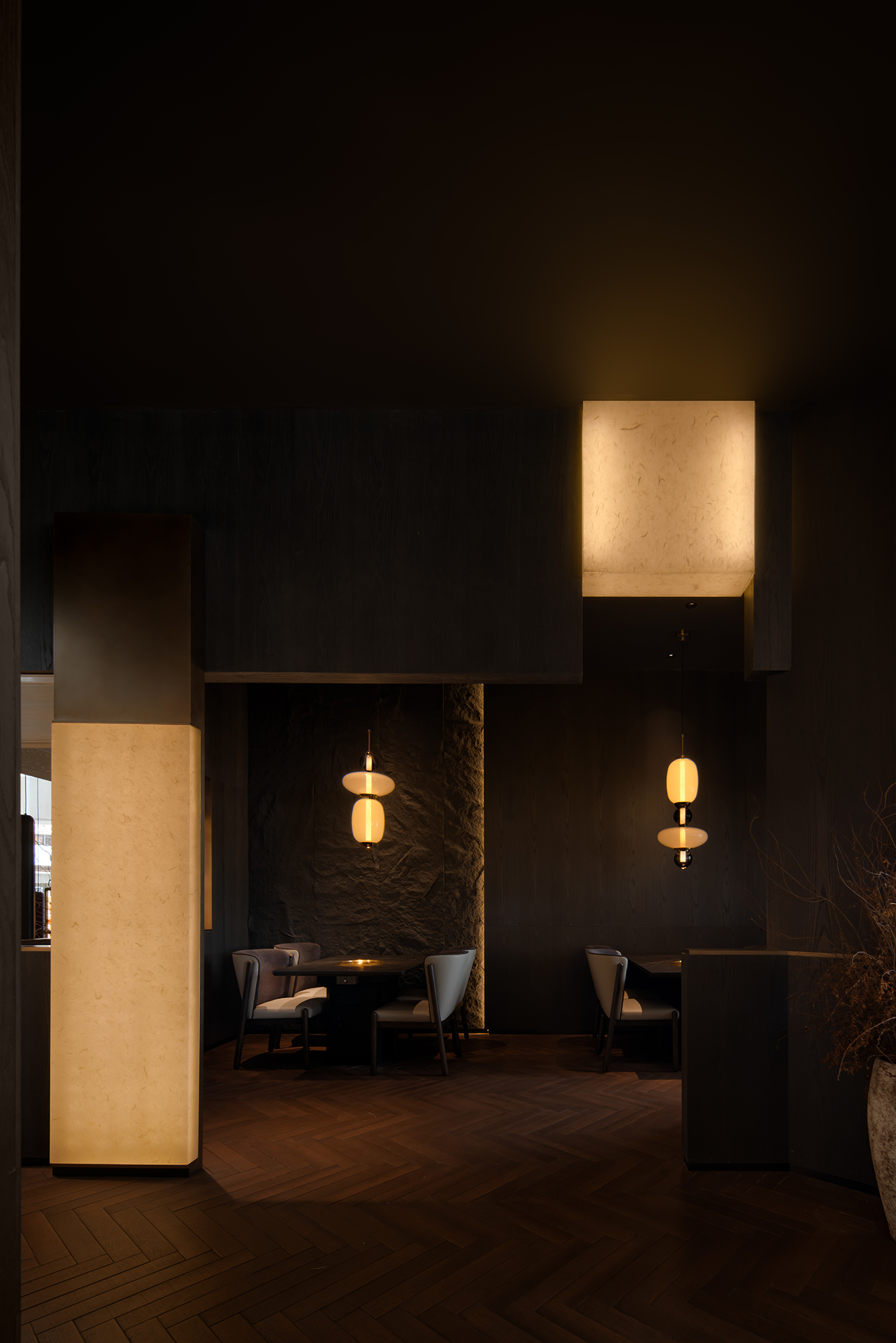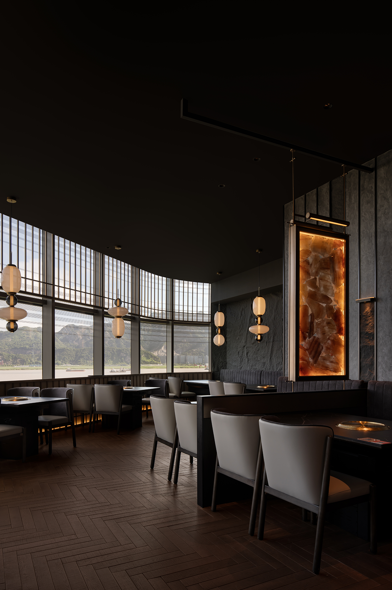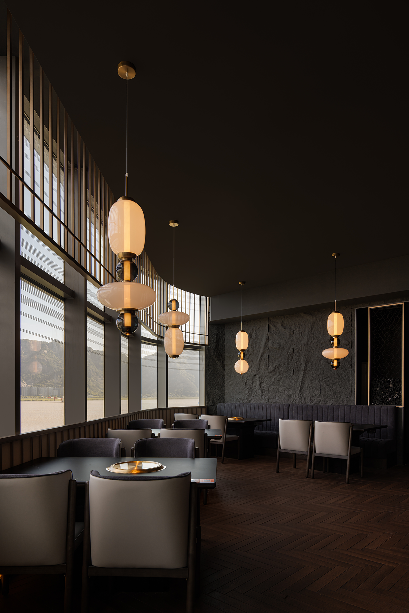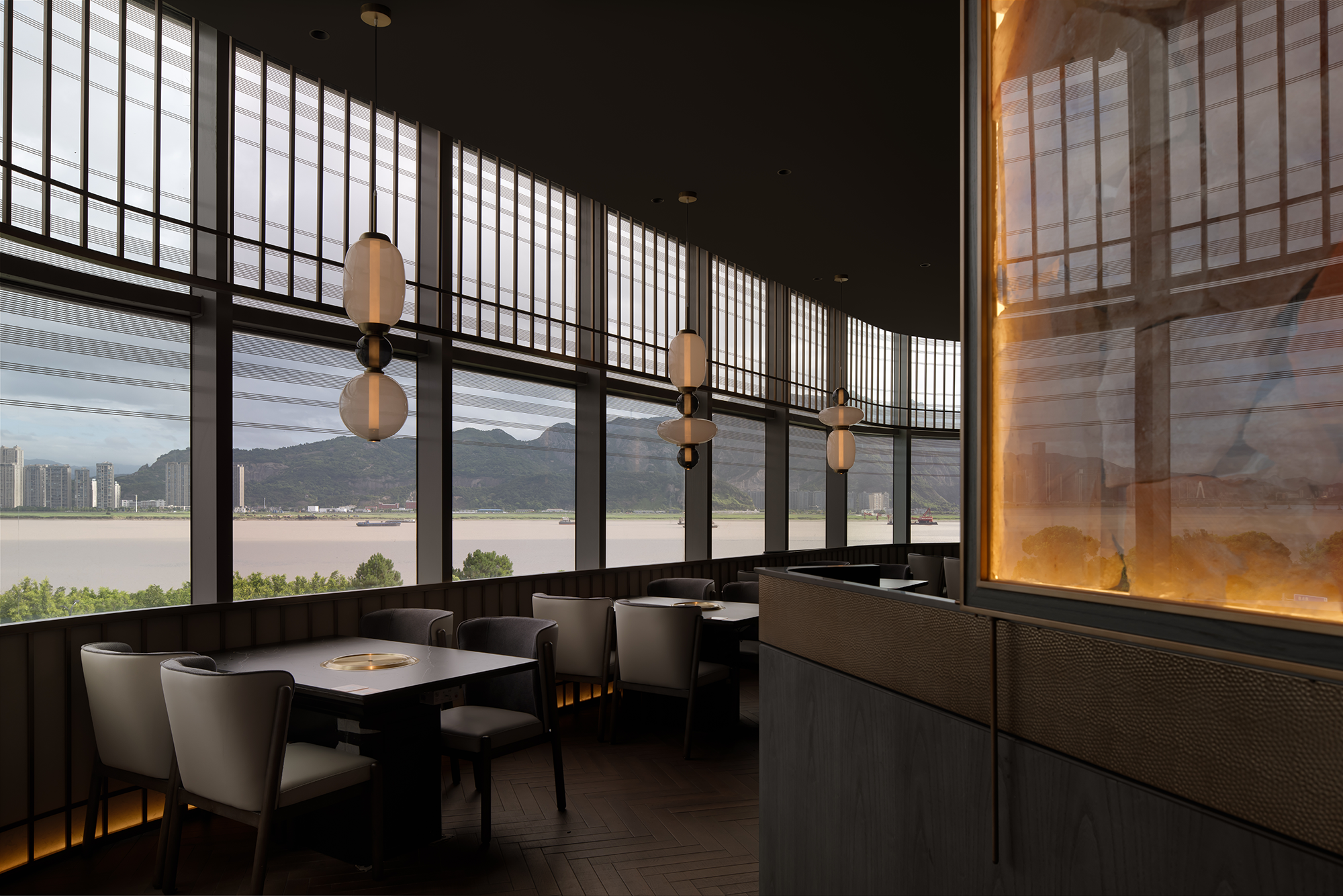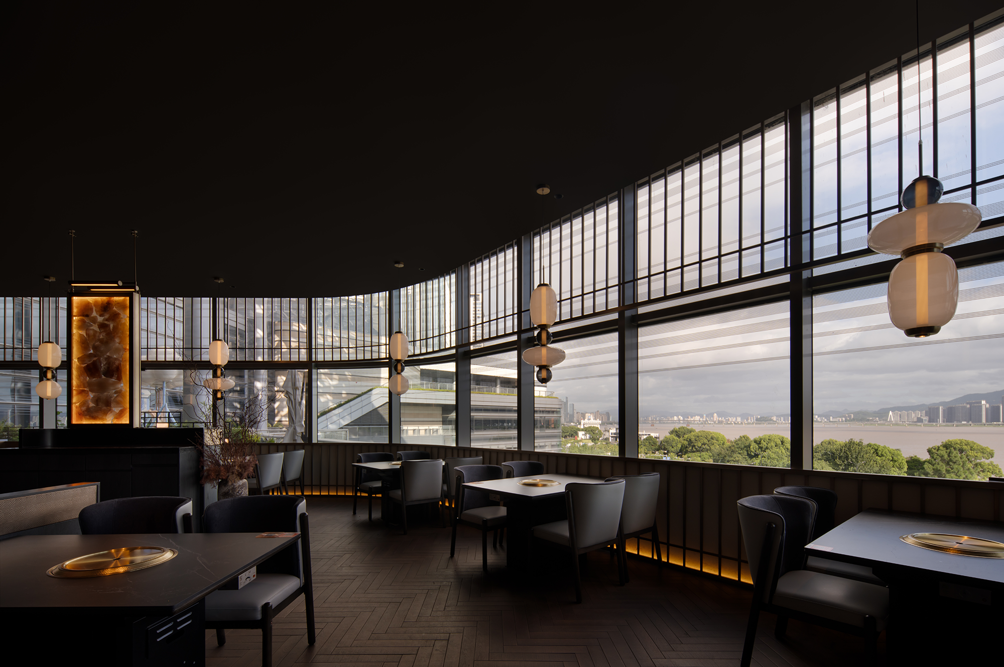 空间意境:炭色作底,以火苗燃烧、跃动的姿态为形,盐晶贮香,熏染入味。此番色香味之五感,尽数化意为境,衍生场景体验之极致,使浑然一体的形、色、质达到统一,共奏一曲“盐火咏叹”的餐饮空间,在内在力量的凝练中,设计以更贴合当代审美的方式,打破单一的空间形态。取炭色作为空间基底,光影微透,如炉火摇曳,不断指引宾客向内,在温暖且私密的环境中,指向一场对情感的慰藉。粗粝石皮围合出幽暗的骨架,暖灯点燃就餐温度,烟火滋味与精致腔调融合,每一寸光影下的肌理材质映照着品牌的独特气质,置身其中,宾客能沉浸这份场景体验的新切面。借建筑体结构和环境稀缺优势,将原始位于临窗面的厨房进行改位,最佳江景位留给客座区。临江的外立面顺着弧形结构舒展,框景瓯江,极尽开阔视野。