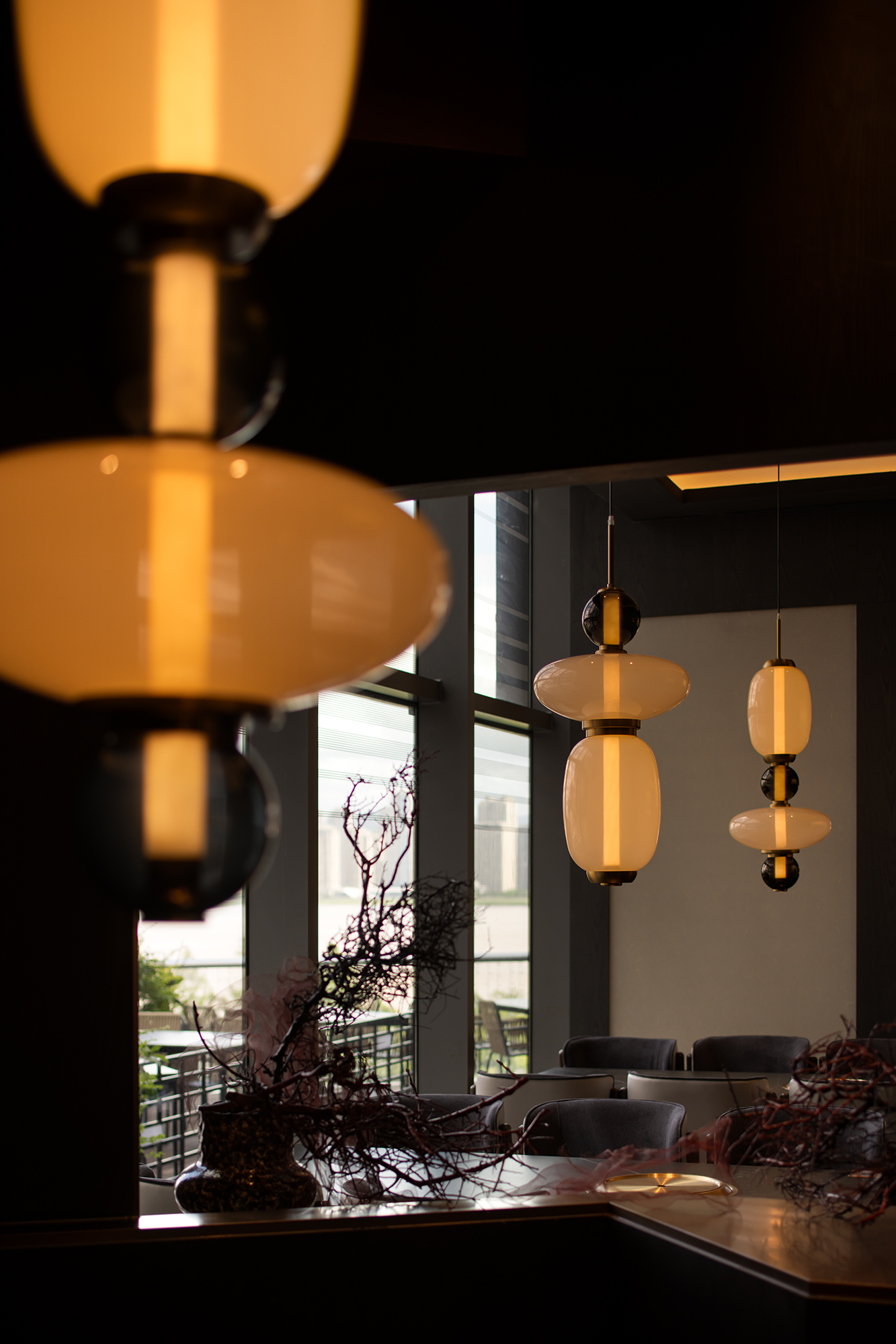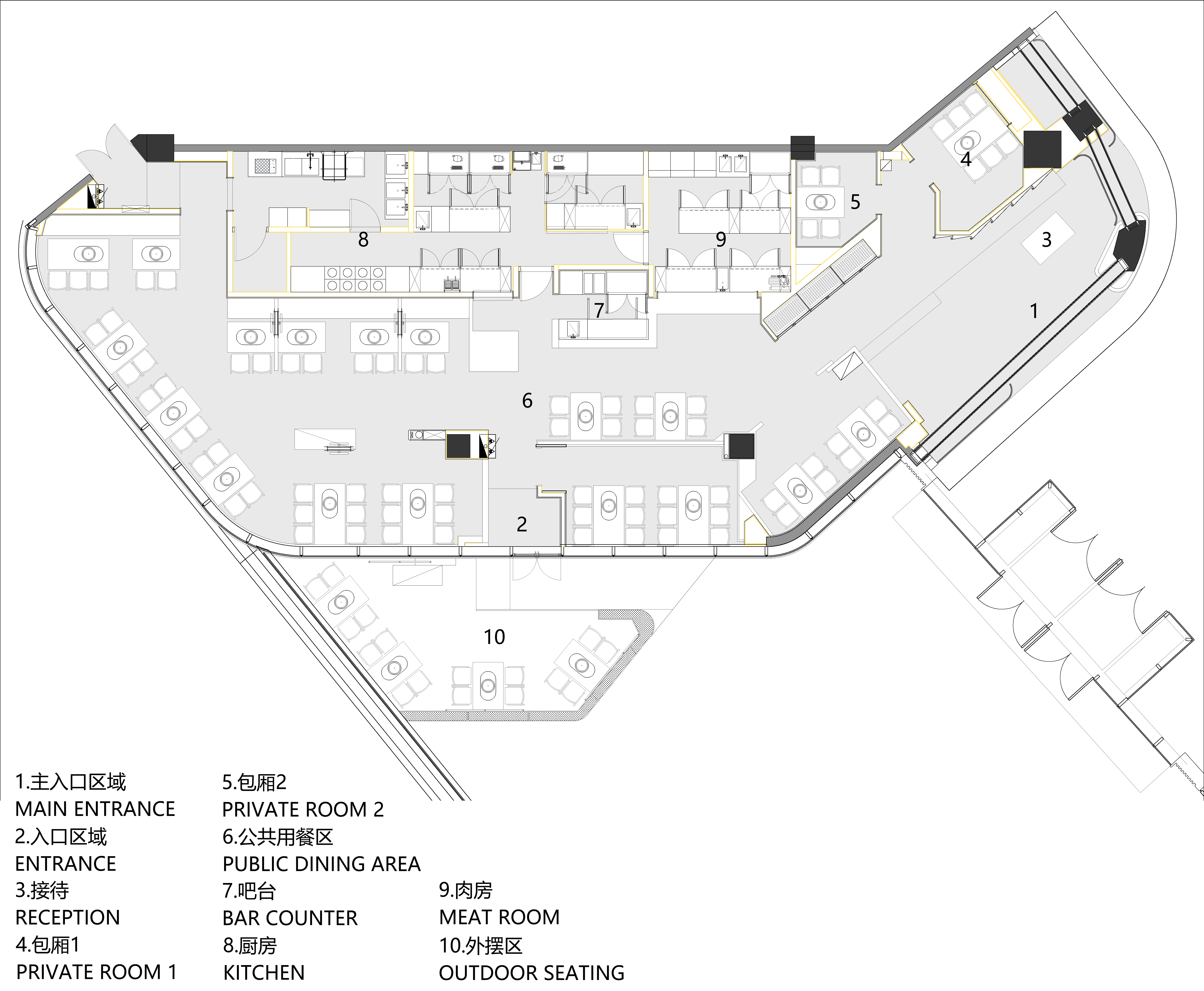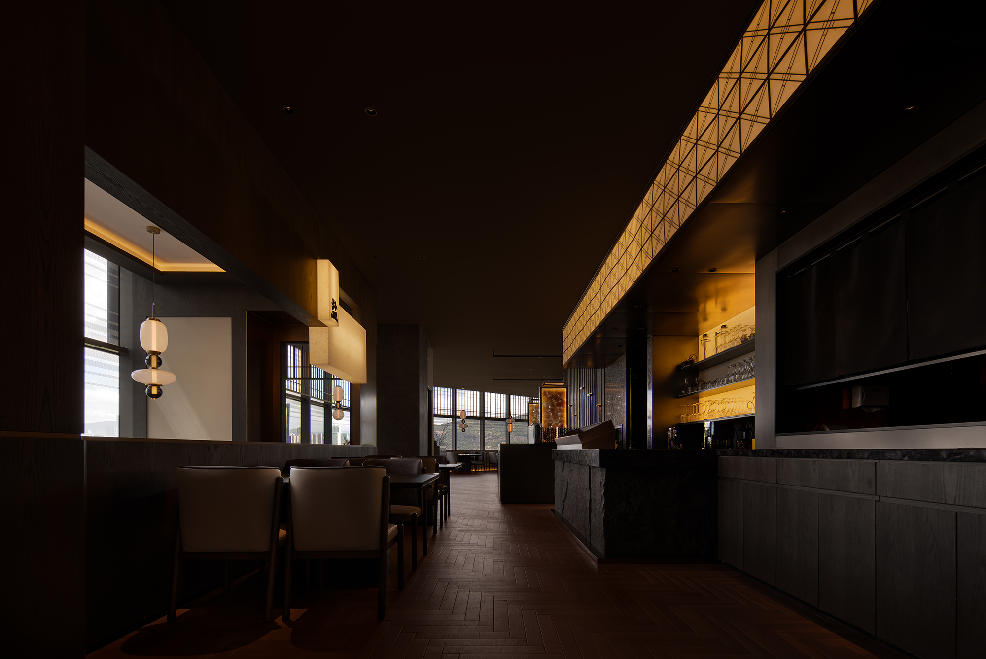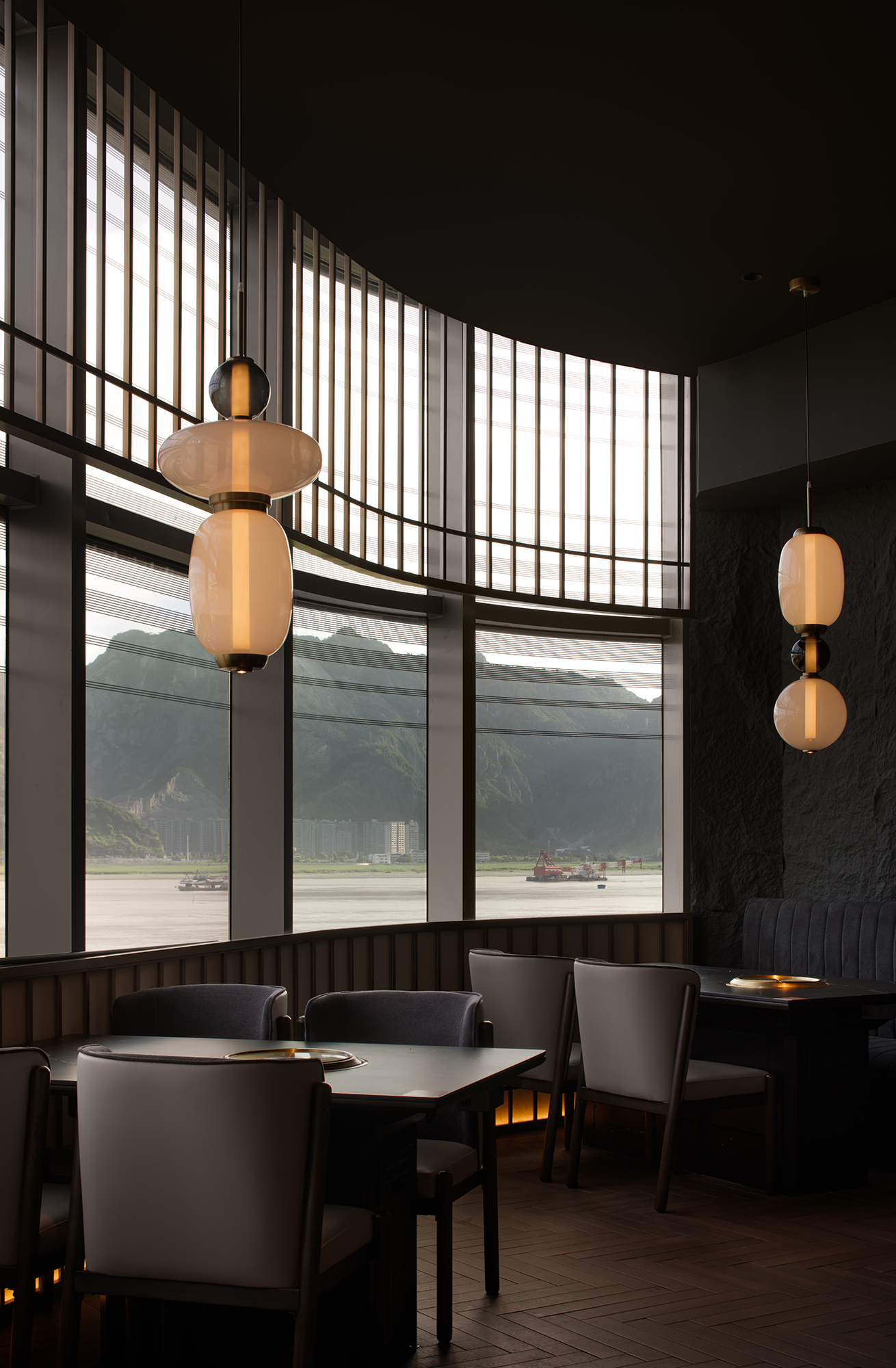 空间意境:炭色作底,以火苗燃烧、跃动的姿态为形,盐晶贮香,熏染入味。此番色香味之五感,尽数化意为境,衍生场景体验之极致,使浑然一体的形、色、质达到统一,共奏一曲“盐火咏叹”的餐饮空间,在内在力量的凝练中,设计以更贴合当代审美的方式,打破单一的空间形态。取炭色作为空间基底,光影微透,如炉火摇曳,不断指引宾客向内,在温暖且私密的环境中,指向一场对情感的慰藉。粗粝石皮围合出幽暗的骨架,暖灯点燃就餐温度,烟火滋味与精致腔调融合,每一寸光影下的肌理材质映照着品牌的独特气质,置身其中,宾客能沉浸这份场景体验的新切面。借建筑体结构和环境稀缺优势,将原始位于临窗面的厨房进行改位,最佳江景位留给客座区。临江的外立面顺着弧形结构舒展,框景瓯江,极尽开阔视野。
