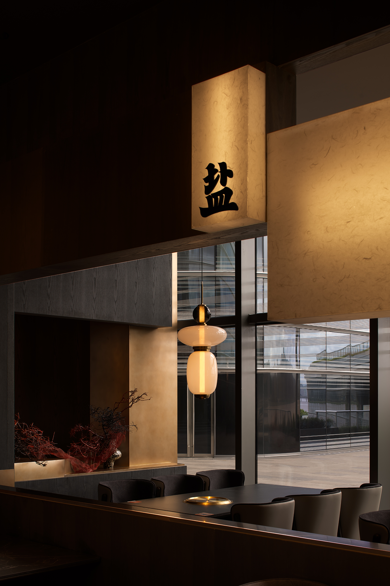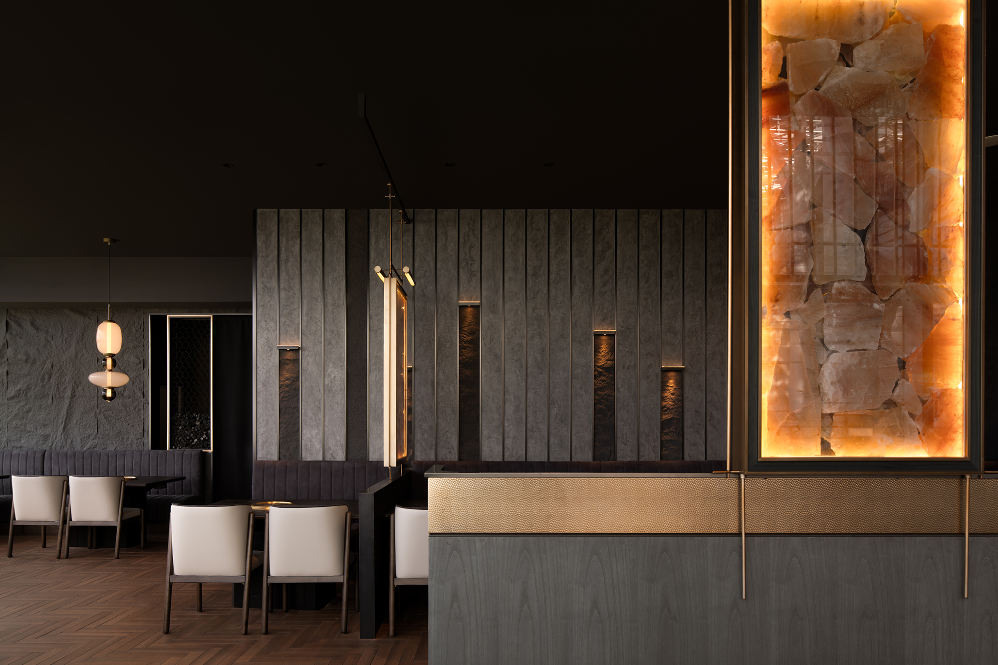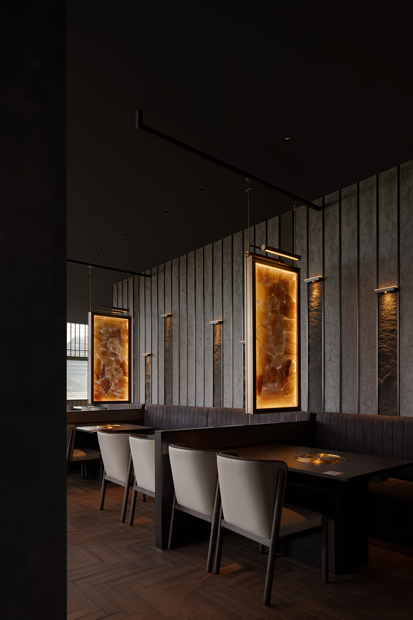 相同的底色之下,以材质为媒介划分就餐区,用岩盐灯进行指引、过渡,完整空间主题。设计将食材、调味、炭火化为空间形制,演绎与食客间的感官互动,感官层次再次提升,以此创造体验之极致。
