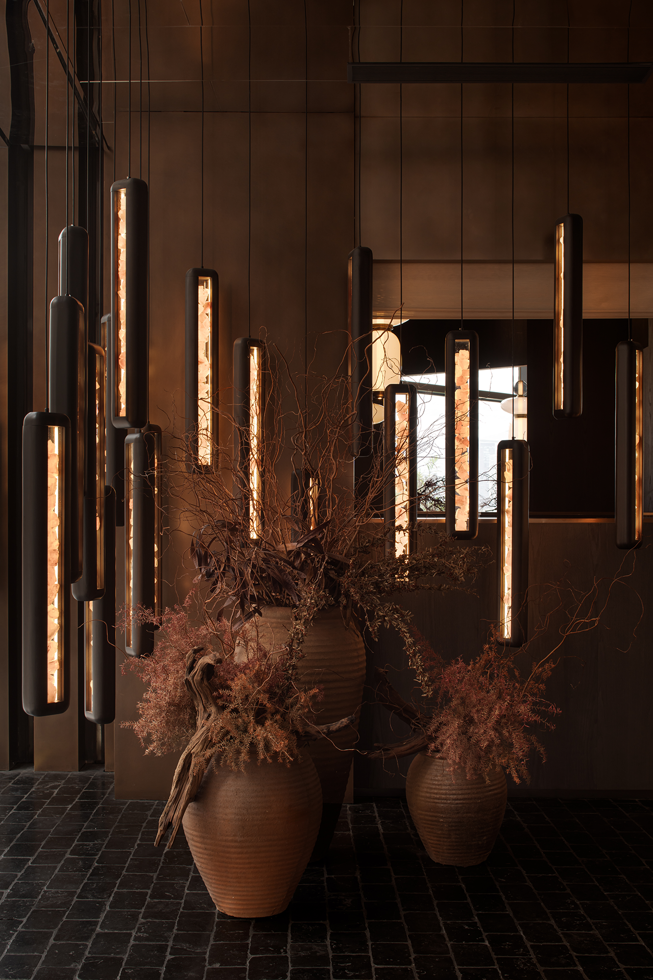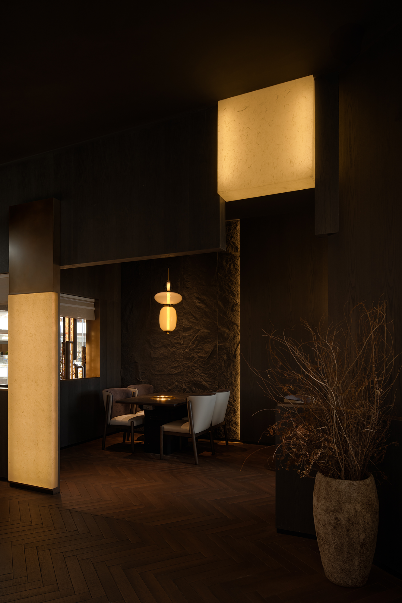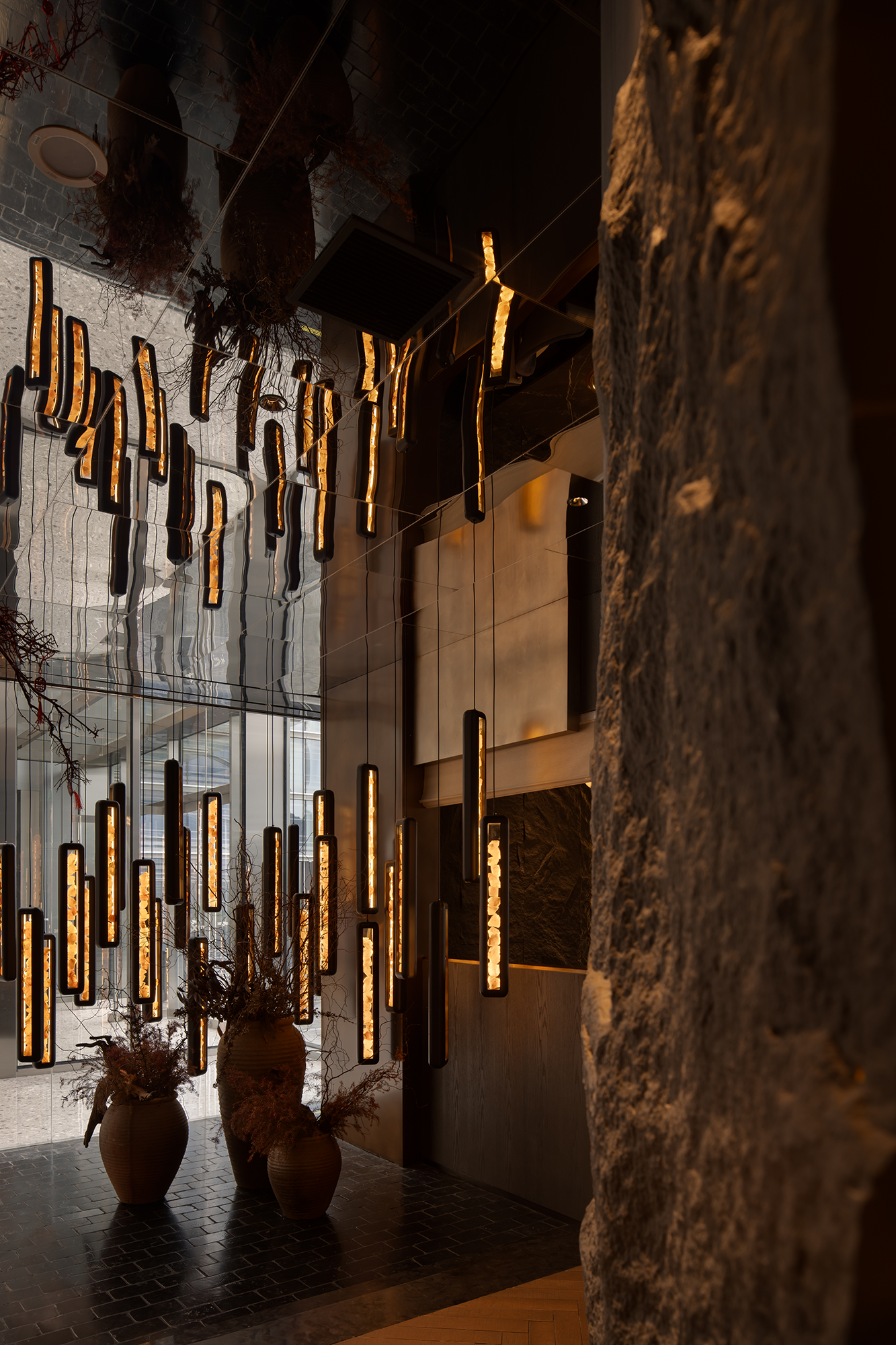 相同的底色之下,以材质为媒介划分就餐区,用岩盐灯进行指引、过渡,完整空间主题。设计将食材、调味、炭火化为空间形制,演绎与食客间的感官互动,感官层次再次提升,以此创造体验之极致。