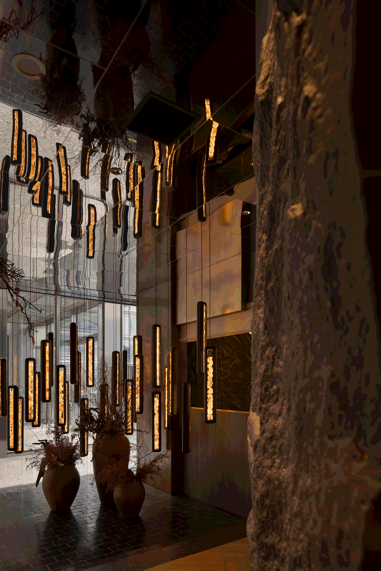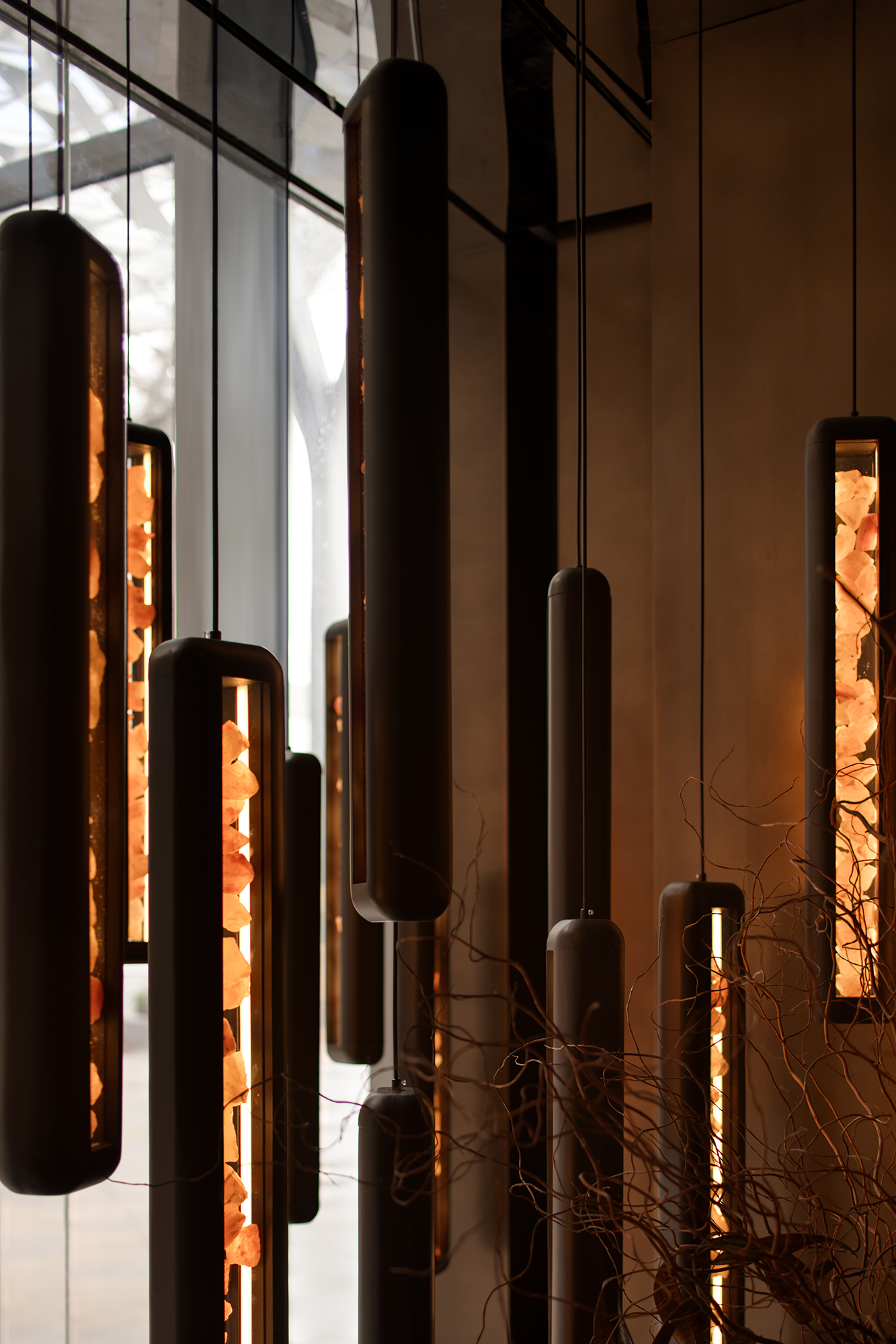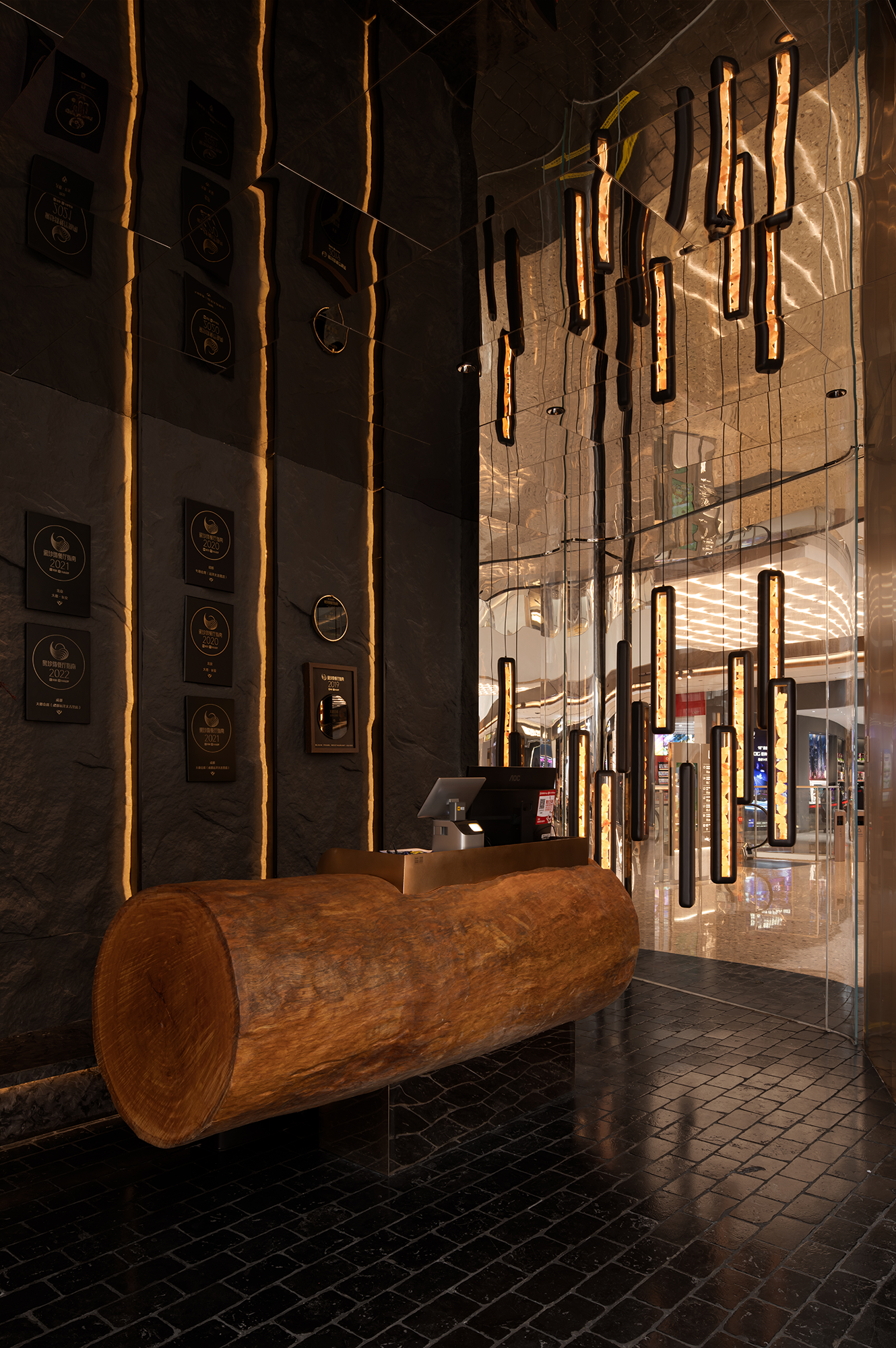 设计选材:将喜玛拉雅岩盐进行形态模拟,特别定制岩盐灯,并着重克服加工、安装和抗返碱难题,使其完美呈现成为视觉焦点。顶部镜面不锈钢板制造多维度空间,延展纵深立体感。同时保留完整的原木作为收银台,光影结构互相贯穿,打破虚实界面,探寻更多意料之外的惊喜。
