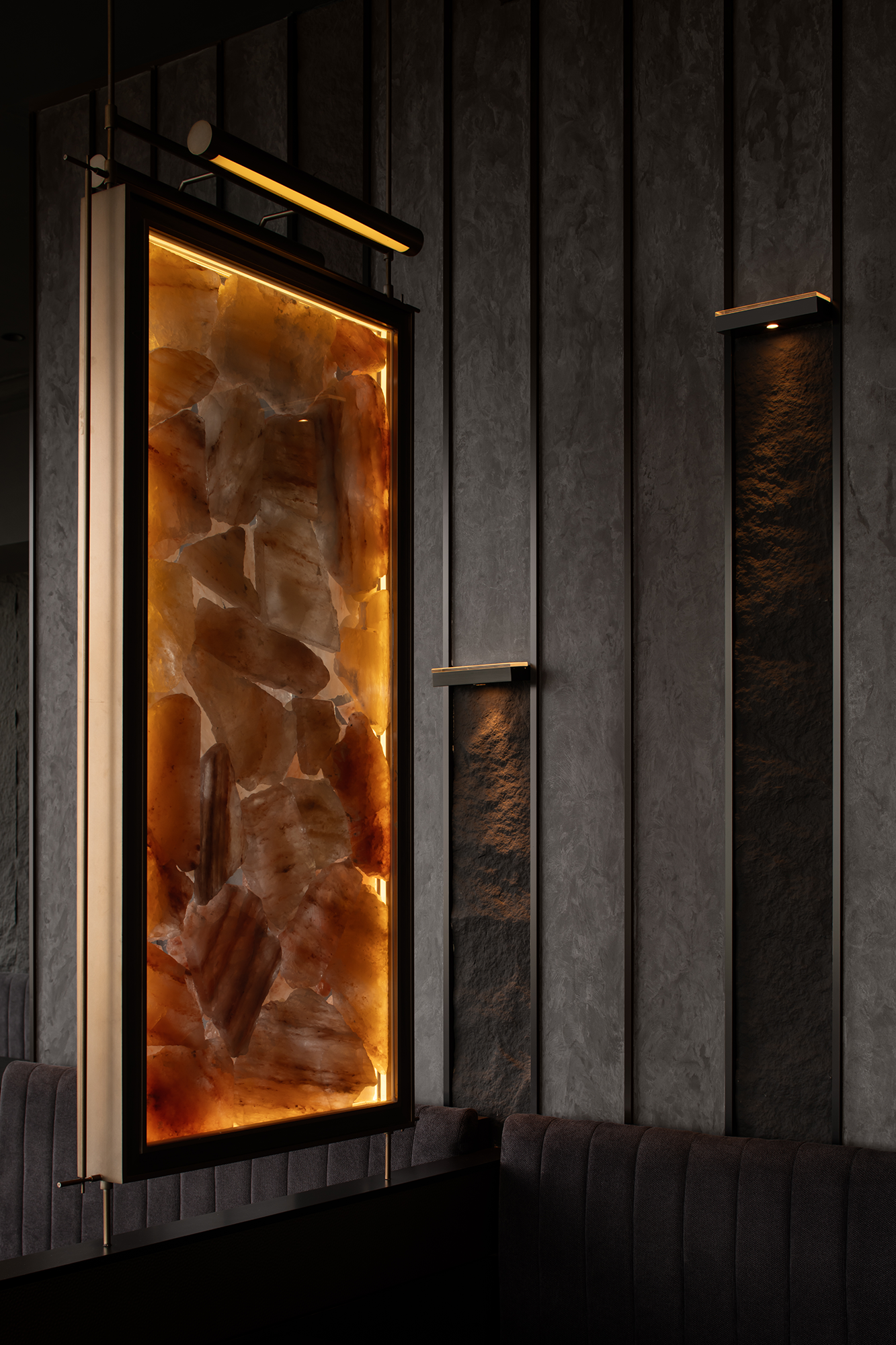 空间布局:入门取火苗之意向,将喜玛拉雅岩盐进行形态模拟,特别定制岩盐灯,并着重克服加工、安装和抗返碱难题,使其完美呈现成为视觉焦点。顶部镜面不锈钢板制造多维度空间,延展纵深立体感。同时保留完整的原木作为收银台,光影结构互相贯穿,打破虚实界面,探寻更多意料之外的惊喜。从空间的体验感和商业逻辑出发,落笔于周身观感,光色暗隐间调动适宜尺度,平衡食客之间舒适的就餐关系。沿一条主动线合理布局私密和公共区,由外向内循序舒展,灵动划拨出自由流动的模块,提供更加高效的服务动线。原始结构为多弧面与转折结合的异形空间,易受门面与窗面限制,区域布局具有局限性。设计从全域视角调度功能区关系,合理分配封闭空间与敞开空间,兼顾服务与被服务动线,过道、吧台、餐桌之间协调适宜的比例尺度,互相有序游离,有效提高空间利用率。墙面凿一方框,内外通透,就餐体验的层次感被再次点亮,带来鲜活生动的仪式感。
