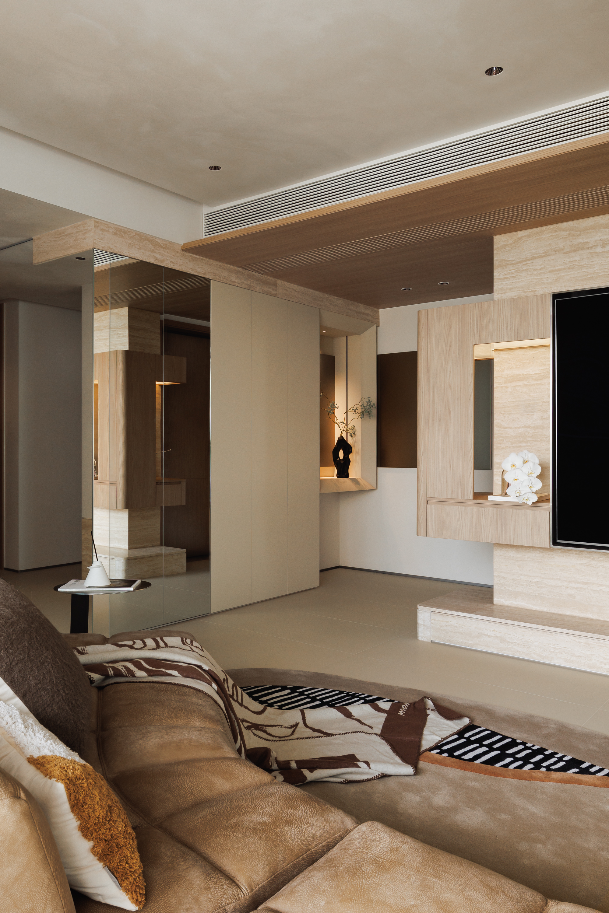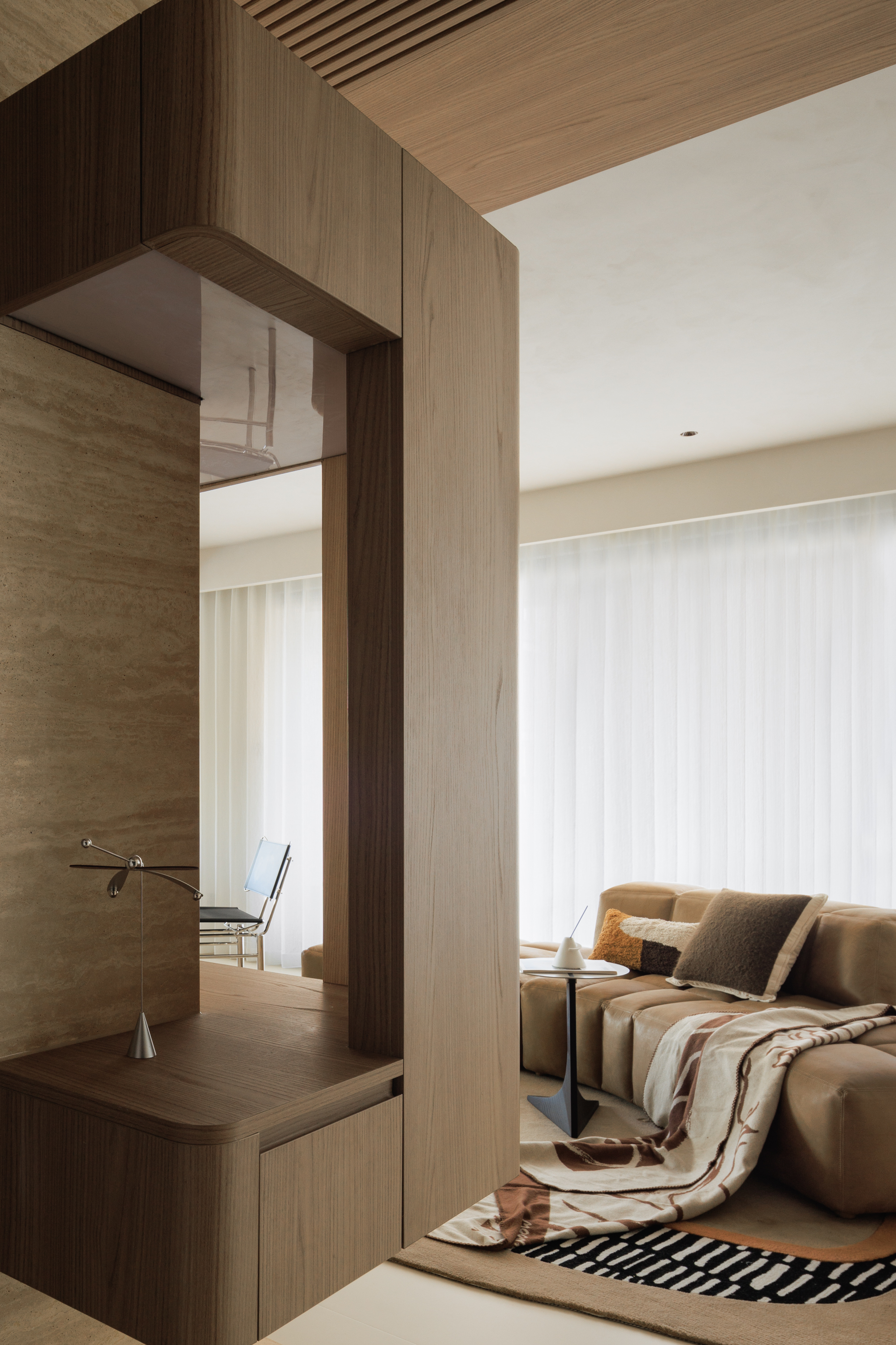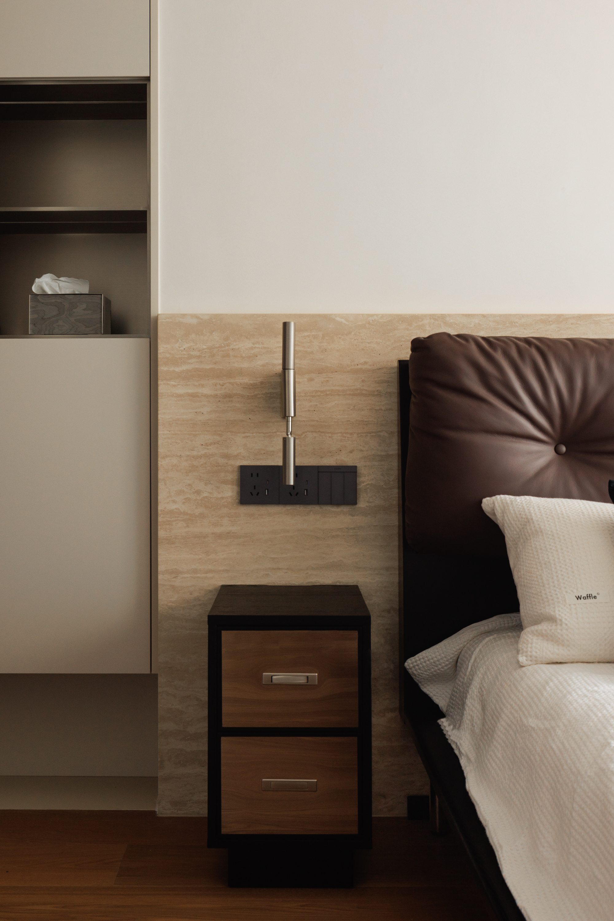 创新搭配:整体以低饱和度艺术涂料、木饰面、岩板为主基调,营造温润细腻感;局部巧妙运用拉丝不锈钢、镜面与发光板提亮,增加现代质感与通透度。