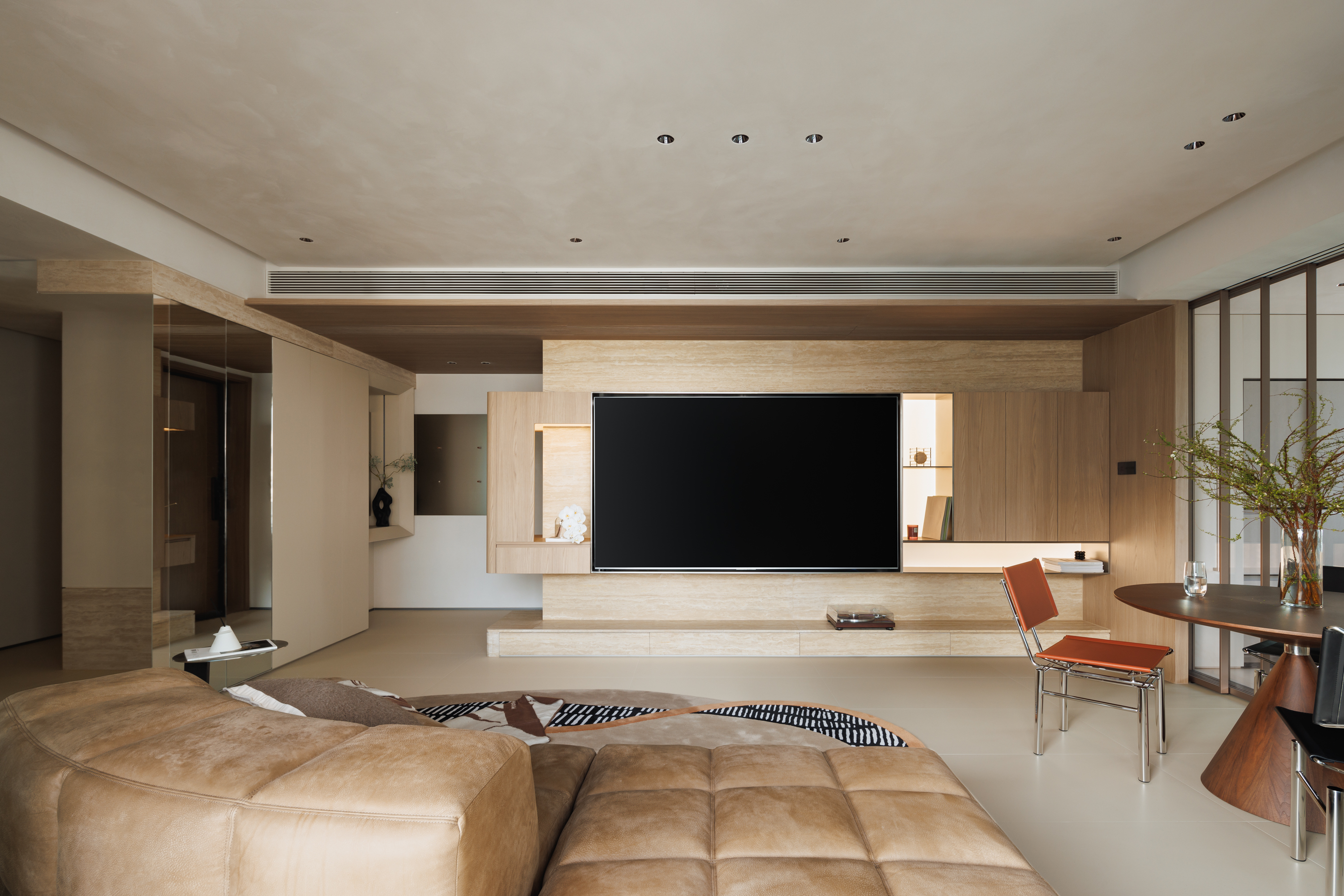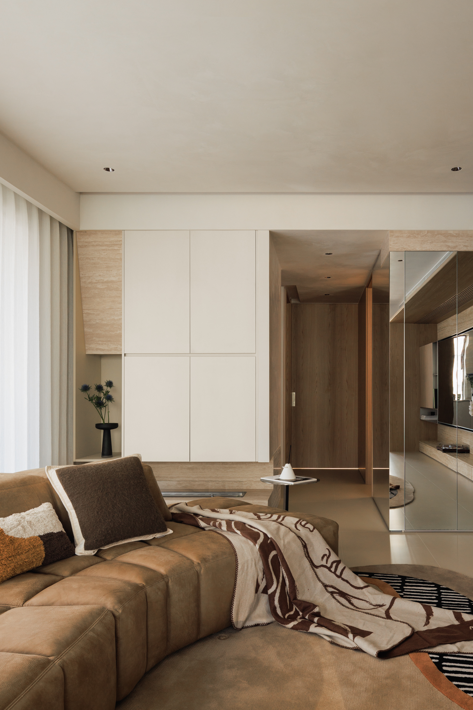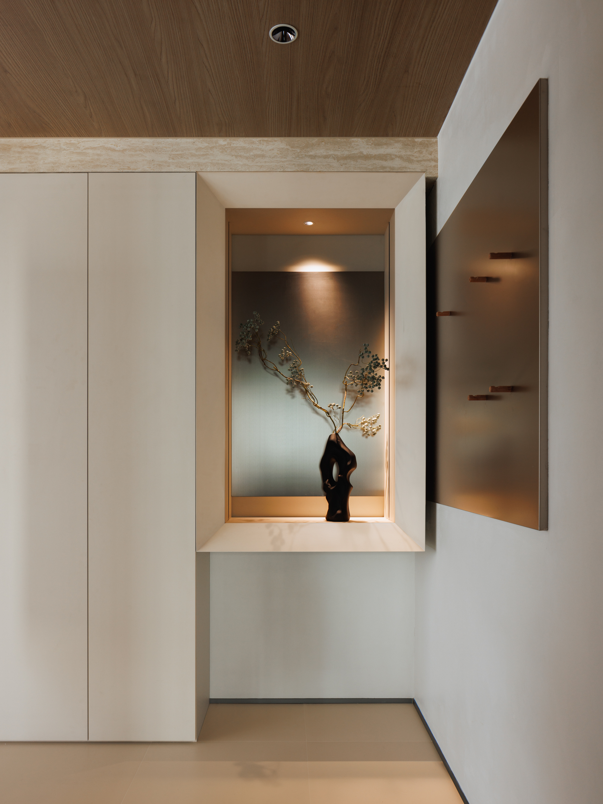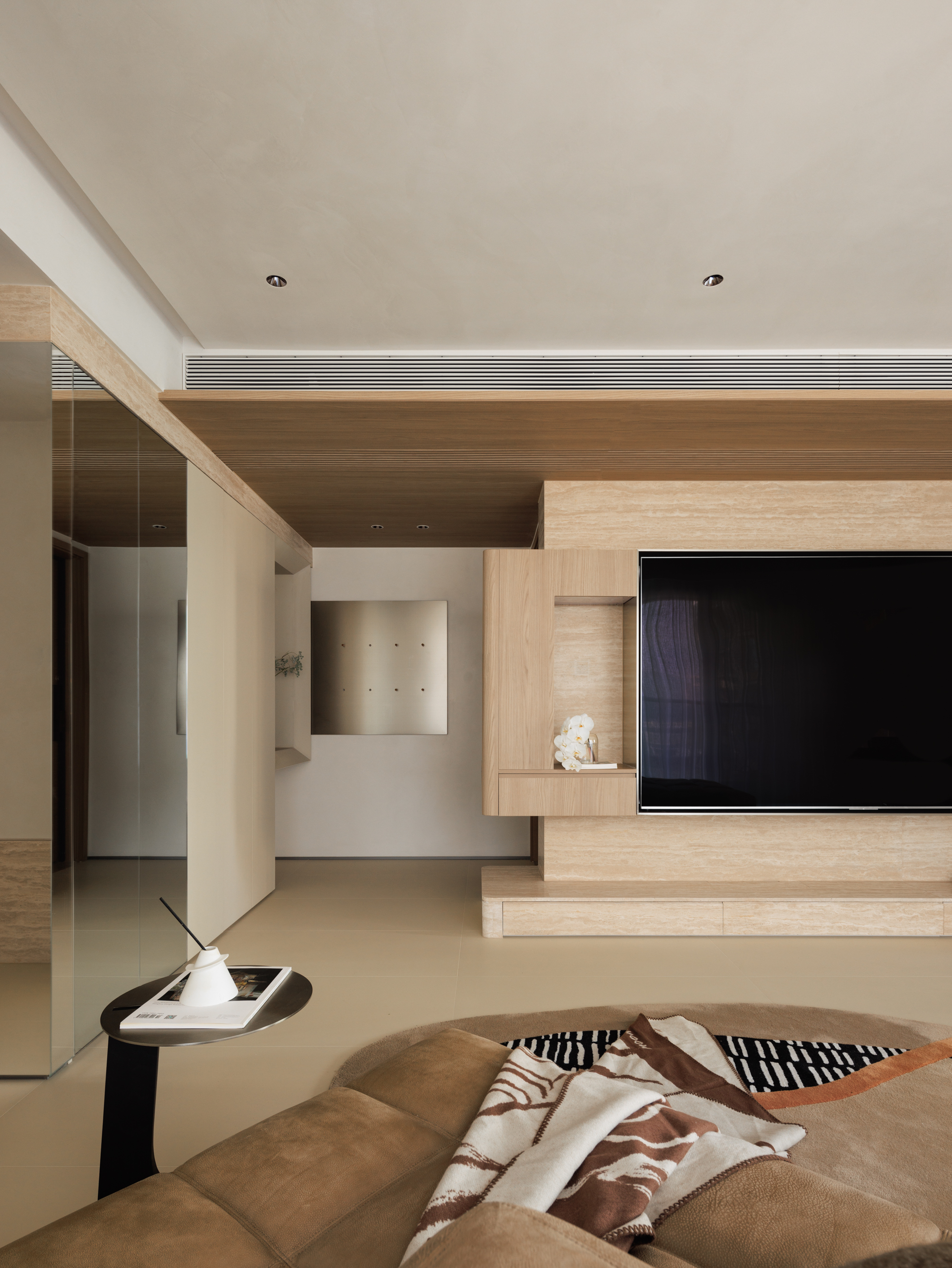 创新搭配:整体以低饱和度艺术涂料、木饰面、岩板为主基调,营造温润细腻感;局部巧妙运用拉丝不锈钢、镜面与发光板提亮,增加现代质感与通透度。