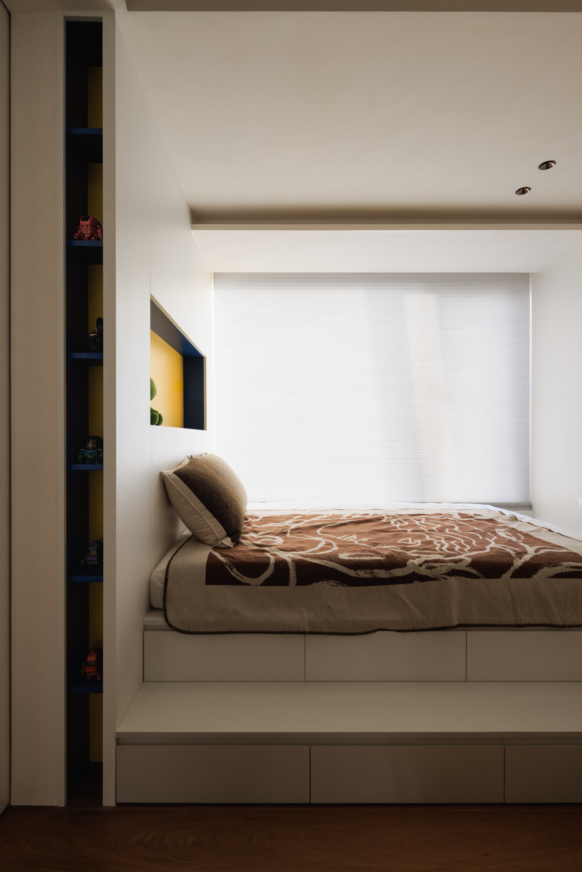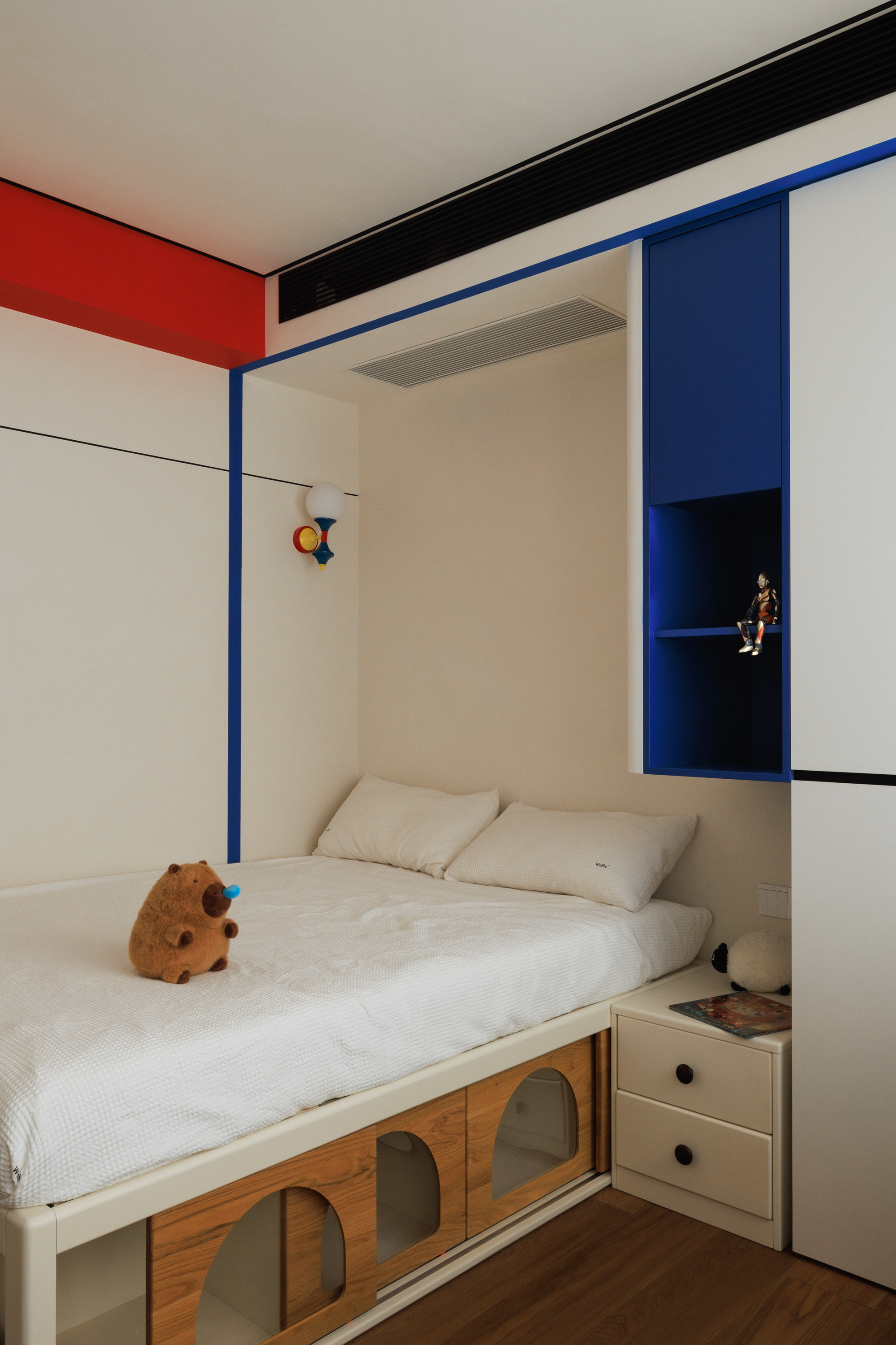 儿童房利用飘窗设置书桌,整体空间融入蒙德里安的抽象画概念以简约干净的乳胶漆为底,立面加以线条与几何造型三原色的点缀,使整体空间有了更多的可能性,童趣也成了生活的乐趣。