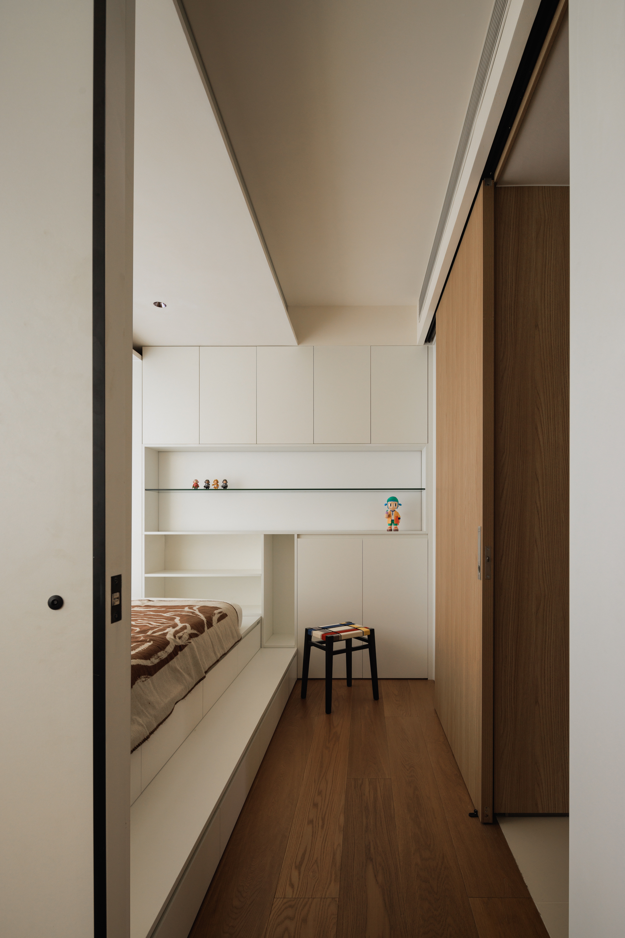 儿童房与多功能房之间做一扇推拉门将两个房间进行联动方便陪护,在拓展场景可能性且保有功能完整性的前提下充分的让空间融合起来。