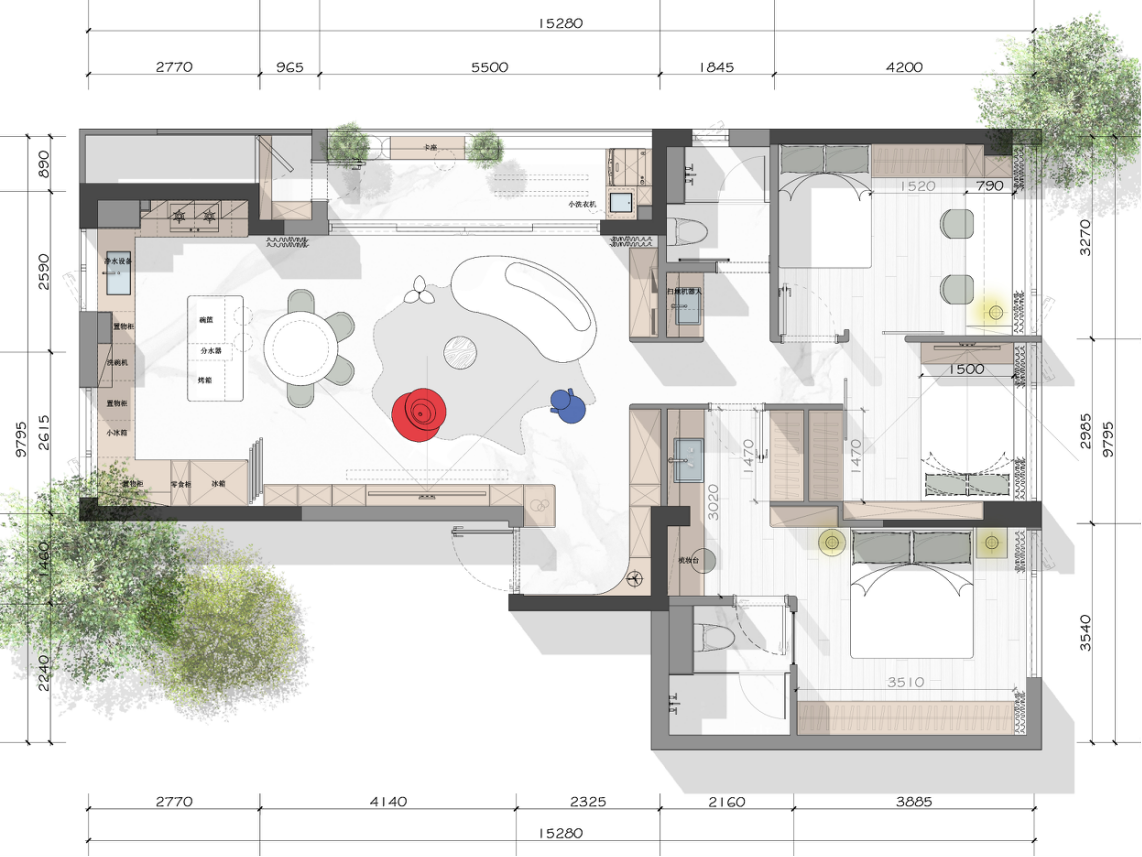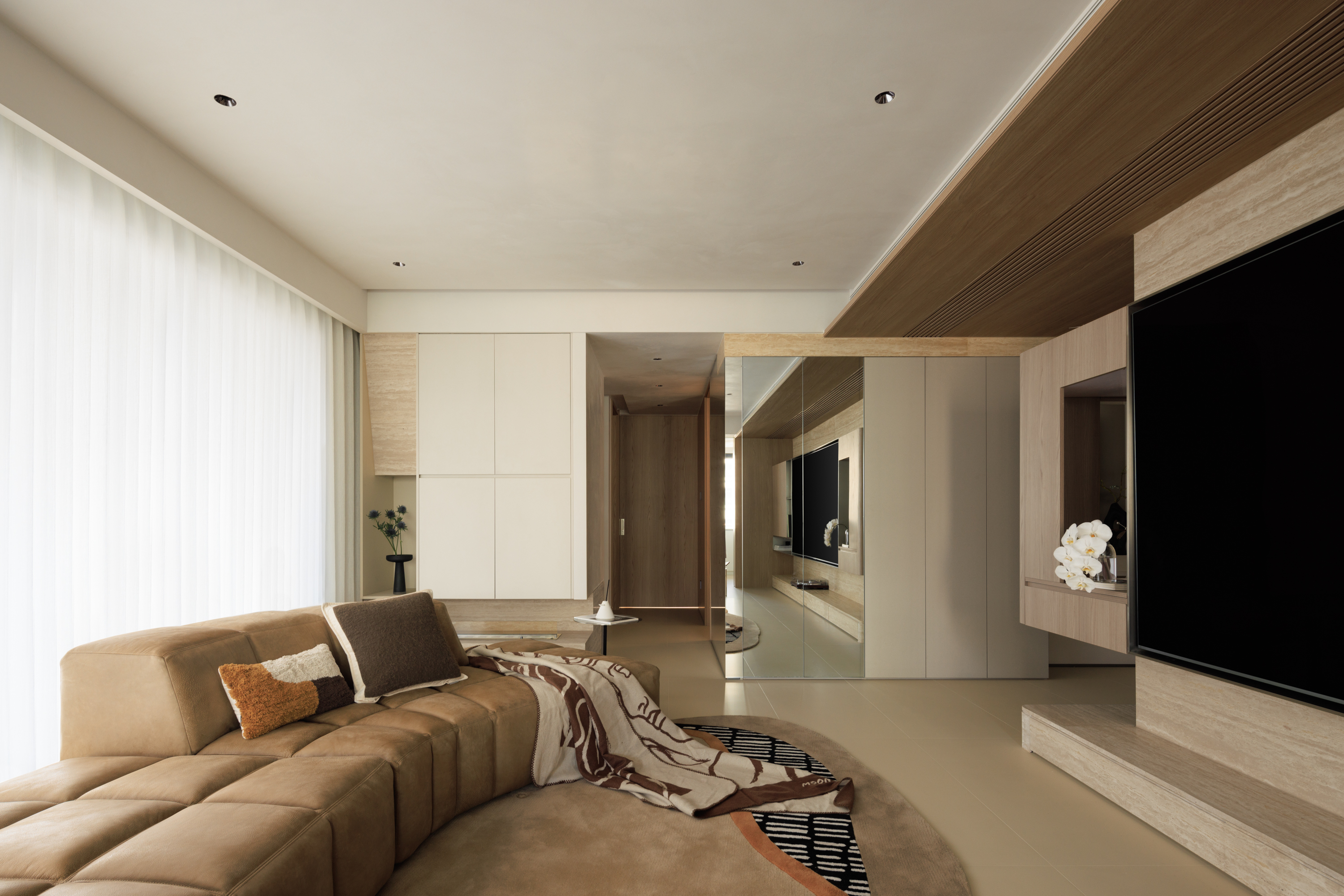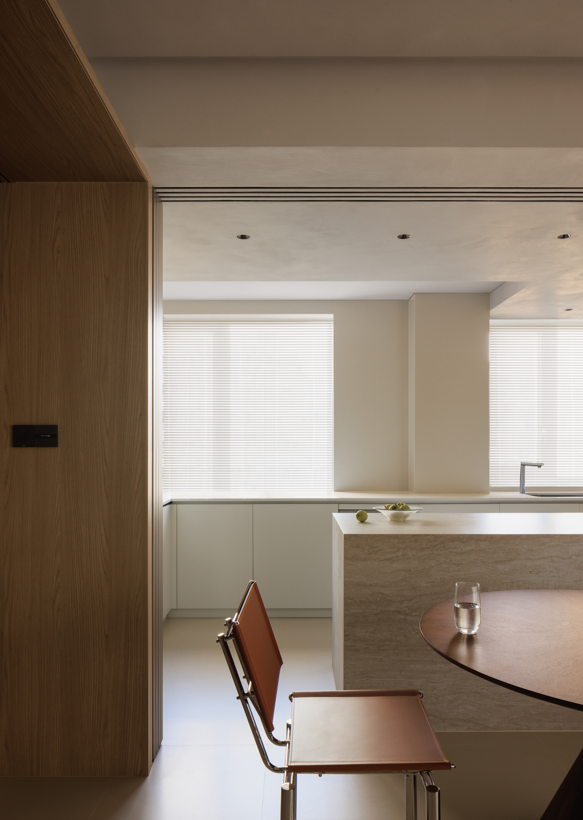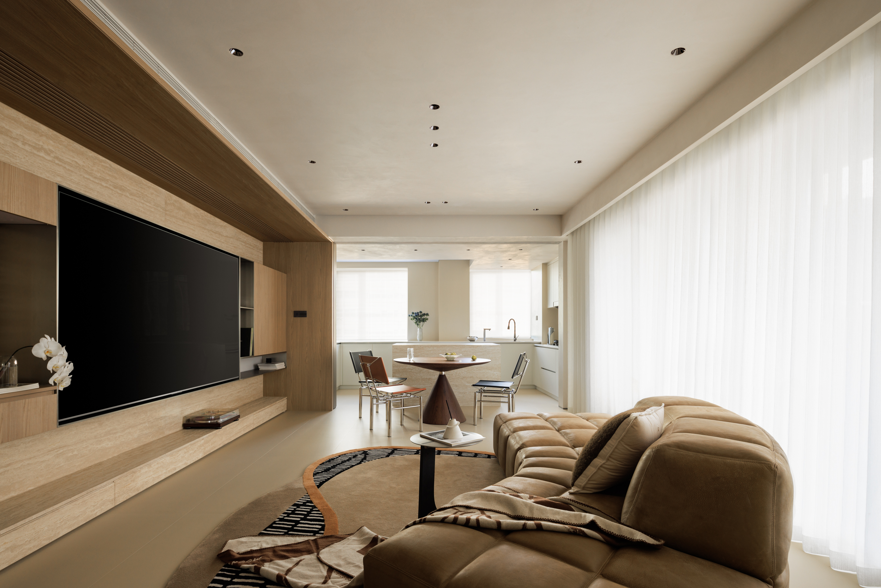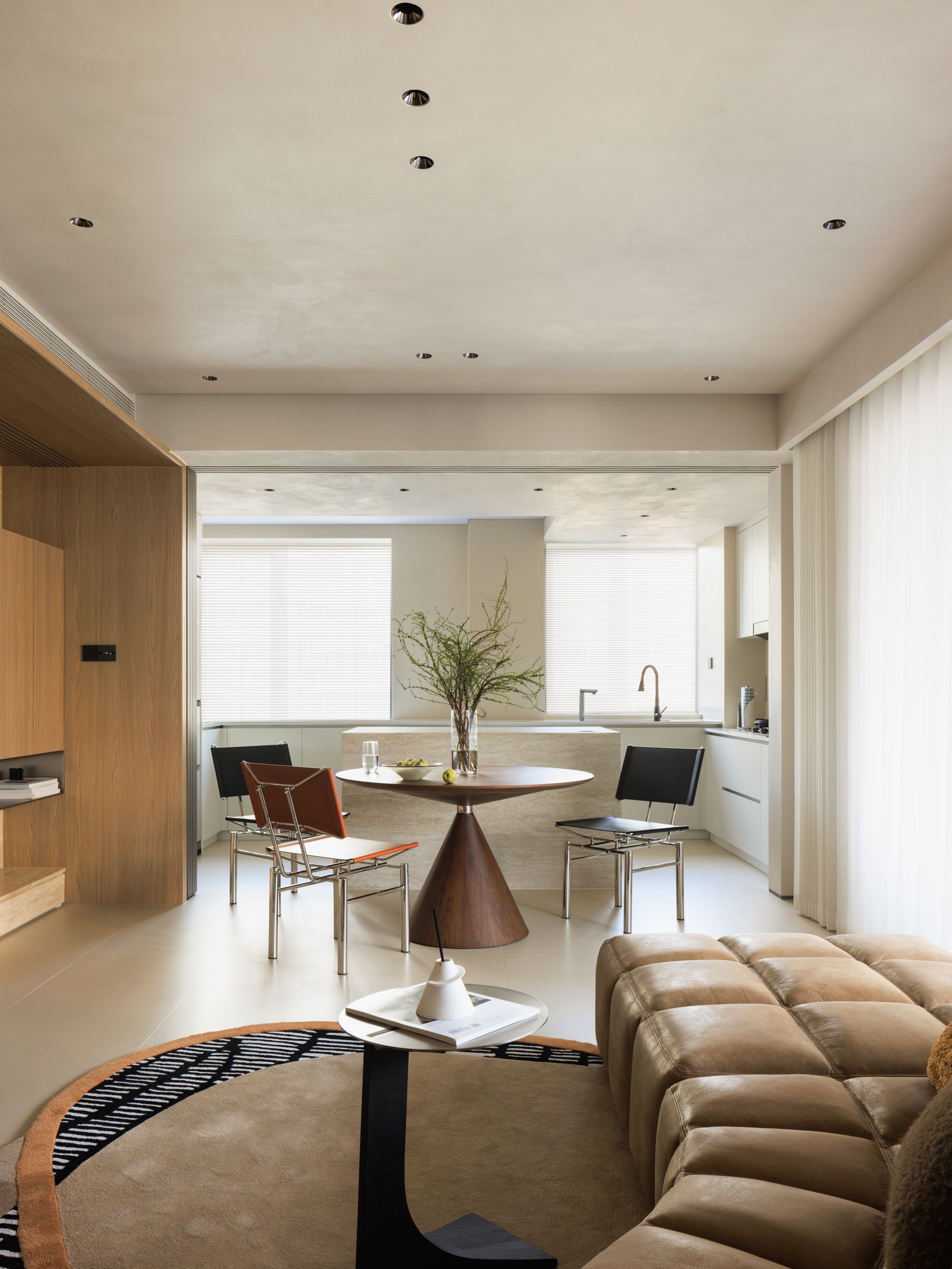 流动通透:拆除多余墙体,使南北视野贯通,形成明亮、开阔且功能交织的流动平面。 -