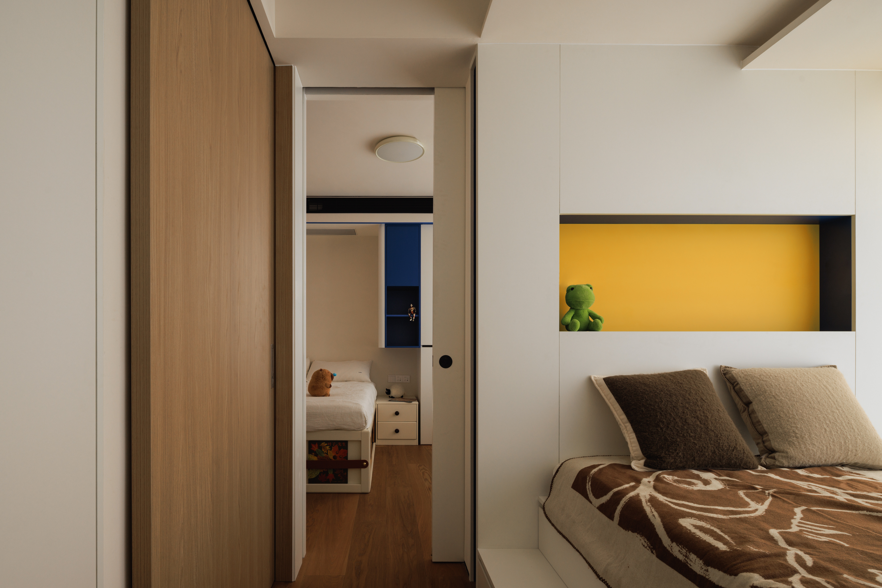 儿子的房间是个‘魔法盒’。平时推拉门打开,和他的游戏房连成一片奔跑的天地;晚上门一关,又是安静独立的睡眠区。我们帮他设计的那个蒙德里安配色墙面,现在被他贴满了自己的画,成了他专属的创意展板。