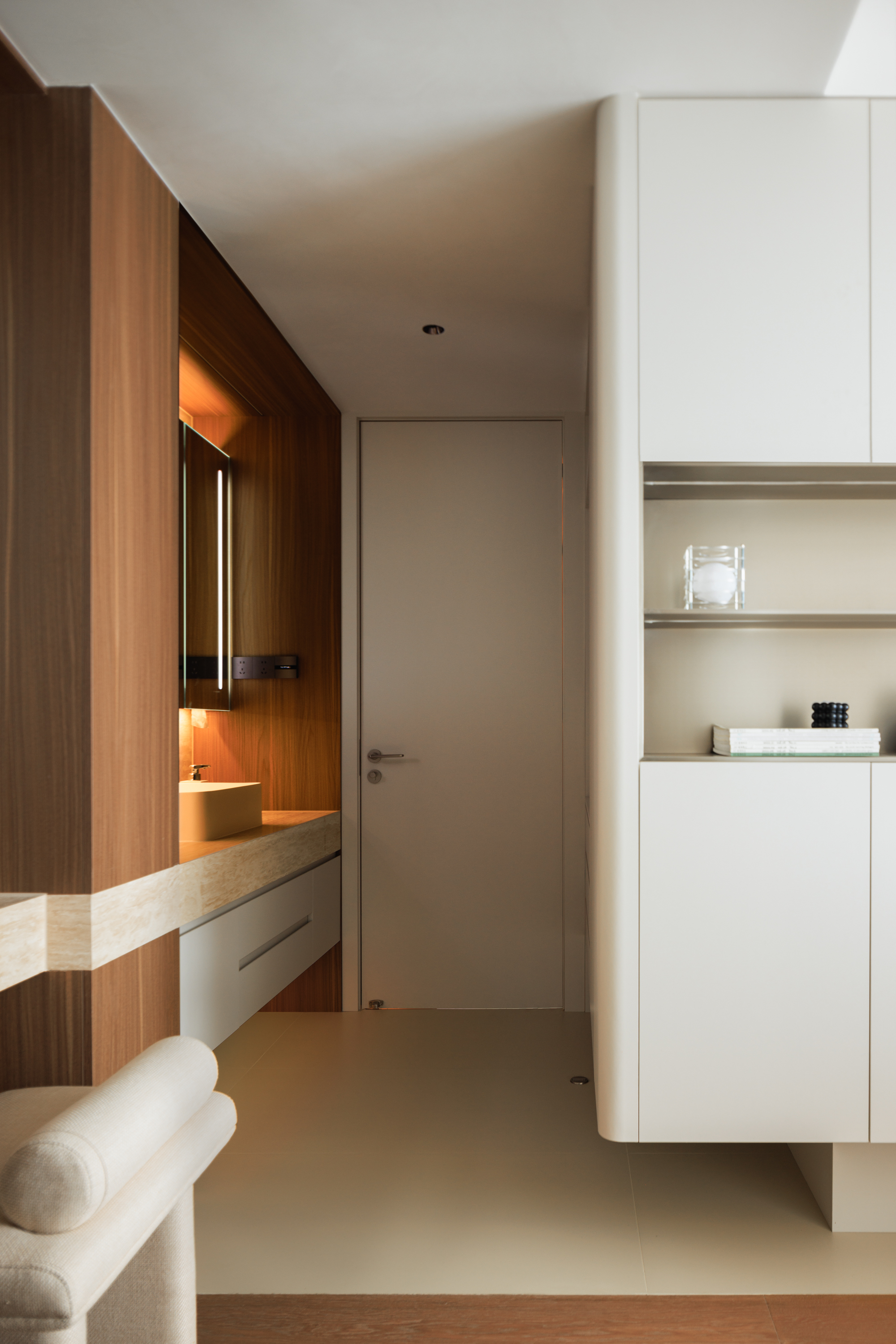 主卧的改造,是实实在在的幸福感。 再也不用担心洗完澡整个卫生间湿漉漉的。那个利用过道‘偷’来的梳妆台和整面衣柜,让清晨的匆忙变得从容。全屋温润的木色和微水泥墙面,让心很容易静下来;但几处不锈钢的线条和发光板,又在简洁中点了睛,不至于太过慵懒。
