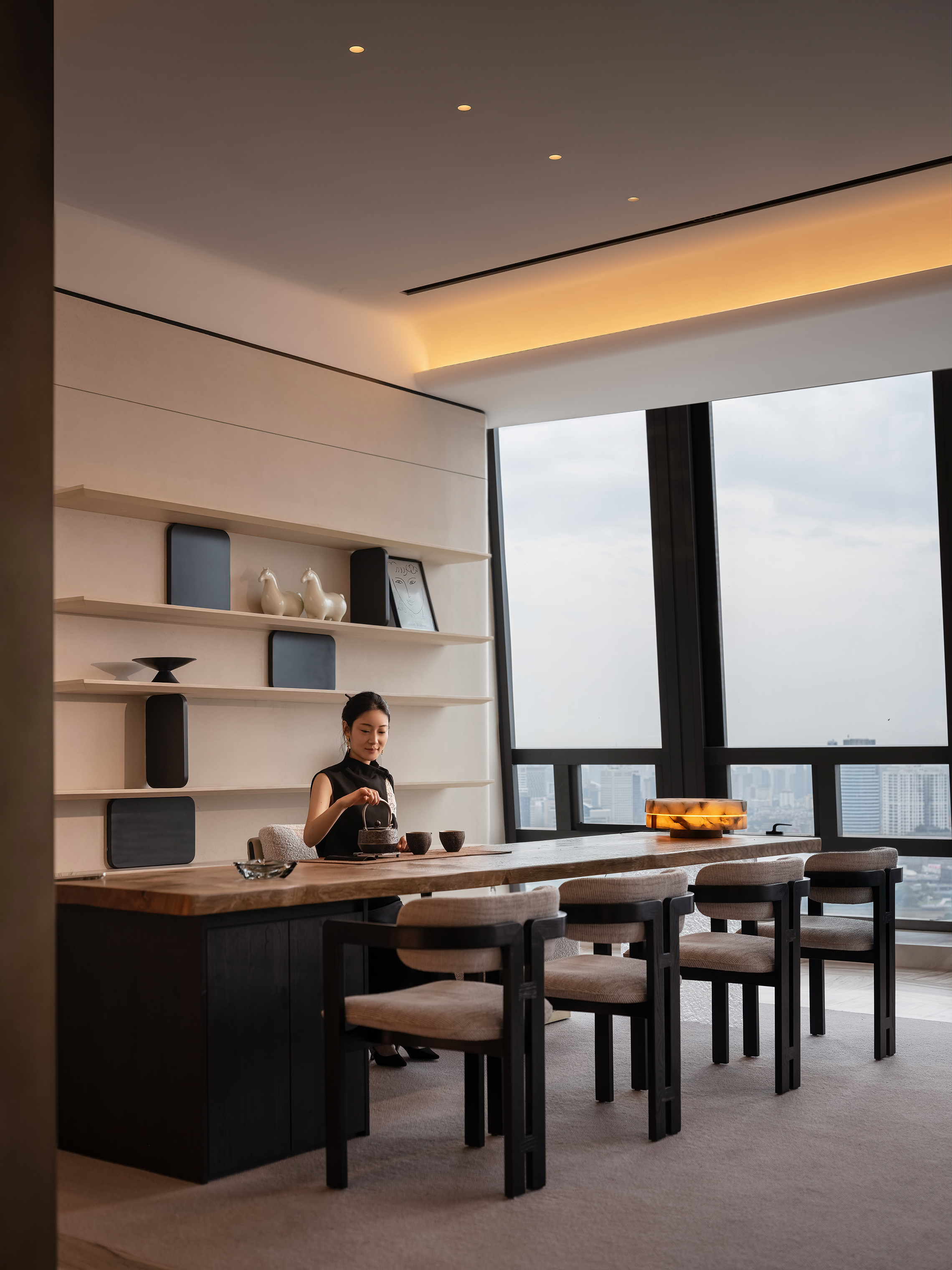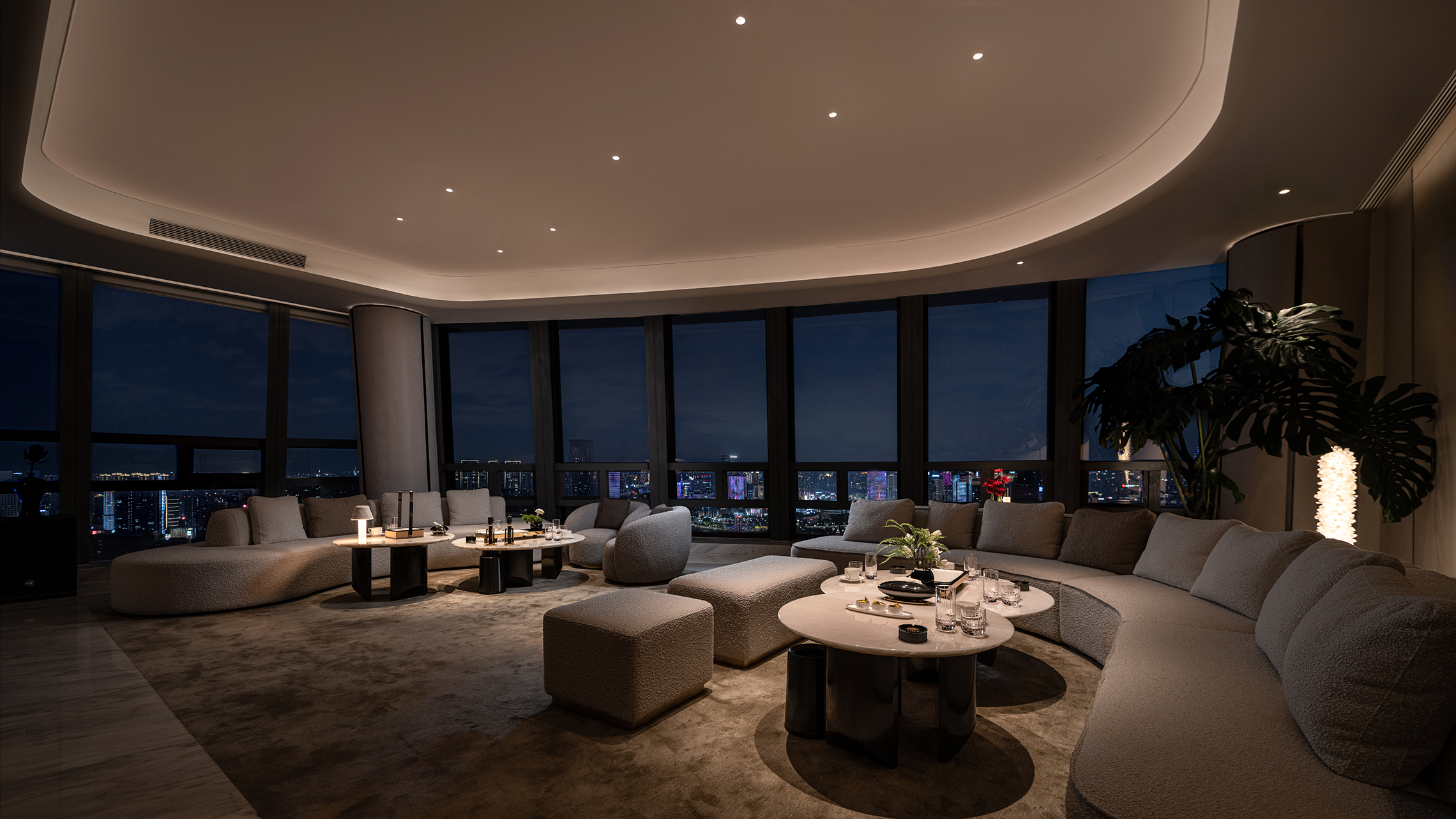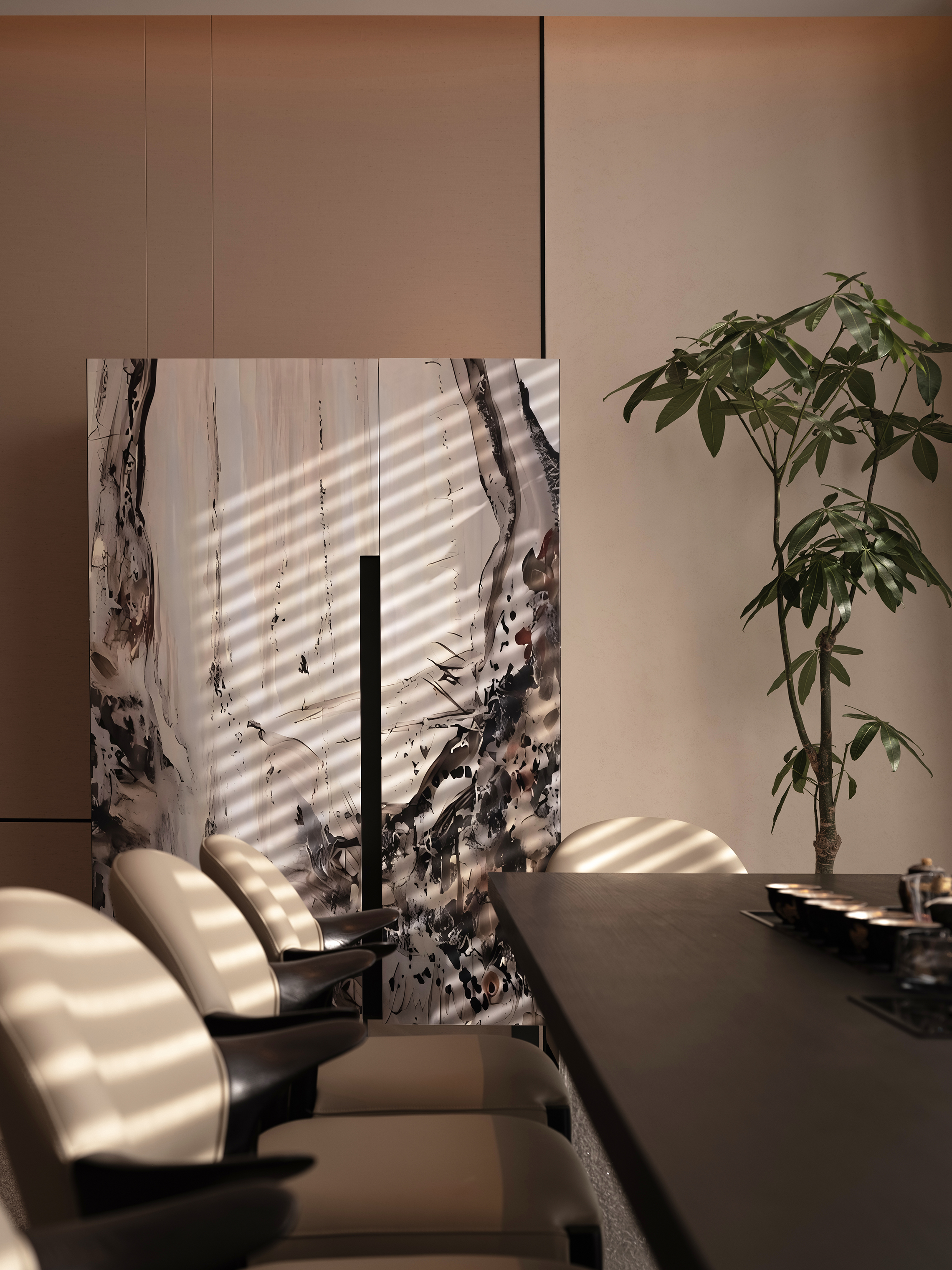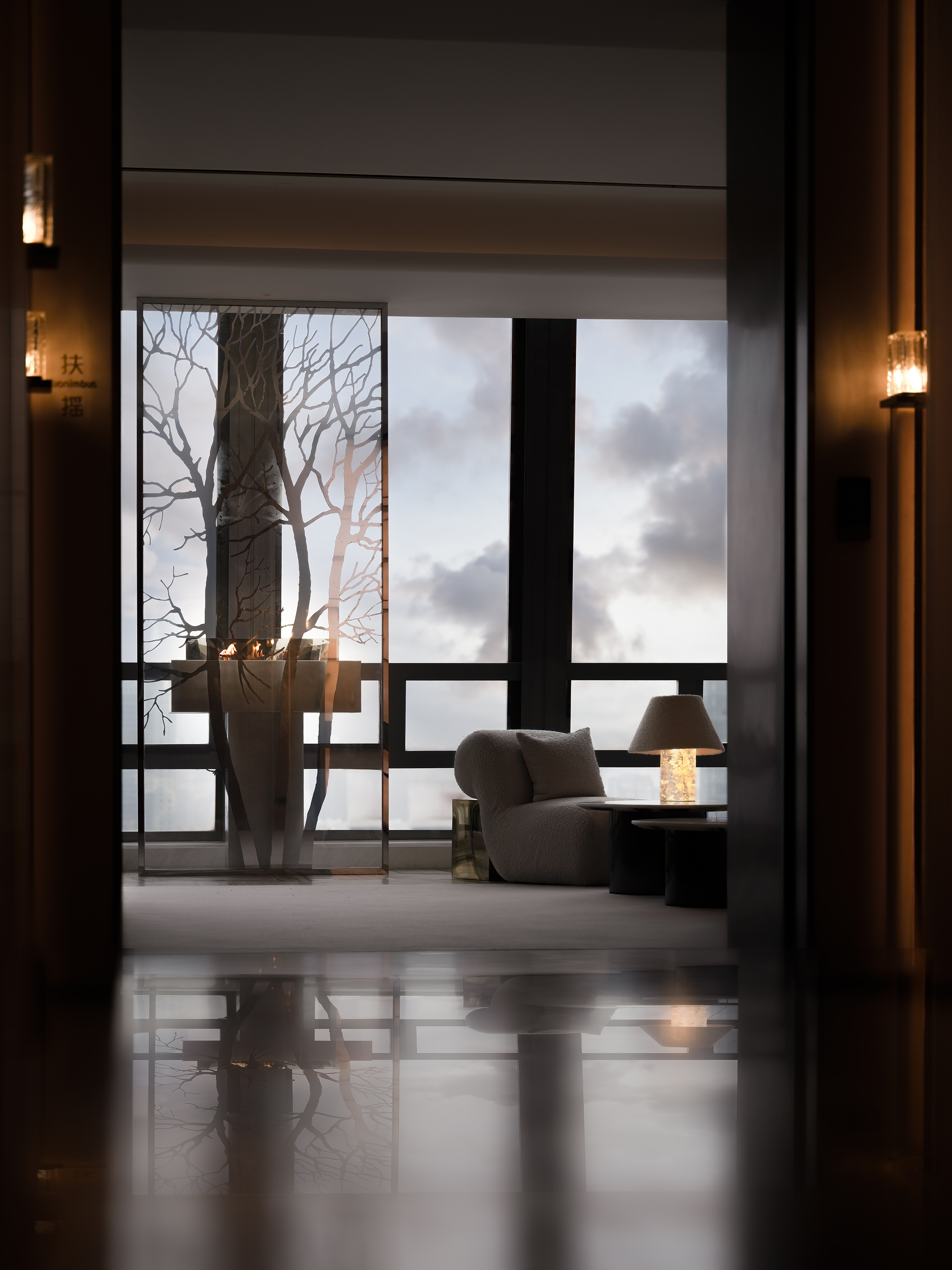 空间意境:大幅落地窗框起城市天际线,日间云卷云舒、暮色时灯火璀璨,天然成画。金属屏风以树枝轮廓为形,虚实之间划分空间,与嵌入式酒精壁炉的暖光呼应,羊羔绒沙发、原木茶台营造出松弛的品茗氛围——在这里,雪茄的醇厚与威士忌的悠长,都能在摩根声学场景的背景音乐里,化作圈层交流的注脚。包厢延续东方简雅格调,圆形餐桌暗含天圆地方哲思,摩根花灯以柔和光线勾勒空间轮廓。玻璃砖隔断让光影流动,定制香氛随双空气系统弥漫,宴请时,窗外城市景观与室内佳肴、音影娱乐系统交融,商务洽谈的严谨与私人聚会的松弛,皆能在此找到平衡。