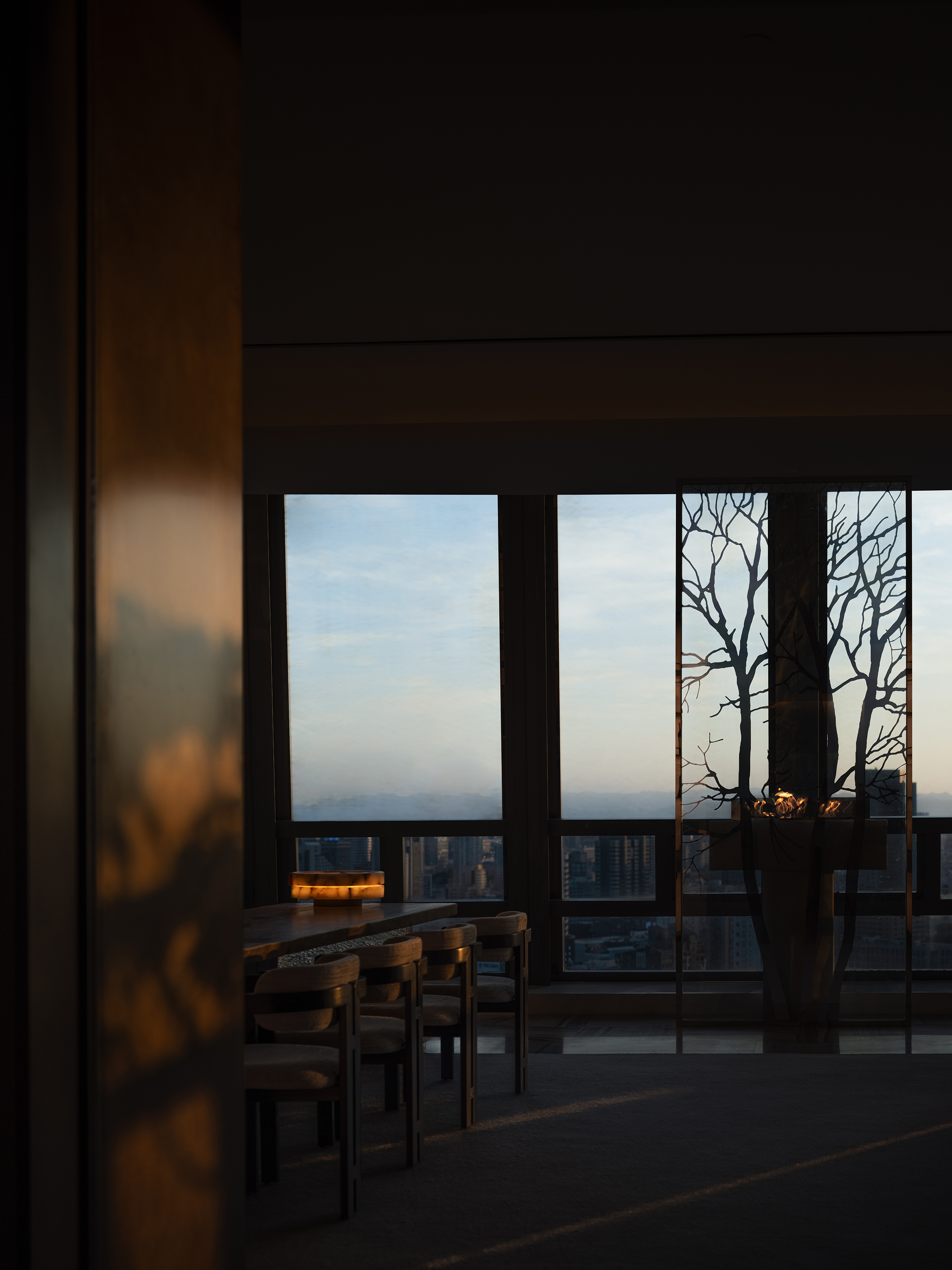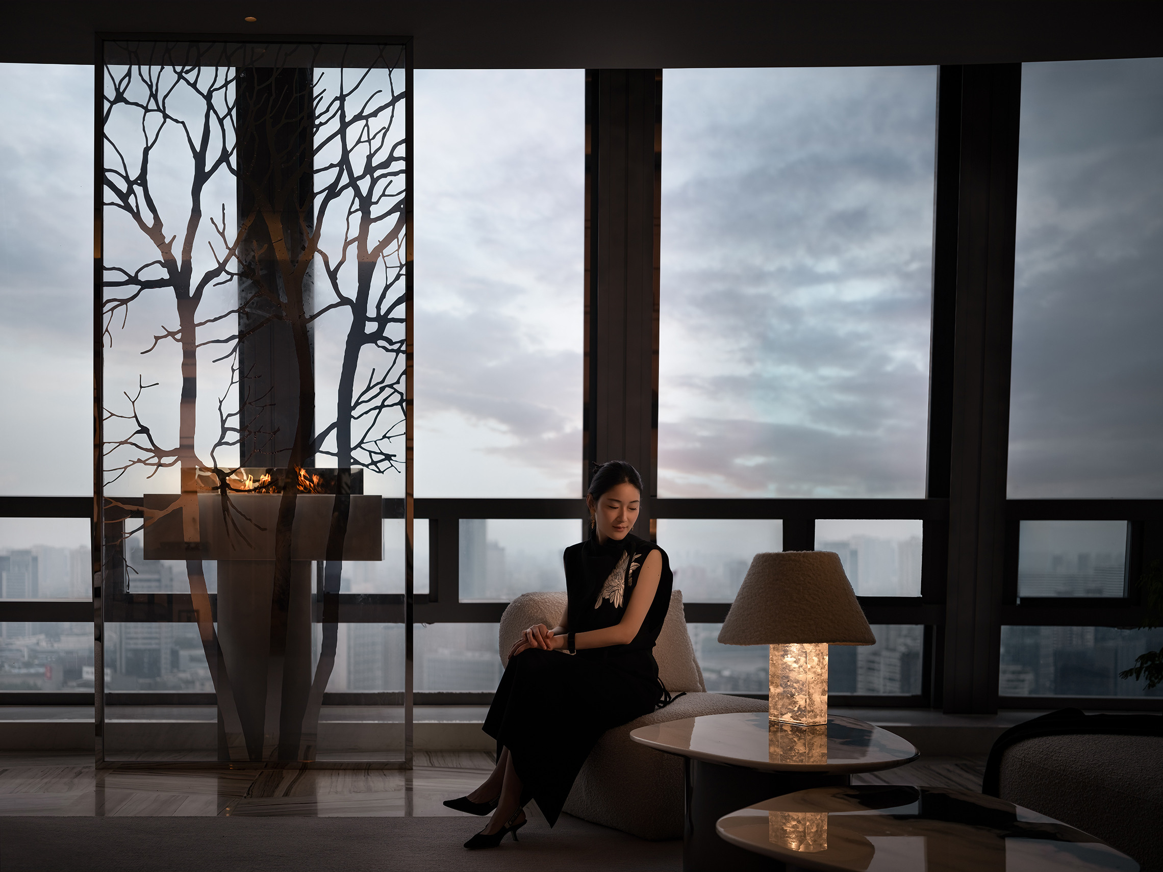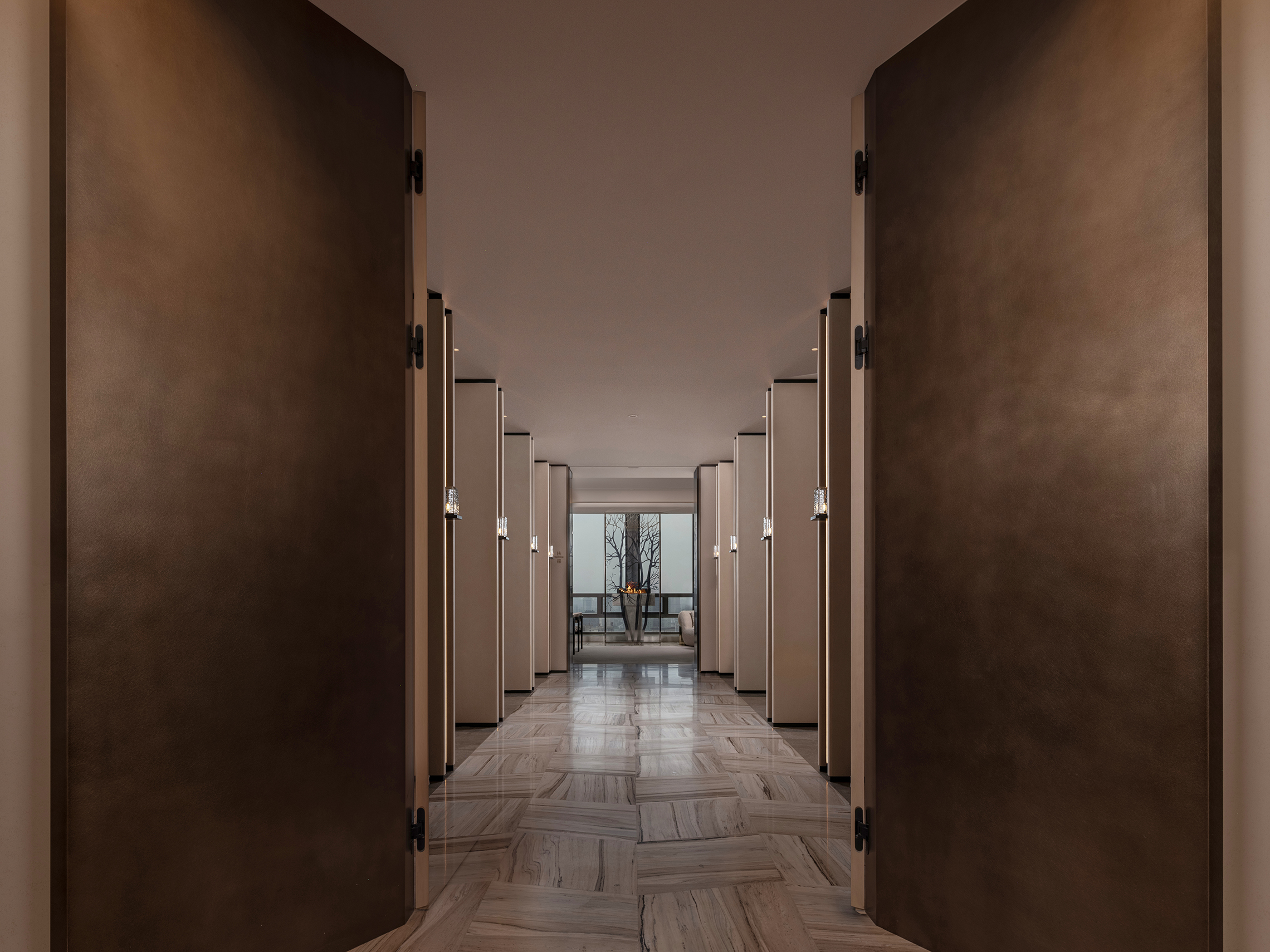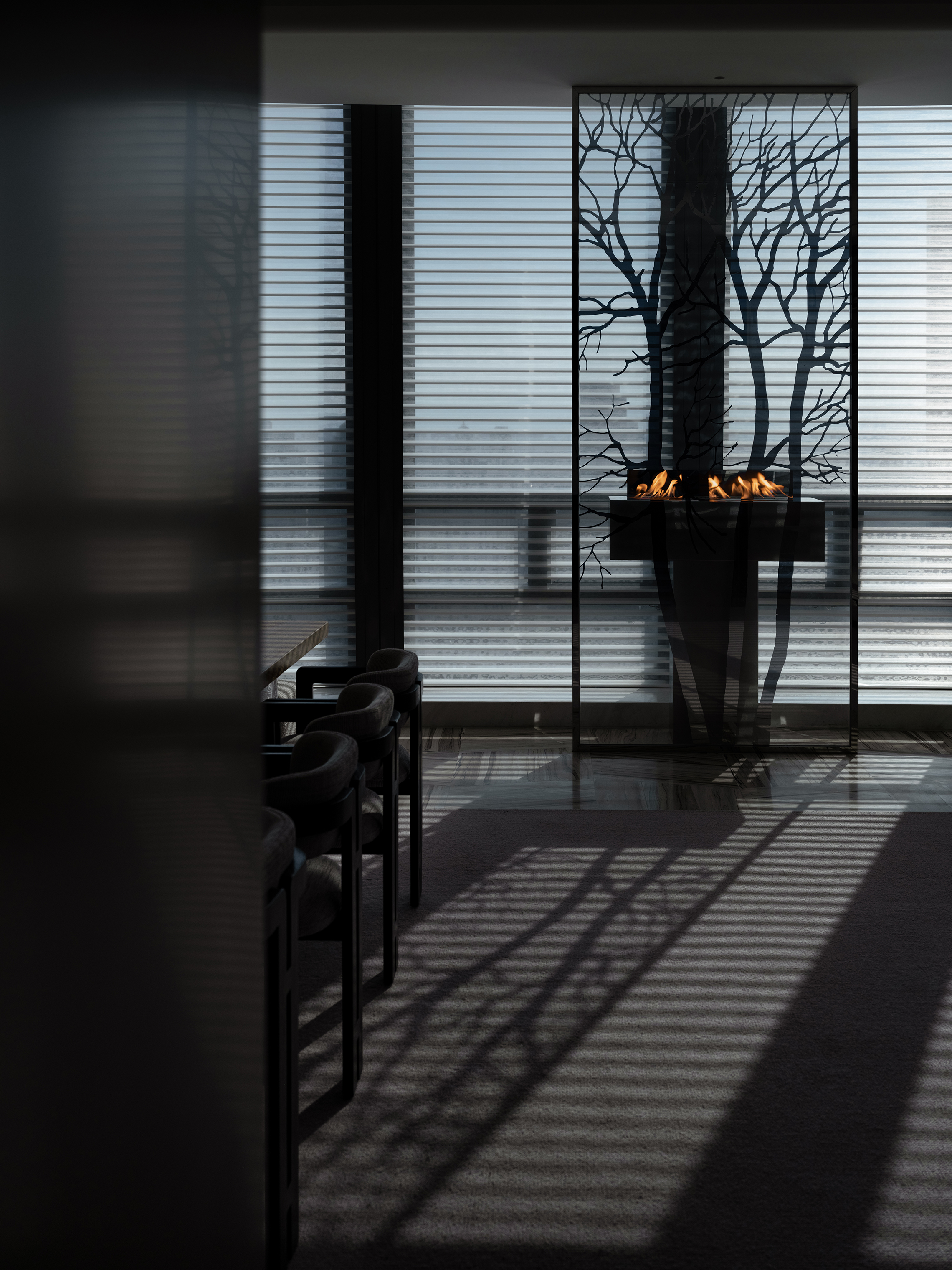 空间意境:大幅落地窗框起城市天际线,日间云卷云舒、暮色时灯火璀璨,天然成画。金属屏风以树枝轮廓为形,虚实之间划分空间,与嵌入式酒精壁炉的暖光呼应,羊羔绒沙发、原木茶台营造出松弛的品茗氛围——在这里,雪茄的醇厚与威士忌的悠长,都能在摩根声学场景的背景音乐里,化作圈层交流的注脚。包厢延续东方简雅格调,圆形餐桌暗含天圆地方哲思,摩根花灯以柔和光线勾勒空间轮廓。玻璃砖隔断让光影流动,定制香氛随双空气系统弥漫,宴请时,窗外城市景观与室内佳肴、音影娱乐系统交融,商务洽谈的严谨与私人聚会的松弛,皆能在此找到平衡。