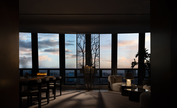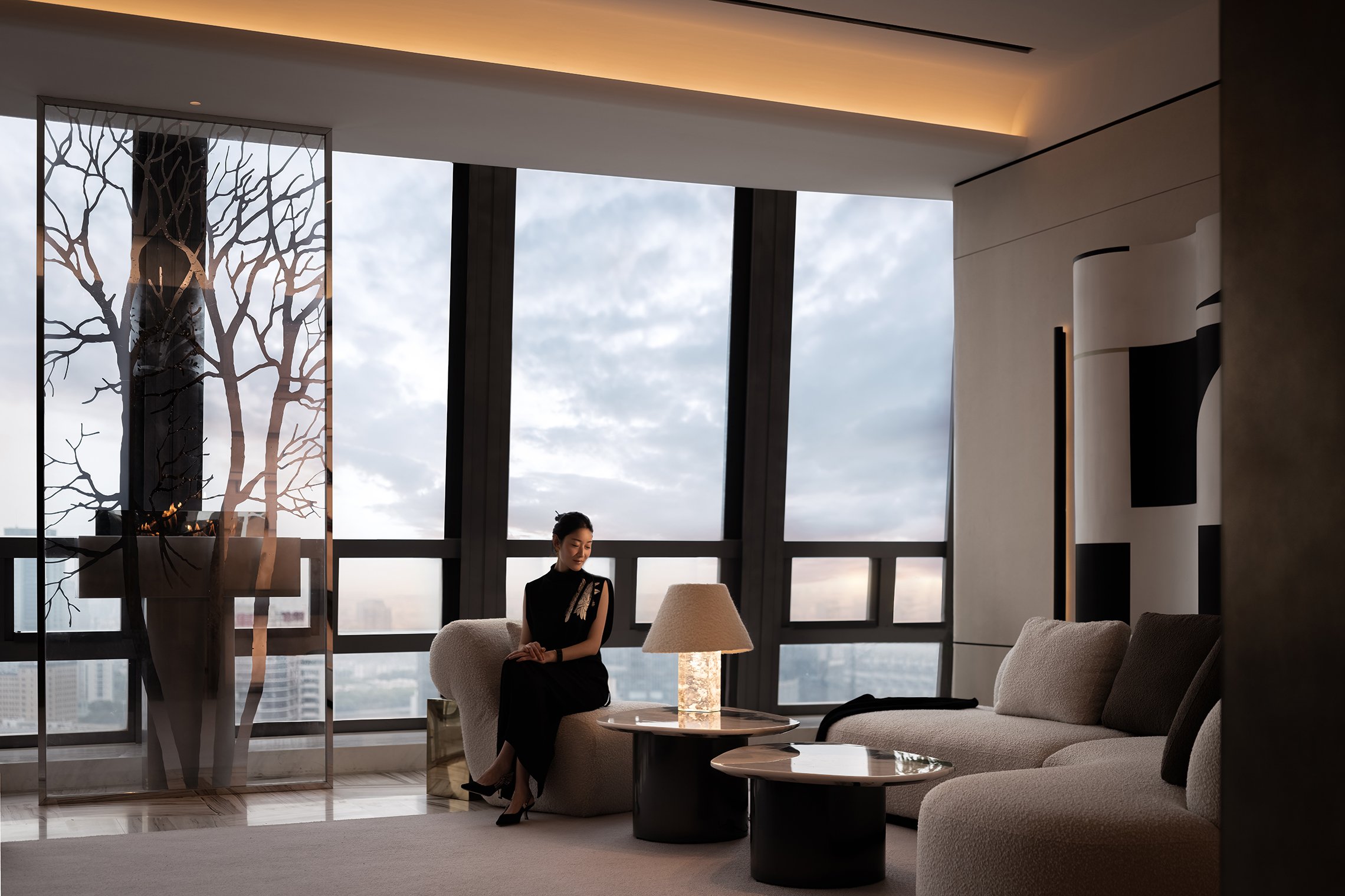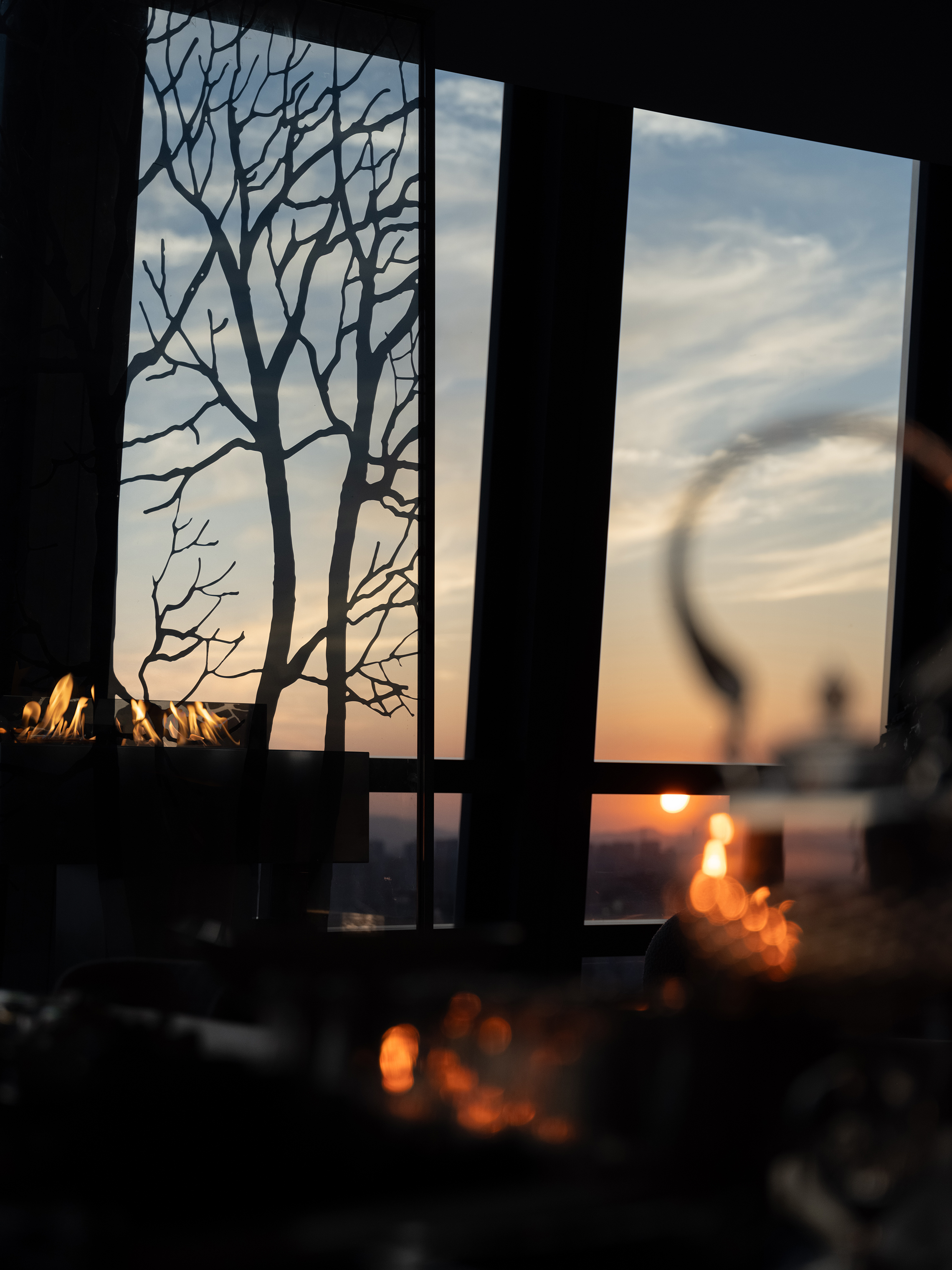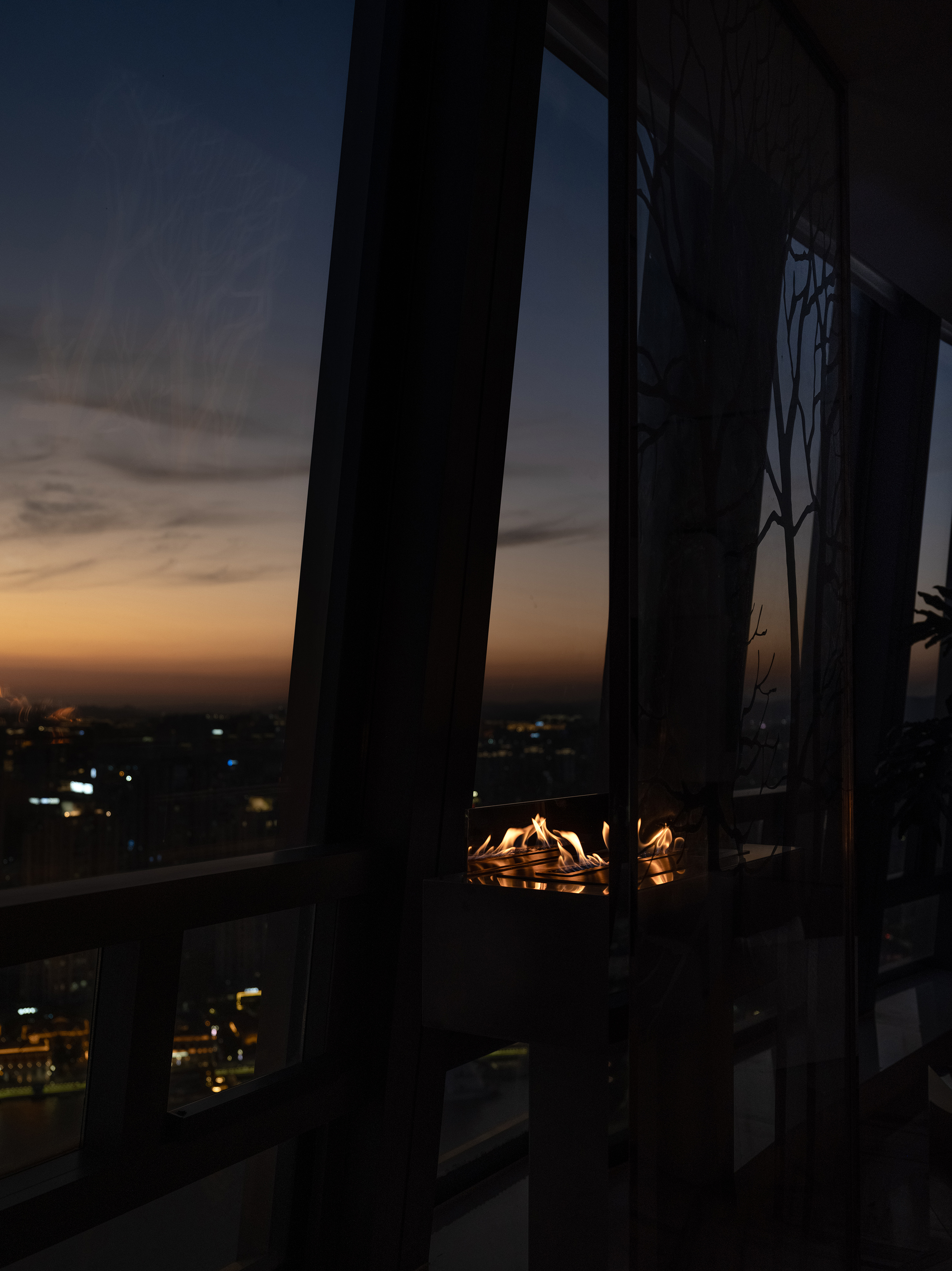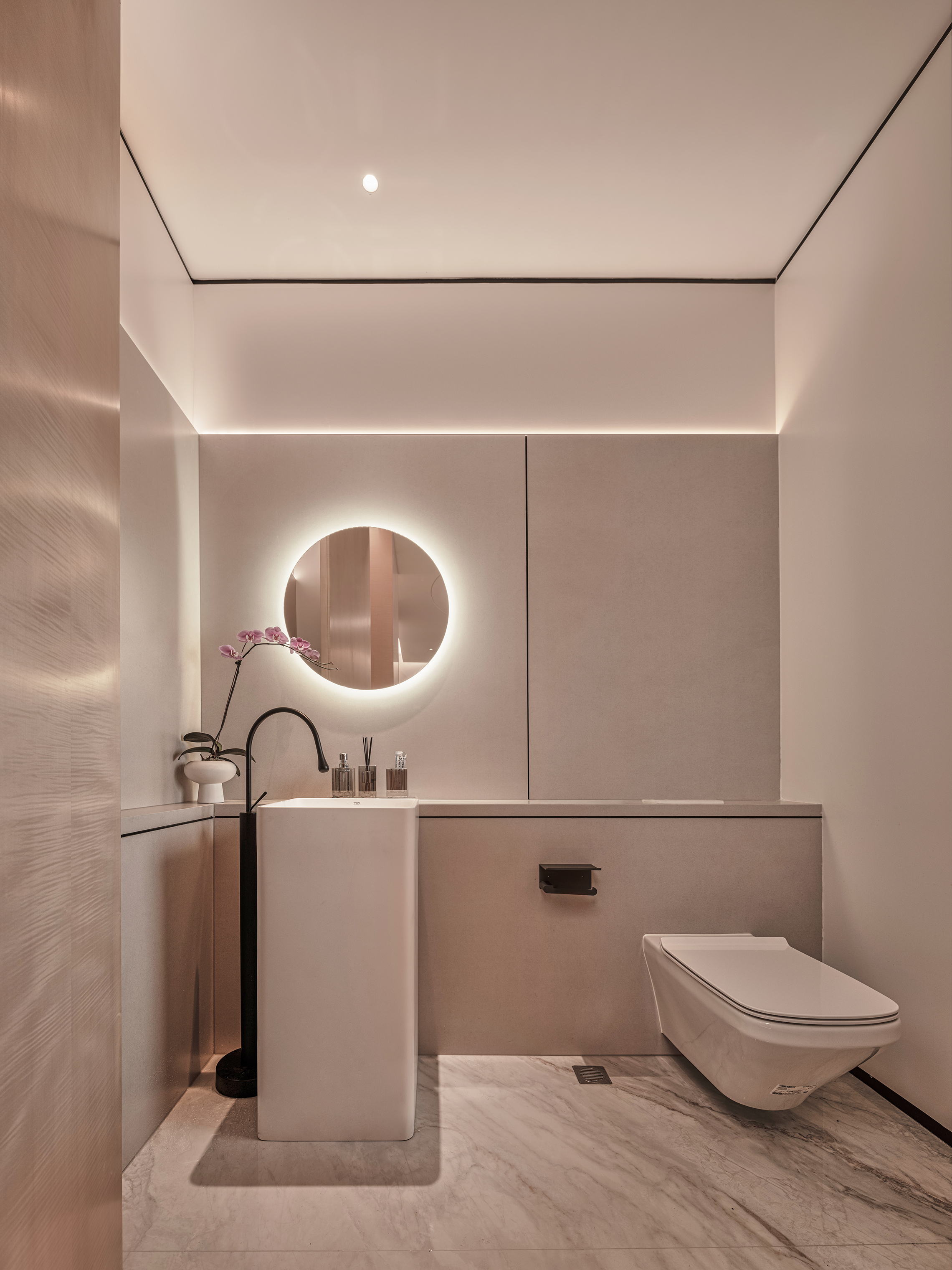 空间意境:大幅落地窗框起城市天际线,日间云卷云舒、暮色时灯火璀璨,天然成画。金属屏风以树枝轮廓为形,虚实之间划分空间,与嵌入式酒精壁炉的暖光呼应,羊羔绒沙发、原木茶台营造出松弛的品茗氛围——在这里,雪茄的醇厚与威士忌的悠长,都能在摩根声学场景的背景音乐里,化作圈层交流的注脚。包厢延续东方简雅格调,圆形餐桌暗含天圆地方哲思,摩根花灯以柔和光线勾勒空间轮廓。玻璃砖隔断让光影流动,定制香氛随双空气系统弥漫,宴请时,窗外城市景观与室内佳肴、音影娱乐系统交融,商务洽谈的严谨与私人聚会的松弛,皆能在此找到平衡。