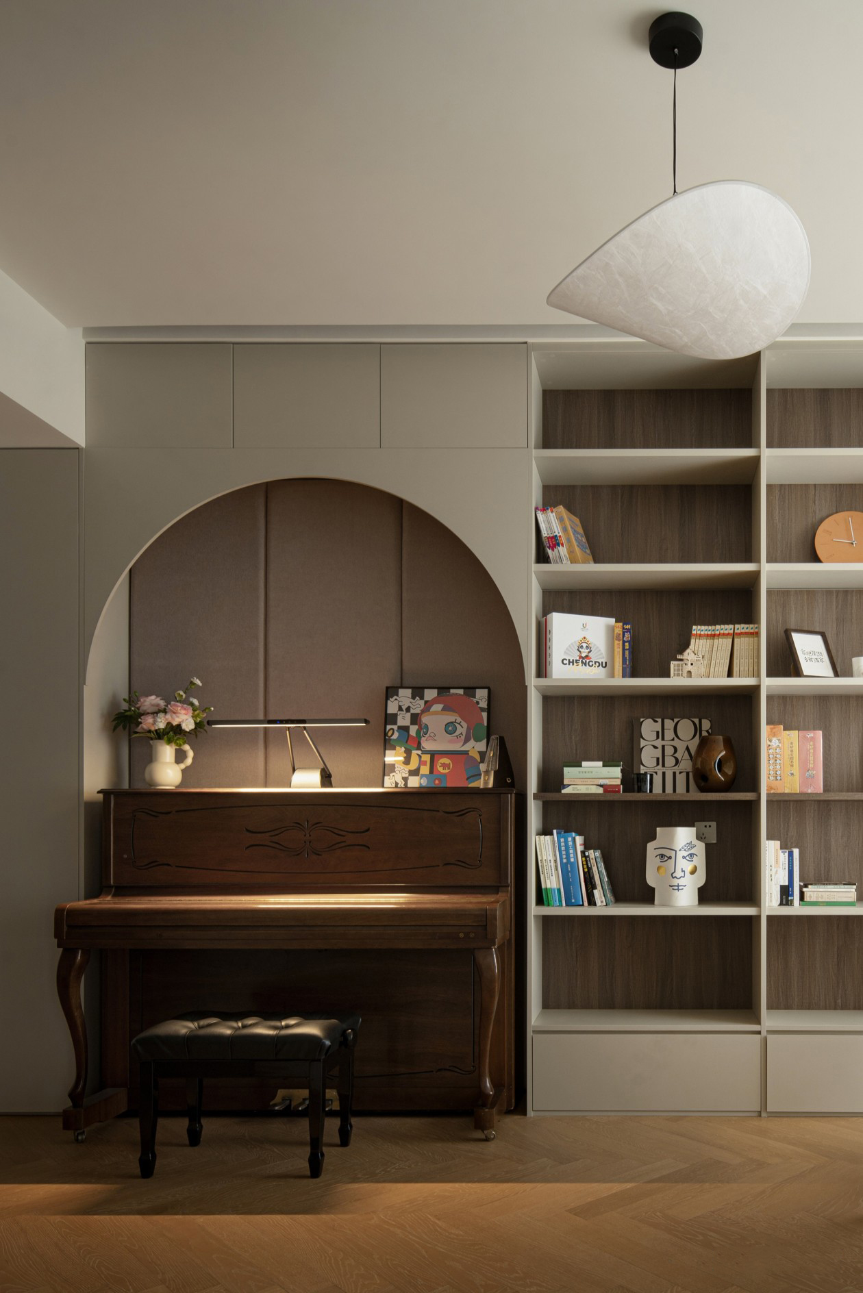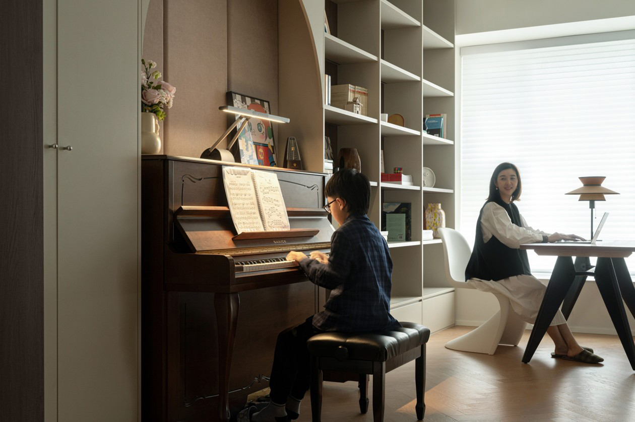 靠墙面设计一整排到顶书架,为未来书籍储物创造更多收纳空间。在孩子作业、练习钢琴时,父母便在一旁工作或是陪伴阅读,同个空间中,保持亲密陪伴又各自独立、互不打扰。